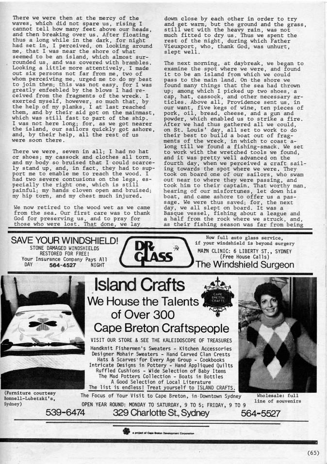 Published by Ronald Caplan on 1986/6/1 (381 reads)There we were then at the mercy of the waves, which did not spare us, rising I cannot tell how many feet above our heads, and then breaking over us. After floating thus a long while in the dark, for night had set in, I perceived, on looking around me, that I was near the shore of what seemed to be an island, which almost sur? rounded us, and was covered with brambles. Looking a little more attentively, I made out six persons not far from me, two of whom perceiving me, urged me to do my best to join them; this was not easy, for I was greatly enfeebled by the blows I had re? ceived from the fragments of the wreck. I exerted myself, however, so much that, by the help of my planks, I at last reached them, and by their aid got on the mainmast, which was still fast to part of the ship. I was not here long; for, as we got nearer the island, our sailors quickly got ashore, and, by their help, all the rest of us were soon there. There we were, seven in all; I had no hat or shoes; my cassock and clothes all tom, and my body so bruised that I could scarce? ly stand up, and, in fact, they had to sup? port me to enable me to reach the wood. I had two severe contusions on the legs, es? pecially the right one, which is still painful; my hands cloven open and bruised; my hip tom, and my chest much injured.. We now retired to the wood wet as we came from the sea. Our first care was to thank God for preserving us, and to pray for those who were lost. That done, we lay down close by each other in order to try and get warm, but the ground and the grass, still wet with the heavy rain, was not much fitted to dry us. Thus we spent the rest of the night, during which Father Vieuxport, who, thank God, was unhurt, slept well. The next morning, at daybreak, we began to examine the spot where we were, and found it to be an island from which we could pass to the main land. On the shore we found many things that the sea had thrown up; among which I picked up two shoes, a cap, hat, cassock, and other necessary ar? ticles. Above all, Providence sent us, in our want, five kegs of wine, ten pieces of pork, oil, bread, cheese, and a gun and powder, which enabled us to strike a fire. After we had thus gathered all we could, on St. Louis' day, all set to work to do their best to build a boat out of frag? ments of the wreck, in which to coast a- long till we found a fishing-smack. We set to work with the wretched tools we found, and it was pretty well advanced on the fourth day, when we perceived a craft sail? ing towards the spot where we were. They took on board one of our sailors, who swam out near to where they were passing, and took him to their captain. That worthy man, hearing of our misfortunes, let down his boat, and came ashore to offer us a pas? sage. We were thus saved; for, the next day, we all slept on board. It was a Basque vessel, fishing about a league and a half from the rock where we struck, and, as their fishing season was far from being SAVE YOUR WINDSHIELD! STONE DAMAGED WINDSHIELDS RESTORED FOR FREE! Your Insurance Company Pays All DAY 564-4527 NIGHT fW' Now full auto glass service, if ypur windshield is beyond surgery MAFN CLINIC: 6 LIBERTY ST., SYDNEY (Free House Calls) The Windshield Surgeon (Furniture courtesy Bonnell-Lubetzki's, Sydney) Island Crafts We House the Talents of Over 300 Cape Breton Craftspeople VISIT OUR STORE & SEE THE KALEIDOSCOPE OF TREASURES Handknit Fishermen's Sweaters - Kitchen Accessories Designer Mohair Sweaters - Hand Carved Clan Crests Hats & Scarves'for Every Age Group - Cookbooks Intricate Designs in Pottery - Hand Appliqued Quilts Ruffled Cushions - Wide Selection of Baby Items The Mad Potters Collection - Boats in Bottles A Good Selection of Local Literature The list is endlessl Treat yourself to ISLAND CRAFTS. The Focus of Your Visit to Cape Breton, in-Downtown Sydney OPEN YEAR ROUND: MONDAY TO SATURDAY, 9 TO 5; FRIDAY, 9 TO 9 Wholesale: full line of souvenirs 539-6474 329 Charlotte St, Sydney 564-5527 ? ? project of Capo Braton Oovotopmont Corporation (65)