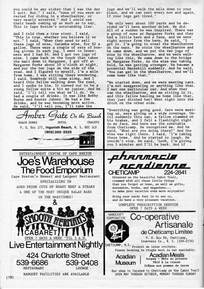 you could be any sicker than I was the day I quit. But," I said, "none of you were ar? rested for riding in a wheelbarrow, or very nearly arrested." And I could see their heads coming up as much as to say. This is Cape Breton's outstanding liar. And I told them a true story. I said, "This is true, whether you believe it or not." I said, "When they used to sell these jugs of wine, Catawba wine, for $2 a gallon. There were a couple of sets of box? ing gloves in each jug. I went to Inver? ness and I had $4. And I got two jugs of wine. I came back on the truck that takes the mail down to Margaree. I got off at Margaree Forks about 10 o'clock at night, and put the two jugs on the side of the road. And I figured to myself, I'm a mile from home. I was sitting there wondering. I said. Somebody will come along. And I heard this fellow walking down the road, and I spoke to him. It turned out to be a young fellow quite a bit my junior. And he said, 'I'll tell you what we'll do.' He had a couple of drinks. It was like Bobby Burns and Souter Johnny. We had a few drinks, and he was becoming more active. He said, 'I'll tell you, I'll take the cz'mlj'x 'at& On tL "B'cJt BEACH HOMES MOTEL CHALETS P. 0. Box 177, Ingonish Beach, N. S. BOC ILO (902)285-2525 jugs and we'll walk the mile down to your place, and we can rest every now and again, if your legs get tired.' "We only went about 100 yards and he de? cided we'll have another drink. We did. All of a sudden he was inspired. There was a group of nuns at Margaree Forks and they had a little barn and a farm, and we were right across from the barn. He said, 'I got it, I'm going to steal the wheelbarrow on the nuns.' He stole the wheelbarrow and he came down, and we put the two jugs of wine in the wheelbarrow, and we were walk? ing like this. We came down to the bridge at Margaree Forks. As the wine was taking hold, he was getting stronger. He became a potential MacAskill suddenly. And he said, 'You can get in the wheelbarrow, and we'll come home like that,' "We started down, and we were meeting cars. I'm not exaggerating or anything like that. I met one particular car. And when they saw the wheelbarrow, and me sitting in it, and this fellow hauling me home like that, they just ditched her! Went right into the ditch on the other side. "Everything was going good. Cars were meet? ing us, were giving us a wide coverage. Un? til suddenly this car, a fellow slammed on his brakes, and I felt a flashlight right in my face. And here was the constable from Cheticamp. He recognized me. And he said, 'What are you doing there?' And the wine was right there. I said, 'I'm taking these home.' And he started to laugh. He couldn't stop. He said, 'Look, I'm giving you 5 minutes and I'll be back. And if ENTERTAINMENT CENTRE OF CAPE BRETON Joe's Vferehouse The Food Emporium Cape Breton's Newest and Largest Restaurant SPECIALIZING IN AGED PRIME CUTS OF ROAST BEEF & STEAKS & ONE OF THE MOST UNIQUE SALAD BARS IN THE MARITIMES! CHETICAMP 224-2841 Situated on the beautiful Cabot Trail, crammed with all those little things that you forgot at home, as well as gifts, souvenirs, books, and magazines,,, to make your vacation even more enjoyable! Bring your sandy feet in to see us, and do have a very pleasant vacation. COMPLETE PRESCRIPTION SERVICE OPEN 7 DAYS A WEEK HANDCRAFT COOPERATIVE ICABARETi OPEN 7 DAYS A WEEK 'TIL 3 A.M. Live Entertainment Nightly 424 Charlotte street 539-6686 539-0408 • RESTAURANT LOUNGE BANQUET FACILITIES ARE AVAILABLE (78) Co-operative Artisanale de Cheticamp Limitee p. 0. Box 98, Cheticamp, Inverness Co., N. S. (224-2170) CHETICAMP, N.S. Produit de laine crochete. Finest hooking in virgin wool is our specialty, Acadian Meals Soupes - Mets au poisson Pate a la viande Crepes aux pommes de terre Our shop is located in Cheticamp on the Cabot Trail OPEN MAY THROUGH OCTOBER, MONDAY THROUGH SUNDAY Acadian Museum