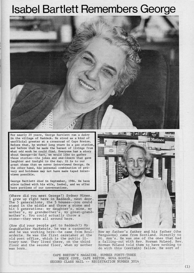 Published by Ronald Caplan on 1986/8/1 (700 reads)Isabel Bartlett Remembers George For nearly 20 years, George Bartlett ran a dairy in the village of Baddeck. He stood as a kind of unofficial greeter at a crossroad of Cape Breton. Before that, he worked long years in a gas station, and before that he made the barest of livings from what odd work he could find. Everyone has a story about George • in fact, we would like to gather those stories • the jokes and one-liners that gave laughter and insight to the day. It is to our great shame that we never interviewed George. On the other hand, his personal combination of pri? vacy and boldness may not have made taped inter? views possible. George Bartlett died in September, 1984. We have since talked with his wife, Isabel, and we offer here portions of our conversations. (Where did you meet George?) Sydney Mines. I grew up right here in Baddeck, next door. The 5 generations, the 5 houses--you could stand in the middle and throw a stone and hit 5 generations: my daughter's, mine, my mother's, my grandmother's, my great-grand? mother's. You could actually throw a stone--they were all around here. (How did your people get to Baddeck?) My Grandfather MacKenzie, he was a carpenter, and he was working here--he came from Boul? arderie. He was the first caretaker at.the old post office, which is the public li? brary now. They lived there, on the third floor and the second floor, when my mother was born. Now my father's father and his father (the Fergusons) came from Scotland. Directly to St. Ann's. He was one of the ones that had a falling-out with Rev. Norman McLeod. Rev. Norman McLeod told them to have nothing to do with this (certain) fellow. He sort of CAPE BRETON'S MAGAZINE, NUMBER FORTY-THREE WRECK COVE, CAPE BRETON, NOVA SCOTIA SECOND CLASS MAIL -- REGISTRATION NUMBER 3014 (1)