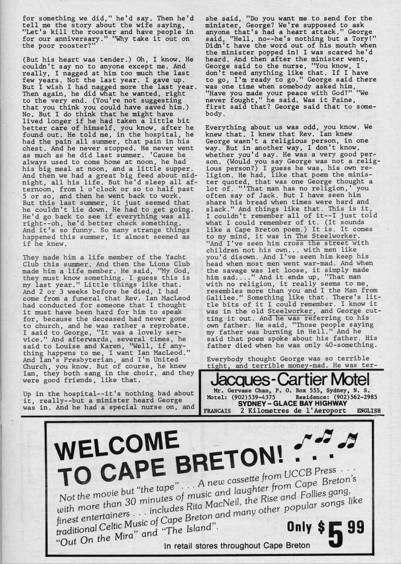 Published by Ronald Caplan on 1986/8/1 (343 reads)for something we did," he'd say. Then he'd tell me the story about the wife saying, "Let's kill the rooster and have people in for our anniversary." "Why take it out on the poor rooster?" (But his heart was tender.) Oh, I know. He couldn't say no to anyone except me. And really, I nagged at him too much the last few years. Not the last year. I gave up. But I wish I had nagged more the last year. Then again, he did what he wanted, right to the very end. (You're not suggesting that you think you could have saved him.) No. But I do think that he might have lived longer if he had taken a little bit better care of himself, you know, after he found out. He told me, in the hospital, he had the pain all summer, that pain in his chest. And he never stopped. He never went as much as he did last summer. 'Cause he always used to come home at noon, he had his big meal at noon, and a little supper. And then we had a great big feed about mid? night, all his life. But he'd sleep all af? ternoon, from 1 o'clock or so to half past 5 or so, and then he went back to work. But this last summer, it just seemed that he couldn't lie down. He had to get going. He'd go back to see if everything was all right--oh, he'd better check something. And it's so funny. So many strange things happened this summer, it almost seemed as if he knew. They made him a life member of the Yacht Club this summer. And then the Lions Club made him a life member. He said, "My God, they must know something. I guess this is my last year." Little things like that. And 2 or 3 weeks before he died, I had come from a funeral that Rev. Ian MacLeod had conducted for someone that I thought it must have been hard for him to speak for, because the deceased had never gone to church, and he was rather a reprobate. I said to George, "It was a lovely ser? vice." And afterwards, several times, he said to Louise and Karen, "Well, if any? thing happens to me, I want Ian MacLeod." And lan's Presbyterian, and I'm United Church, you know. But of course, he knew Ian, they both sang in the choir, and they were good friends, like that. Up in the hospital--it's nothing bad about it, really--but a minister heard George was in. And he had a special nurse on, and she said, "Do you want me to send for the minister, George? We're supposed to ask anyone that's had a heart attack." George said, "Hell, no--he's nothing but a Tory!" Didn't have the word out of his mouth when the minister popped in! I was scared he'd heard?? And then after the minister went, George said to the nurse, "You know, I don't need anything like that. If I have to go, I'm ready to go." George said there was one time when somebody asked him, "Have you made your peace with God?" "We never fought," he said. Was it Paine, first said that? George said that to some? body. Everything about us was odd, you know. We knew that. I knew that Rev. Ian knew George wasn't a religious person, in one way. But in another way, I don't know, whether you'd say. He was a very good per? son. (Would you say George was not a relig? ious person?) I guess he was, his own re? ligion. He had, like that poem the minis? ter quoted, that was one George thought a lot of, '"That man has no religion,' you often say of Jack, But I have seen him share his bread when times were hard and slack." And things like that. This is it, I couldn't remember all of it--I just told what I could remember of it, (It sounds like a Cape Breton poem,) It is. It comes to my mind, it was in The Steelworker. "And I've seen him cross the street with children not his own.., with men like you'd disown. And I've seen him keep his head when most men went war-mad. And when the savage was let loose, it simply made him sad.,,." And it ends up, "That man with no religion, it really seems to me, resembles more than you and I the Man from Galilee." Something like that. There's lit? tle bits of it I could remember, I know it was in the old Steelworker, and George cut? ting it out, And he was referring to his own father. He said, "Those people saying my father was burning in Hell." And he said that poem spoke about his father. His father died when he was only 40-something. Everybody thought George was so terrible tight, and terrible money-mad. He was ter- Jacques-Cartier Motel Mr. Gervase Chan, P. 0. Box 555, Sydney, N. S. Motel: (902)539-4375 Residence: (902)562-2985 SYDNEY- GLACE BAY HIGHWAY FRANCAIS 2 Kilometres de I'Aeroport English , And he had a special nurse onT and L • ,,,,,,, bYUNtY - ULAOt BAY nil-nwAY ' I FRANCAIS 2 Kilometres de I'Aeroport B , .. • . • • . hut "the tape • ? t_.ri auQhter from Cape o VJ V/?-'" ' • A new cassette from UCCB Press''',' Not the movie but "the''P'''' J,,, ..d rf;'R;f • ';d Follies gang ' In retail stores throughout Cape Breton %#