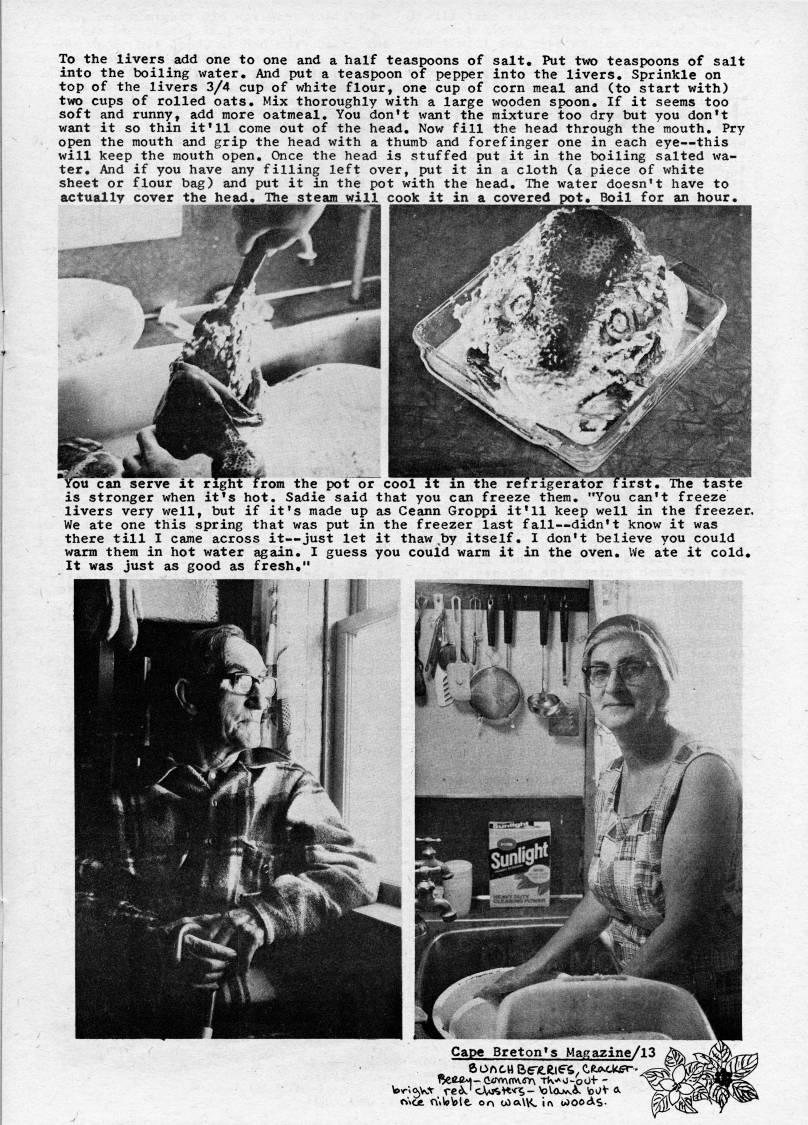 Published by Ronald Caplan on 1974/6/1 (764 reads)To the livers add one to one and a half teaspoons of salt. Put two teaspoons of salt into the boiling water. And put a teaspoon of pepper into the livers. Sprinkle on top of the livers 3/4 cup of white flour, one cup of corn meal and (to start with) two cups of rolled oats. Mix thoroughly with a large wooden spoon. If it seems too soft and runny, add more oatmeal. You don't want the mixture too dry but you don't want it so thin it'll come out of the head. Now fill the head through the mouth. Pry open the mouth and grip the head with a thumb and forefinger one in each eye • this will keep the mouth open. Once the head is stuffed put it in the boiling salted wa? ter. And if you have any filling left over, put it in a cloth (a piece of white sheet or flour bag) and put it in the pot with the head. The water doesn't have to actually cover the head. The steam will cook it in a covered pot. Boilfor an hour. YoiTc'an serve it right from the pot or cool it in the refrigerator first. The taste is stronger when it's hot. Sadie said that you can freeze them. "You can't freeze livers very well, but if it's made up as Ceann Groppi it'll keep well in the freezer. We ate one this spring that was put in the freezer last fall • didn't know it was there till I came across it • 'just let it thaw .by itself. I don't believe you could warm them in hot water again. I guess you could warm it in the oven. We ate it cold. It was just as good as fresh," HIti '9 ?? ''' ??r''Rii; ''IK'H. '''''''H'V''' 'HB / - ??'''''''H i 'pv'H' ' 1' 'cm '% ' i J 'Wm f% : 1' 4 ' ? i f jhF ''BMiiite>t'' '''''''%. HJ''KS''''' 1 i Cape Breton's Magazine/13 6 OACH Bexeies, Cfc