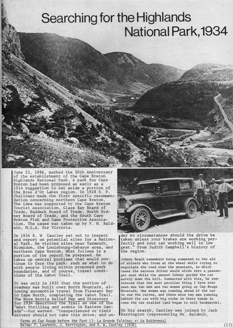 Searching for the Highlands National Park,1934 June 23, 1986, marked the 50th Anniversary of the establishment of the Cape Breton Highlands National Park. A park for Cape Breton had been proposed as early as a 1914 suggestion to set aside a portion of the Bras d'Or Lakes region. In 1928 S. P. Challoner made the first specific recommen? dation concerning northern Cape Breton. The idea was supported by the Cape Breton Tourist Association, Glace Bay Board of Trade, Baddeck Board of Trade, North Syd? ney Board of Trade, and the South Cape Breton Fish and Game Protective Associa? tion. The cause was taken up by F. W. Bald? win, M.L.A. for Victoria. In 1934 R. Wo Cautley set out to inspect and report on potential sites for a Nation? al Park. H-e visited sites near Yarmouth, Blomidon, the Louisbourg-Gabarus area, and northern Cape Breton. What follows is a portion of the report he prepared. He takes up central problems that would con? tinue to face the park: such as what to do with people living within proposed park boundaries, and of course, travel condi? tions of the Cabot Trail. It was only in 1932 that the portion of roadway was built over North Mountain, al? lowing automobile travel from Pleasant Bay to Cape North, completing the Cabot Trail. The Nova Scotia Relief Map and Directory for 1934 described the Trail as one of the "most thrilling and scenic in Eastern Can? ada"- -but warned: "inexperienced or timid drivers should not take this drive; and un? der no circumstances should the drive be taken unless your brakes are working per? fectly and your car working well in low gear." From Judith Campbell's history of the region: Johnny Roach remembers being stunmoned to the aid of drivers who froze at the wheel while trying to negotiate the road over the mountain, in which cases the nervous driver would slide into a passen? ger seat while the amused Johnny guided the car safely down the hill. Connected with this, he rem? inisces that the most peculiar thing I have ever seen was two men and two women going up Cap Rouge Mountain. One woman was running ahead of the car to see the curves, and there were two men running behind the car with big rocks in their hands in case the car stalled (and began to roll backwards). On his search, Cautley was joined by Jack Barrington (representing Mr. Baldwin, Farms at Cap Rouge before the Park (1: La Grande Falaise; r: Le Buttereau) Below: F. Laurence, J. Barrington, and R. W. Cautley (1934) (17)