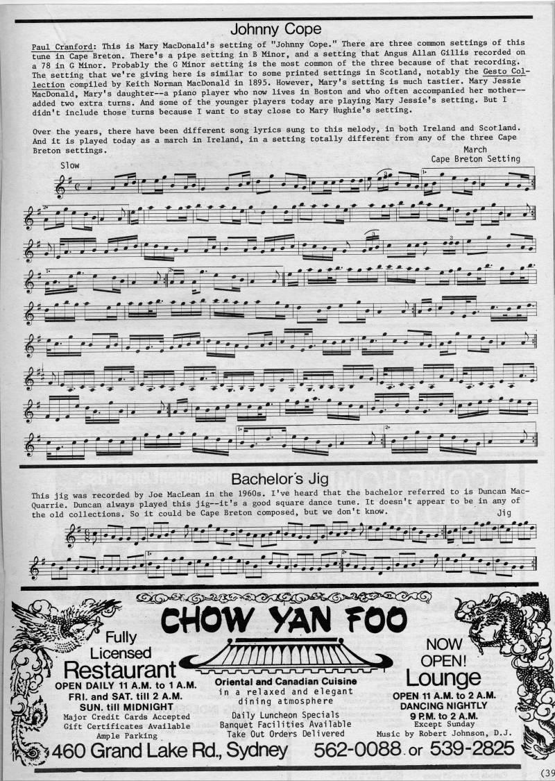 Published by Ronald Caplan on 1986/8/1 (333 reads)Johnny Cope Paul Cranford; This is Mary MacDonald's setting of "Johnny Cope." There are three common settings of this tune in Cape Breton. There's a pipe setting in B Minor, and a setting that Angus Allan Gillis recorded on a 78 in G Minor. Probably the G Minor setting is the most common of the three because of that recording. The setting that we're giving here is similar to some printed settings in Scotland, notably the Gesto Col? lection compiled by Keith Norman MacDonald in 1895. However, Mary's setting is much tastier. Mary Jessie MacDonald, Mary's daughter • a piano player who now lives in Boston and who often accompanied her mother • added two extra turns. And some of the younger players today are playing Mary Jessie's setting. But I didn't include those turns because I want to stay close to Mary Hughie's setting. Over the years, there have been different song lyrics sung to this melody, in both Ireland and Scotland. And it is played today as a march in Ireland, in a setting totally different from any of the three Cape Breton settings. March Slow ''P' Breton Setting '''''' • ''"z'-''* ' • ''4.'''' #''.'*'' ' • ' • '' • * Bachelor's Jig This jig was recorded by Joe MacLean in the 1960s. I've heard that the bachelor referred to is Duncan Mac? Quarrie. Duncan always played this jig • it's a good square dance tune. It doesn't appear to be in any of the old collections. So it could be Cape Breton composed, but we don't know. CtiOWVAIM f 00 """'""""'''"'"'''"""'""' Lounge Fully Licensed Restaurant OPEN DAILY 11 A.M. to 1 A.M. FRI. and SAT. till 2 A.M. SUN. till MIDNIGHT Major Credit Cards Accepted Gift Certificates Available Ample Parking Oriental and Canadian Cuisine in a relaxed and elegant dining atmosphere Daily Luncheon Specials Banquet Facilities Available Take Out Orders Delivered OPEN 11 A.M. to 2 A.M. DANCING NIGHTLY 9 RM. to 2 A.M. Except Sunday Music by Robert Johnson, D.J |'>460 Grand Lake Rd, Sydney 562-0088.or 539-2825 (39