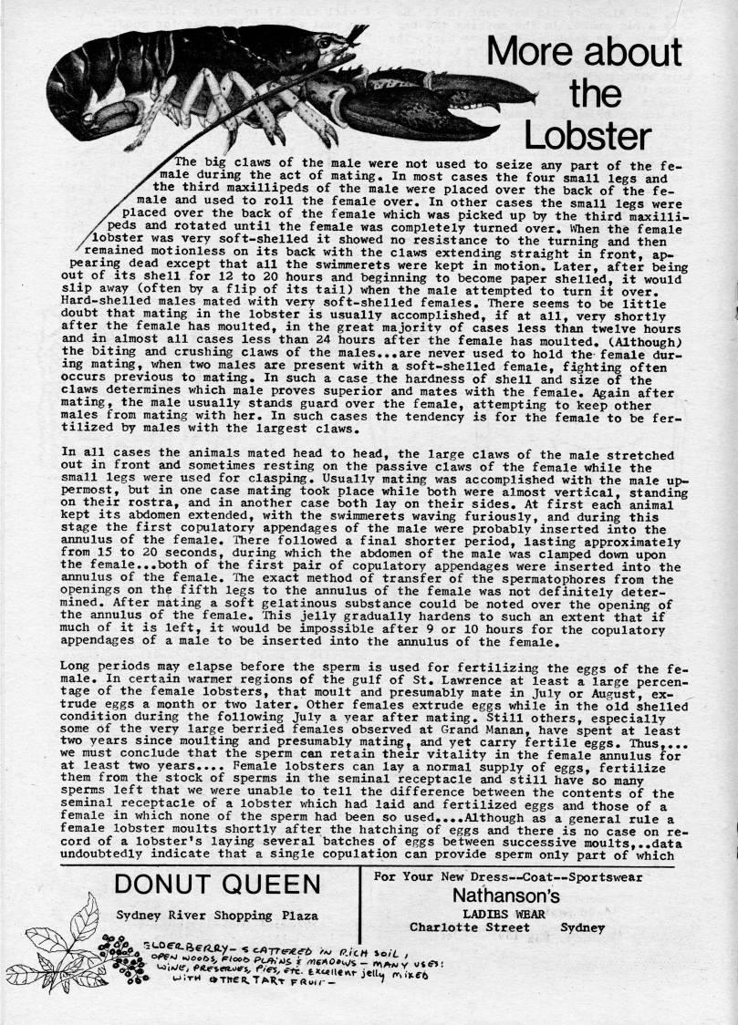 Published by Ronald Caplan on 1974/6/1 (4544 reads)''1 More about ,.'_' the ''f''i'' Lobster ''e big claws of the male were not used to seize any part of the fe- 'male during the act of mating. In most cases the four small legs and the third maxillipeds of the male were placed over the back of the fe? male and used to roll the female over. In other cases the small legs were placed over the back of the female which was picked up by the third maxilli- ''peds and rotated until the female was completely turned over. When the female /lobster was very soft-shelled it showed no resistance to the turning and then 'remained motionless on its back with the claws extending straight in front, ap? pearing dead except that all the swimraerets were kept in motion. Later, after being out of its shell for 12 to 20 hours and beginning to become paper shelled, it would slip away (often by a flip of its tail) when the male attempted to turn it over. Hard-shelled males mated with very soft-shelled females. There seems to be little doubt that mating in the lobster is usually accomplished, if at all, very shortly after the female has moulted, in the great majority of cases less than twelve hours and in almost all cases less than 24 hours after the female has moulted. (Although) the biting and crushing claws of the males...are never used to hold the female dur? ing mating, when two males are present with a soft-shelled female, fighting often occurs previous to mating. In such a case the hardness of shell and size of the claws determines which male proves superior and mates with the female. Again after mating, the male usually stands guard over the female, attempting to keep other males from mating with her. In such cases the tendency is for the female to be fer? tilized by males with the largest claws. In all cases the animals mated head to head, the large claws of the male stretched out in front and sometimes resting on the passive claws of the female while the small legs were used for clasping. Usually mating was accomplished with the male up? permost, but in one case mating took place while both were almost vertical, standing on their rostra, and in another case both lay on their sides. At first each animal kept its abdomen extended, with the swimmerets waving furiously, and during this stage the first copulatory appendages of the male were probably inserted into the annulus of the female. There followed a final shorter period, lasting approximately from 15 to 20 seconds, during which the abdomen of the male was clamped down upon the female.,,both of the first pair of copulatory appendages were inserted into the annulus of the female. The exact method of transfer of the spermatophores from the openings on the fifth legs to the annulus of the female was not definitely deter? mined. After mating a soft gelatinous substance could be noted over the opening of the annulus of the female. This jelly gradually hardens to such an extent that if much of it is left, it would be impossible after 9 or 10 hours for the copulatory appendages of a male to be inserted into the annulus of the female. Long periods may elapse before the sperm is used for fertilizing the eggs of the fe? male. In certain warmer regions of the gulf of St, Lawrence at least a large percen? tage of the female lobsters, that moult and presumably mate in July or August, ex? trude eggs a month or t vo later. Other females extrude eggs while in the old shelled condition during the following July a year after mating. Still others, especially some of the very large berried females observed at Grand Manan, have spent at least two years since moulting and presumably matingj and yet carry fertile eggs. Thus,,., we must conclude that the sperm can retain their vitality in the female annulus for at least two years.... Female lobsters can lay a normal supply of eggs, fertilize them from the stock of sperms in the seminal receptacle and still have so many sperms left that we were unable to tell the difference between the contents of the seminal receptacle of a lobster which had laid and fertilized eggs and those of a female in which none of the sperm had been so used, • • ,Although as a general rule a female lobster moults shortly after the hatching of eggs and there is no case on re? cord of a lobster's laying several batches of eggs between successive moults,.,data undoubtedly indicate that a single copulation can provide sperm only part of which DONUT QUEEN Sydney River Shopping Plaza For Your New Dress • Coat • Sportswear Nathanson's LADIES MBAR Charlotte Street Sydney 'xx A • Ttte??, TaRt Fftu.r - '