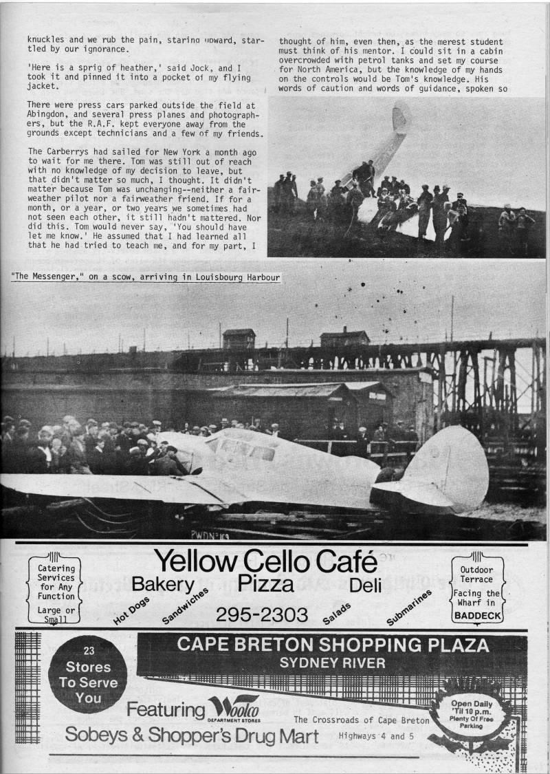 knuckles and we rub the pain, starina uoward, star? tled by our ignorance. 'Here is a sprig of heather,' said Jock, and I took it and pinned it into a pocket o1 my flying jacket. There were press cars parked outside the field at Abingdon, and several press planes and photograph? ers, but the R.A.F. kept everyone away from the grounds except technicians and a few of my friends. The Carberrys had sailed for New York a month ago to wait for me there. Tom was still out of reach with no knowledge of my decision to leave, but that didn't matter so much, I thought. It didn't matter because Tom was unchanging • neither a fair- weather pilot nor a fairweather friend. If for a month, or a year, or two years we sometimes had not seen each other, it still hadn't mattered. Nor did this. Tom would never say, 'You should have let me know.' He assumed that I had learned all that he had tried to teach me, and for my part, I "The Messenger," on a scow, arriving in Louisbourg Harbour thought of him, even then, as the merest student must think of his mentor. I could sit in a cabin overcrowded with petrol tanks and set my course for North America, but the knowledge of my hands on the controls would be Tom's knowledge. His words of caution and words of guidance, spoken so Catering J Services I for Any f i Functions Large or I I Sg'll ) Yellow Cello Cafe Bakery Aw* Pizza 295-2303 Deli ?** Stores To Serve You GAPE BRETON SHOPPING PLAZA SYDNEY RIVER mS' Featuring AW0 '*-' OC'AATMENT STONES OE'ARTMENT STONES The Crossroads of Cape Breton' Sobeys & Shopper's Drug Mart "''""''' ' '"' ' Open Daily • ''10 p.m. Ti Ptenty Of Fre? Parking