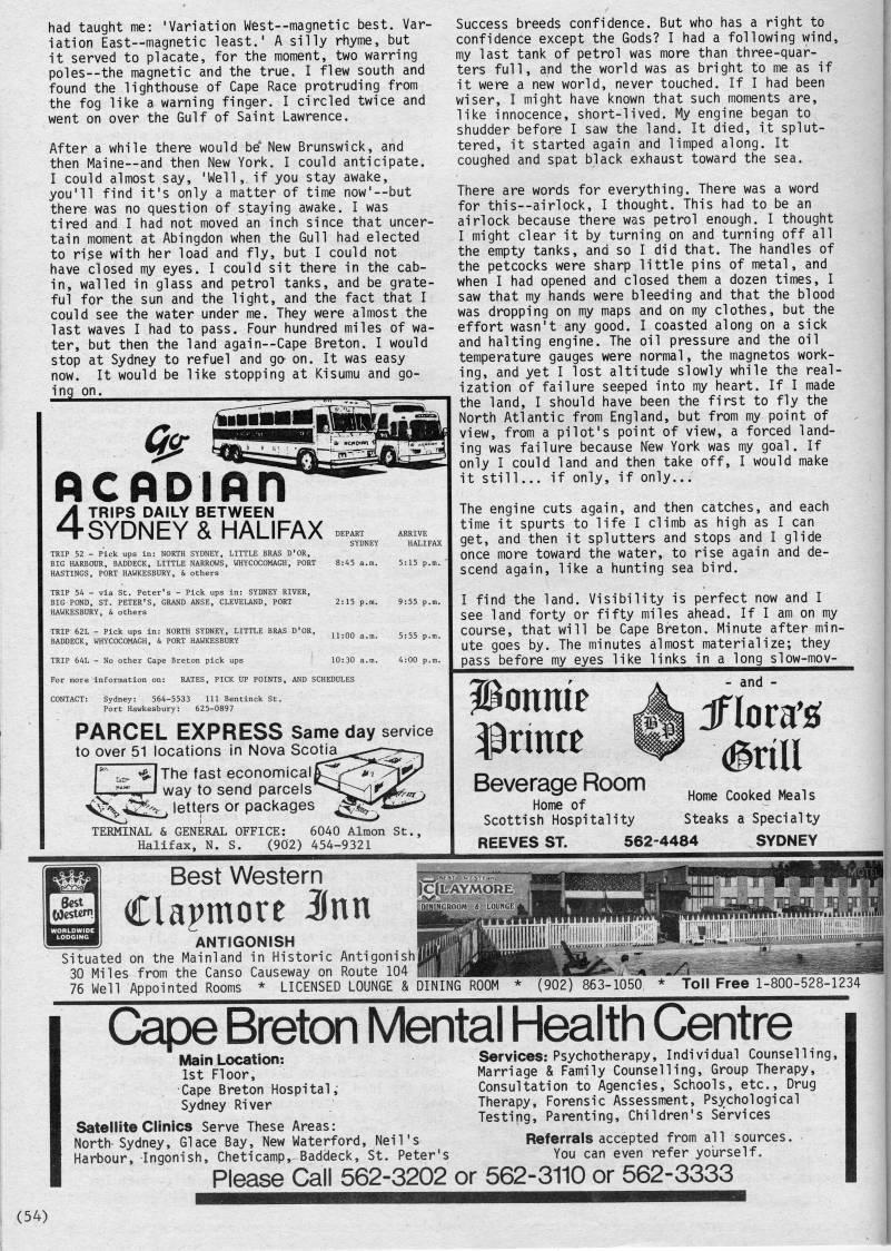 had taught me: 'Variation West--magnetic best. Var? iation East • magnetic least.' A silly rhyme, but it served to placate, for the moment, two warring poles--the magnetic and the true. I flew south and found the lighthouse of Cape Race protruding from the fog like a warning finger. I circled twice and went on over the Gulf of Saint Lawrence. After a while there would be' New Brunswick, and then Maine--and then New York. I could anticipate. I could almost say, 'Well,, if you stay awake, you'll find it's only a matter of time now'--but there was no question of staying awake. I was tired and I had not moved an inch since that uncer? tain moment at Abingdon when the Gull had elected to ri.se with her load and fly, but I could not have closed my eyes. I could sit there in the cab? in, walled in glass and petrol tanks, and be grate? ful for the sun and the light, and the fact that I could see the water under me. They were almost the last waves I had to pass. Four hundred miles of wa? ter, but then the land again--Cape Breton. I would stop at Sydney to refuel and go on. It was easy now. It would be like stopping at Kisumu and go- "ng I Acpomn 4 TRIPS DAILY BETWEEN SYDNEY & HALIFAX • ? SYDNE TRIP 52 - Pick ups in: NORTH SYDNEY, LITTLE BRAS D'OR, BIG HARBOUR, BADDECK, LITTLE NARROWS, WHYCOCOMAGH, PORT 8:45 a.tr HASTINGS, PORT HAWKESBURY, & others TRIP 54 - via St. Peter's - Pick ups in: SYDNEY RIVER, BIG POND, ST. PETER'S, GRAND ANSE, CLEVELAND, PORT 2:15 p.n HAWKESBURY, & others TRIP 64L - No other Cape Breton pick ups 10:30 a For more information on: RATES, PICK UP POINTS, AND SCHEDULES PARCEL EXPRESS Same day service to over 51 locations in Nova Scotia'',,,'-'-'''-' iThe fast econonriicalp''''-'*7~'>Tj!!' I way to send parcels''4>-'iij'' ' letters or packages 4''''*' TERMINAL & GENERAL OFFICE: 6040 Almon St., Halifax, N. S. (902) 454-9321 Success breeds confidence. But who has a right to confidence except the Gods? I had a following wind, my last tank of petrol was more than three-quar? ters full, and the world was as bright to me as if it were a new world, never touched. If I had been wiser, I might have known that such moments are, like innocence, short-lived. My engine began to shudder before I saw the land. It died, it splut? tered, it started again and limped along. It coughed and spat black exhaust toward the sea. There are words for everything. There was a word for this--airlock, I thought. This had to be an airlock because there was petrol enough. I thought I might clear it by turning on and turning off all the empty tanks, and so I did that. The handles of the petcocks were sharp little pins of metal, and when I had opened and closed them a dozen times, I saw that my hands were bleeding and that the blood was dropping on my maps and on my clothes, but the effort wasn't any good. I coasted along on a sick and halting engine. The oil pressure and the oil temperature gauges were normal, the magnetos work- ing, and yet I lost altitude slowly while the real? ization of failure seeped into my heart. If I made the land, I should have been the first to fly the North Atlantic from England, but from my point of view, from a pilot's point of view, a forced land? ing was failure because N'ew York was my goal. If only I could land and then take off, I would make it still... if only, if only... The engine cuts again, and then catches, and each time it spurts to life I climb as high as I can get, and then it splutters and stops and I glide once more toward the water, to rise again and de? scend again, like a hunting sea bird. I find the land. Visibility is perfect now and I see land forty or fifty miles ahead. If I am on my course, that will be Cape Breton. Minute after min? ute goes by. The minutes almost materialize; they pass before my eyes like links in a long slow-mov- onme Jprinte and - Beverage Room Home of Scottish Hospitality (grill Home Cooked Meals Steaks a Specialty REEVES ST. 562-4484 SYDNEY Best Western Clapmore 3nn ICfcTAYMOIiE; ANTIGONISH Situated on the Mainland in Historic Antigonish'J 30 Miles from the Canso Causeway on Route 104 76 Well Appointed Rooms * LICENSED LOUNGE & DINING ROOM (902) 863-1050 Toll Free 1-800-528-1234 Cape Breton Mental Health Centre Main Location: 1st Floor, Cape Breton Hospi tal ,?? Sydney River Satellite Clinics Serve These Areas: North. Sydney, Glace Bay, New Waterford, Harbour, -Ingonish, Cheticamp, Baddeck, Neil's St. Peter's Services: Psychotherapy, Individual Counselling, Marriage & Family Counselling, Group Therapy, Consultation to Agencies, Schools, etc.. Drug Therapy, Forensic Assessment, Psychological Testing, Parenting, Children's Services Referrals accepted from all sources. You can even refer yourself. Please Call 562-3202 or 562-3110 or 562-3333 (54)