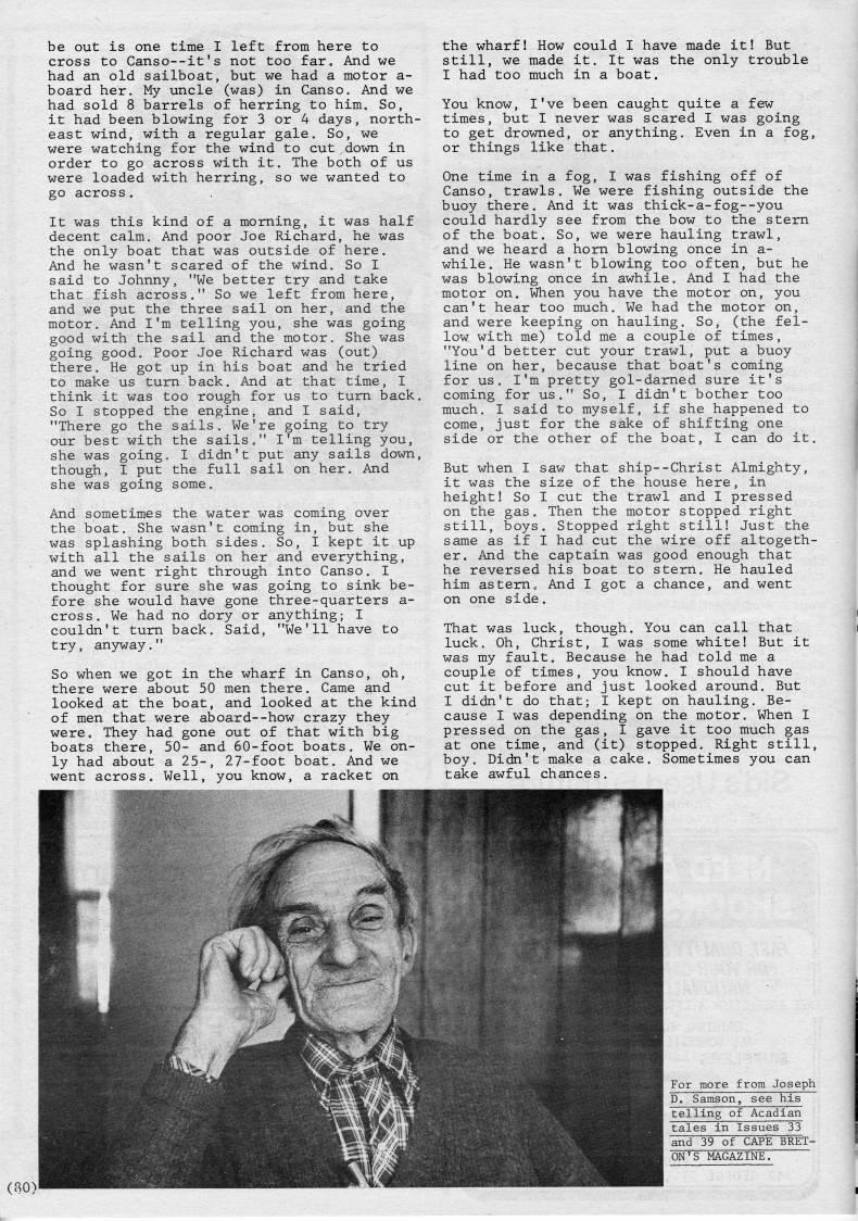Published by Ronald Caplan on 1986/8/1 (167 reads)be out is one time I left from here to cross to Canso--it's not too far. And we had an old sailboat, but we had a motor a- board her. My uncle (was) in Canso. And we had sold 8 barrels of herring to him. So, it had been blowing for 3 or 4 days, north? east wind, with a regular gale. So, we were watching for the wind to cut down in order to go across with it. The both of us were loaded with herring, so we wanted to go across. It was this kind of a morning, it was half decent calm. And poor Joe Richard, he was the only boat that was outside of here. And he wasn't scared of the wind. So I said to Johnny, "We better try and take that fish across." So we left from here, and we put the three sail on her, and the motor. And I'm telling you, she was going good with the sail and the motor. She was going good. Poor Joe Richard was (out) there. He got up in his boat and he tried to make us turn back. And at that time, I think it was too rough for us to turn back. So I stopped the engine, and I said, "There go the sails. We're going to try our best with the sails." I'm telling you, she was going. I didn't put any sails down, though, I put the full sail on her. And she was going some. And sometimes the water was coming over the boat. She wasn't coming in, but she was splashing both sides. So, I kept it up with all the sails on her and everything, and we went right through into Canso. I thought for sure she was going to sink be? fore she would have gone three-quarters a- cross. We had no dory or anything; I couldn't turn back. Said, "We'll have to try, anyway." So when we got in the wharf in Canso, oh, there were about 50 men there. Came and looked at the boat, and looked at the kind of men that were aboard--how crazy they were. They had gone out of that with big boats there, 50- and 60-foot boats. We on? ly had about a 25-, 27-foot boat. And we went across. Well, you know, a racket on the wharf! How could I have made it! But still, we made it. It was the only trouble I had too much in a boat. You know, I've been caught quite a few times, but I never was scared I was going to get drowned, or anything. Even in a fog, or things like that, One time in a fog, I was fishing off of Canso, trawls. We were fishing outside the buoy there. And it was thick-a-fog--you could hardly see from the bow to the stern of the boat. So, we were hauling trawl, and we heard a horn blowing once in a- while. He wasn't blowing too often, but he was blowing once in awhile. And I had the motor on. When you have the motor on, you can't hear too much. We had the motor on, and were keeping on hauling. So, (the fel? low with me) told me a couple of times, "You'd better cut your trawl, put a buoy line on her, because that boat's coming for us. I'm pretty gol-darned sure it's coming for us." So, I didn't bother too much. I said to myself, if she happened to come, just for the sake of shifting one side or the other of the boat, I can do it. But when I saw that ship--Christ Almighty, it was the size of the house here, in height! So I cut the trawl and I pressed on the gas. Then the motor stopped right still, boys. Stopped right still! Just the same as if I had cut the wire off altogeth? er. And the captain was good enough that he reversed his boat to stern. He hauled him astern. And I got a chance, and went on one side. That was luck, though. You can call that luck. Oh, Christ, I was some white! But it was my fault. Because he had told me a couple of times, you know. I should have cut it before and just looked around. But I didn't do that; I kept on hauling. Be? cause I was depending on the motor. When I pressed on the gas, I gave it too much gas at one time, and (it) stopped. Right still, boy. Didn't make a cake. Sometimes you can take awful chances. (80) For more from Joseph D. Samson, see his telling of Acadian tales in Issues 33 and 39 of CAPE BRET? ON'S MAGAZINE. ~