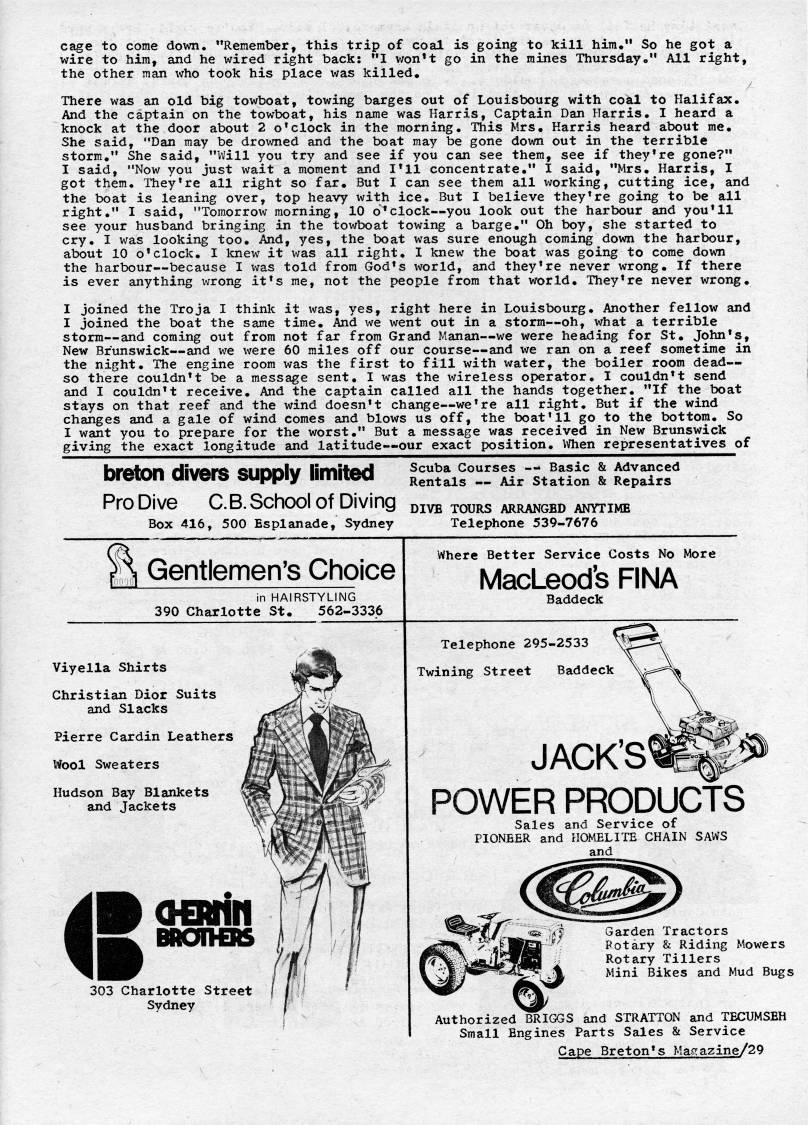 Published by Ronald Caplan on 1974/6/1 (582 reads)cage to come down. "Remember, this trip of coal is going to kill him," So he got a wire to him, and he wired right back: "I v/on't go in the mines Thursday," All right, the other man who took his place was killed. There was an old big towboat, towing barges out of Louisbourg with coal to Halifax. And the captain on the towboat, his name was Harris, Captain Dan Harris. I heard a knock at the door about 2 o'clock in the morning. This Mrs, Karris heard about me. She said, "Dan may be drowned and the boat may be gone dovm. out in the terrible storm," She said, "VJill you try and see if you can see them, see if they're gone?" I said, "Now you just wait a moment and I'll concentrate," I said, "Mrs, Harris, I got them. They're all right so far. But I can see them all working, cutting ice, and the boat is leaning over, top heavy with ice. But I believe they're going to be all right." I said, "Tomorrow morning, 10 o'clock • you look out the harbour and you'll see your husband bringing in the towboat towing a barge," Oh boy, she started to cry. I was looking too. And, yes, the boat was sure enough coming down the harbour, about 10 o'clock. I knew it was all right. I knew the boat was going to come down the harbour • because I was told from God's world, and they're never wrong. If there is ever anything wrong it's me, not the people from that world. They're never wrong, I joined the Troja I think it was, yes, right here in Louisbourg. Another fellow and I joined the boat the same time. And we went out in a storm • oh, what a terrible storm • and coming out from not far from Grand Manan • we were heading for St, John's, New Brunswick • and we were 60 miles off our course • and we ran on a reef sometime in the night. The engine room was the first to fill with water, the boiler room dead • so there couldn't be a message sent. I was the wireless operator. I couldn't send and I couldn't receive. And the captain called all the hands together. "If the boat stays on that reef and the wind doesn't change • we're all right. But if the wind changes and a gale of wind comes and blows us off, the boat'11 go to the bottom. So I want you to prepare for the worst," But a message was received in New Brunswick giving the exact longitude and latitude • our exact position. When representatives of breton divers supply limited Scuba Courses • ' Basic & Advanced Rentals • Air Station & Repairs Pro Dive C. B. School of Diving 'ivb tours arranged anwime Box 416, 500 Esplanade, Sydney Telephone 539-7676 ??>i Gentlemen's Choice in HAIRSTYLING 390 Charlotte St. 562-3336 Viyella Shirts Christian Dior Suits and Slacks Pierre Cardin Leathers Wool Sweaters Hudson Bay Blankets and Jackets Where Better Service Costs No More IVIacLeod's FINA Baddeck Telephone 295-2533 Twining Street Baddeck JACK'S' POWER PRODUCTS Sales and Service of PIONEER and HOMELITE CHAIN SAWS and 303 Charlotte Street Sydney Garden Tractors Potary & Riding Mowers Rotary Tillers Mini Bikes and Mud Bugs Authorized BRIGGS and STRATTON and TECUMSEH Small Engines Parts Sales & Service Cape Breton's Maga2ine/29