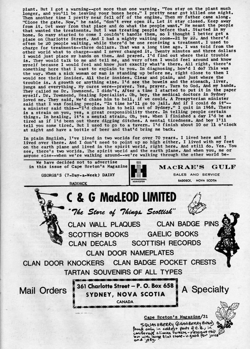 Published by Ronald Caplan on 1974/6/1 (548 reads)plant. But I got a warning • got more than one warning, "You stay on the plant much longer, and you'll be leaving your bones here." I pretty near got killed one night. Then another time I pretty near fell off of the engine. Then ray father came along. "Close the gate. Now," he said, "don't ever open it. Let it stay closed. Keep away from it. Get away from that place and do what the people want," He meant the people that wanted the treatments. But I was treating people before that. Started in my home. So many started to come I couldn't handle thera, so I thought I better get a place on Charlotte Street, And I had a mighty waiting room • 21 by 22. And there'd often be 20 people waiting, while there'd be one receiving a treatment, I used to charge for treatments • three dollars. That was a long time ago. I was told from the other world what to charge • and I never changed it. Twenty minutes and three dollars I would just place my hands on them. And prayed. I'd find out where their trouble is. They would talk to me and tell me, and very often I would feel around and know myself because I would feel and know just exactly what's there. All right, there's something here that I want to explain to you. In diagnosing, how'd I do? This was the way. When a sick woman or man is standing up before me, right close to them I would see their insides. All their insides. Clear and plain, and just where the trouble is. A growth or anything else, I'd see the bowels and the stomach, liver, lungs and everything. My cures were • prayer. Yes, prayer. Turn to God. And my hands. They called me Dr, Townsend, I didn't. After a time I started to put it in the paper myself. Dr. Townsend, Healing Specialist, Oh, boy, the medical doctors in Sydney loved me. They said. We'd chase him to hell, if we could. A Prespyterian minister said that I was fooling people. "In time he'll go to jail. And if I could do it" • a minister said this • "I'd chase him to hell out of Sydney." I quit in 1968. There is a strain on you, yes, a great responsibility there. In telling people certain things. In healing, it's a mental strain. Oh, yes. When I finished a day I'd be as tired as if I'd been out there digging ditches, A mental tiredness. And boy I'll tell you some tired. But I used to go to a tavern. I'd finish about 10 or 11 o'clock at night and have a bottle of beer and that'd bring me back. In plain English, I've lived in two worlds for over 70 years, I lived here and I lived over there. And I don't need to point up so high either, I lived with my feet on the earth plane and lived in the spirit world, right here. And still do. Yes. You see, there's two worlds. The spirit world and the earth plane. And when you, me or anyone else • when we're walking around • we're walking through the other world be- We have decided not to advertise in this issue of Cape Breton's Magazine GEORGE'S (7-Day-a-Week) DAIRY BADDECK MACRAE'S GULF SALES AND SERVICE BADDECK, NOVA SCOTIA C & G MadEOD LIMITED CLAN WALL PLAQUES CLAN BADGE PINS SCOTTISH BOOKS GAELIC BOOKS CLAN DECALS SCOTTISH RECORDS CLAN DOOR NAMEPLATES CLAN DOOR KNOCKERS CLAN BADGE POCKET CRESTS TARTAN SOUVENIRS OF ALL TYPES Mail Orders I 361 Charlotte Street - P. O. Box 658 | I SYDNEY, NOVA SCOTIA A Specialty CANADA Cape Breton's Magazine/31 Wji' w.tu oj'oye 'U' s'*