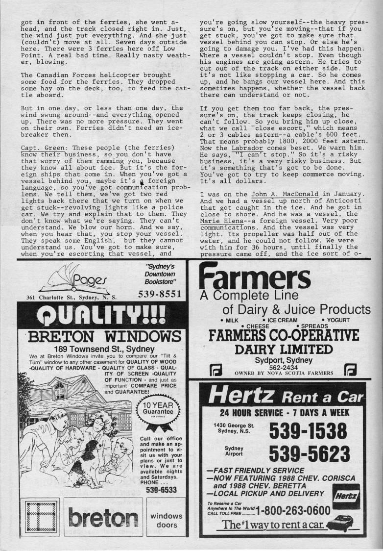 Published by Ronald Caplan on 1987/6/1 (278 reads)got in front of the ferries, she went a- head, and the track closed right in. Just, the wind just put everything. And she just (couldn't) move at all. Seven days outside here. There were 3 ferries here off Low Point. A real bad time. Really nasty weath? er, blowing. The Canadian Forces helicopter brought some food for the ferries. They dropped some hay on the deck, too, to feed the cat? tle aboard. you're going slow yourself--the heavy pres? sure's on, but you're moving--that if you get stuck, you've got to make sure that vessel behind you can stop. Or else he's going to damage you. I've had this happen. Where a vessel couldn't stop. Even though his engines are going astern. He tries to cut out of the track on either side. But it's not like stopping a car. So he comes up, and he bangs our vessel here. And this sometimes happens, whether the vessel back there can understand or not. But in one day, or less than one day, the wind swung around--and everything opened up. There was no more pressure. They went on their own. Ferries didn't need an ice? breaker then. Capt. Green: These people (the ferries) know their business, so you don't have that worry of them ramming you, because they know all about ice. But it's the for? eign ships that come in. When you've got a vessel behind you, maybe it's a foreign language, so you've got communication prob? lems. We tell them, we've got two red lights back there that we turn on when we get stuck--revolving lights like a police car. We try and explain that to them. They don't know what we're saying. They can't understand. We blow our horn. And we say, when you hear that, you stop your vessel. They speak some English, but they cannot understand us. You've got to make sure, when you're escorting that vessel, and If you get them too far back, the pres? sure's on, the track keeps closing, he can't follow. So you bring him up close, what we call "close escort," which means 2 or 3 cables astern--a cable's 600 feet. That means probably 1800, 2000 feet astern. Now the Labrador comes beset. We warn him. He says, "I can't stop." So it's a risky business, it's a very risky business. But it's something that's got to be done. You've got to try to keep commerce m.oving. It's all dollars. I was on the John A. MacDonald in January. And we had a vessel up north of Anticosti tha:t got caught in the ice. And he got in close to shore. And he was a vessel, the Marie Elena--a foreign vessel. Very poor communications. And the vessel was very light. Its propeller was half out of the water, and he could not follow. We were with him for 36 hours, until finally the pressure came off, and the ice sort of o- 361 Charlotte St., Sydney, N. S. "Sydney's Downtown Bookstore" 539-8551 OUnilTV!!! BRETON WINDOWS 189 Townsend St., Sydney We at Breton Windows invite you to compare our "Tilt & Turn" window to any other casement for QUALITY OF WOOD -QUALITY OF HARDWARE - QUALITY OF GLASS - QUAL? ITY OF SCREEN -QUALITY OF FUNCTION - and just as important COMPARE PRICE and GUARANTEE! Farmers A Coinplete Line Call our office and make an ap? pointment to vi? sit us with your plans or just to view. We are available nights and Saturdays. PHONE ... 53S-6533 bretori windows doors of Dairy & Juice Products • MILK • ICE CREAM • YOGURT • CHEESE • SPREADS FARMERS CO-OPERATIVE DAIRY LIMITED Sydport, Sydney S 562-2434 fZ3 OWNED BY NOVA SCOTIA FARMERS tM HortZ Rent a Car 24 HOUR SERVICE - 7 DAYS A WEEK 1430 George St. Sydney, N.S. Sydney Airport 539-1538 539-5623 -'FAST FRIENDL Y SERVICE "NOW FEATURING 1988 CHEV. CORISCA and 1988 CHEV. BERETTA -LOCAL PICKUP AND DELIVERY ''2227 To Reserve a Car 2zr'/"eSl"!:'!1-800-263-0600 The*l way to rent a cat 4l'