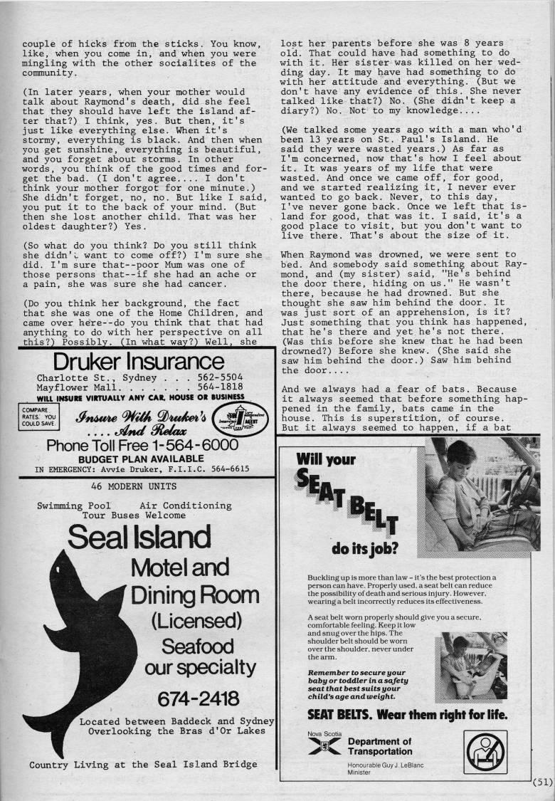 Published by Ronald Caplan on 1987/6/1 (239 reads)couple of hicks from the sticks. You know, like, when you come in, and when you were mingling with the other socialites of the community. (In later years, when your mother would talk about Raymond's death, did she feel that they should have left the island af? ter that?) I think, yes. But then, it's just like everything else. When it's stormy, everything is black. And then when you get sunshine, everything is beautiful, and you forget about storms. In other words, you think of the good times and for? get the bad. (I don't agree.... I don't think your mother forgot for one minute.) She didn't forget, no, no. But like I said, you put it to the back of your mind. (But then she lost another child. That was her oldest daughter?) Yes. (So what do you think? Do you still think she didn'L want to come off?) I'm sure she did. I'm sure that--poor Mum was one of those persons that--if she had an ache or a pain, she was sure she had cancer. (Do you think her background, the fact that she was one of the Home Children, and came over here--do you think that that had anything to do with her perspective on all this?) Possibly. (In what way?) Well, she II. slblY. (I a??' i' Druker Insurance Charlotte St., Sydney . . . 562-5504 Mayflower Mall 564-1818 Will IWSUKE VIRTUAllY ANY CAR. HOUSE OR BUSINESS COMPARE. rates; you could save. tJi'iu/ dtelax Phone Toll Free 1-564-6000 BUDGET PLAN AVAILABLE IN EMERGENCY: Awie Druker, F.I.I.C. 564-6615 46 MODERN UNITS Swimming Pool Air Conditioning Tour Buses Welcome Seallsland A Motel and ''' Dining Room ''''L (Licensed) 'V''A Seafood '''V our specialty '''''''Located bel ''''' Overlooki Country Living at the Seal Island Bridge 674-2418 lost her parents before she was 8 years old. That could have had something to do with it. Her sister was killed on her wed? ding day. It may have had something to do with her attitude and everything. (But we don't have any evidence of this. She never talked like that?) No. (She didn't keep a diary?) No. Not to my knowledge.... (We talked some years ago with a man who'd been 13 years on St. Paul's Island. He said they were wasted years.) As far as I'm concerned, now that's how I feel about it. It was years of my life that were wasted. And once we came off, for good, and we started realizing it, I never ever wanted to go back. Never, to this day, I've never gone back. Once we left that is? land for good, that was it. I said, it's a good place to visit, but you don't want to live there. That's about the size of it. When Raymond was drowned, we were sent to bed. And somebody said something about Ray? mond, and (my sister) said, "He's behind the door there, hiding on us." He wasn't there, because he had drowned. But she thought she saw him behind the door. It was just sort of an apprehension, is it? Just something that you think has happened, that he's there and yet he's not there. (Was this before she knew that he had been drowned?) Before she knew. (She said she saw him behind the door.) Saw him behind the door.... And we always had a fear of bats. Because it always seemed that before something hap? pened in the family, bats came in the house. This is superstition, of course. But it always seemed to happen, if a bat Located between Baddeck and Sydney Overlooking the Bras d'Or Lakes Buckling up is more than law - it's the best protection a person can have. Properly used, a seat belt can reduce the possibility of death and serious injury. However, wearing a belt incorrectly reduces its effectiveness. A seat belt worn properly should give you a secure, comfortable feeling. Keep it low and snug over the hips. The shoulder belt should be worn over the shoulder, never under the arm. RemembeT to secure your baby or toddler in a safety seat that best suits your child's age and weight. SEAT BELTS. Wear I>IUV<1 OUUUct Department of Transportation ??'(51)