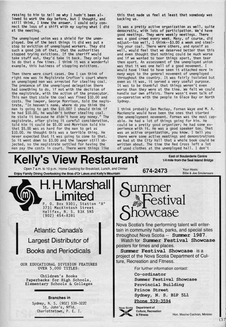 Published by Ronald Caplan on 1987/6/1 (147 reads)rassing to him to tell me why I hadn't been al? lowed to work the day before, but I thought, and still think, I knew the answer. I could only con? nect the loss of a shift with my saying what I did at the meeting. The unemployed union was a shield for the unem? ployed. One of the best things it did was put a stop to eviction of unemployed workers. They did such a good job of that, that the authorities stopped trying evictions. If the sheriff would take stuff out, they'd take it back. They only had to do that a few times. I think it was a wonderful example, this business of stopping evictions. Then there were court cases. One I car> think of right now was in Magistrate Crofton's court where an unemployed man was arrested for stealing coal. The presence of the unemployed delegation there had something to do, if not with the decision of the magistrate, with the action of the prosecutor. This man that stole the coal was fined $10,00 and costs. The lawyer, George Morrison, told the magis? trate, "In heaven's name, where do you think the man is going to get the $10.00? I should think if he had $10.00, he wouldn't bother stealing coal. He stole it because he didn't have any money." The magistrate, after giving it careful consideration, told him it could be $5,00 and Morrison told him that $5.00 was as hard for the man to get as $10.00. He thought this was a terrible thing. He never expected that it was going to come to that. So it went down to $3.00 and the lawyer still ob? jected, so the magistrate settled for having the man pay the costs in court. There were things like this that made us feel at least that somebody was backing us. It was a pretty active organization as well, quite democratic, with lots of participation. We'd have good meetings. They were weekly meetings. There was a good crowd every week. Many, of course, did adjust--too well, I think--$3.00 a week and steal? ing your coal. There were others, and myself as well, would feel that we deserved better than this and even thought that nothing could be much worse and if we wanted to tear things apart, then tear them apart. An assessment of the unemployed union was that it was one hell of a good movement. I would have liked to have seen it attached more in many ways to the general movement of unemployed throughout the country. It was fairly isolated but even as it was, it served a very useful purpose. It was to be thankful that things weren't even worse than they were at the time. We felt we could handle our own affairs. There wasn't even talk of co-operation with the people in Glace Bay or North Sydney. I think probably Dan MacKay, Forman Waye and M. A. MacKenzie would have been the ones that started the unemployment movement. Forman was the most cap? able. He had a lot of things going for him. He could be a pretty good organizer; he had some ex? perience with it. He was a good speaker too. That was an active organization, you know. I tell you there were some active meetings and demonstrations we had at the City Hall that a whole book could be written about. The time the Red Cross left a lot of used clothes at the unemployed hall. I don't Kelly's View Restaurant Open 7 a.m. to 10 p.m.: Home Cooking for Breakfast, Lunch, and Dinner Enjoy Family Dining Overlooking the Bras d'Or Lakes and Kelly's Mountain East of Boularderie Centre 1/4 mile from the Seal Island Bridge 674-2473 Your Hosts: Billie & Joe Smolenaars ' H. H. Marshall Limited 0. Box 9301, Station "A" 3731 MacKintosh Street Halifax, N. S. B3K 5N5 (902) 454-8381 Atlantic Canada's Largest Distributor of Books and Periodicals OUR EDUCATIONAL DIVISION FEATURES OVER 5,000 TITLES: Children's Books Paperbacks for High Schools, Elementary Schools & Colleges Branches in Sydney, N. S. (902) 539-3220 St. John's, Nfld. Charlottetown, P. E. I. gummer 'pestival Showcase Nova Scotia's fine performing talent will enter? tain in community halls, parks, and special sites throughout Nova Scotia - Summer 1987. Watch for Sjinmer Festival Showcase posters for times and places. Summer Festival Showcase is a project of the Nova Scotia Department of Cul? ture, Recreation and Fitness. For further information contact: Co-ordinator Sjinmer Festival Showcase Provincial Building Prince Street Sydney, N. S. BIP 5L1 Phone 539-3594 E>epartment of Culture, Recreation & Fitness Hon. Maxine Cochran, Minister