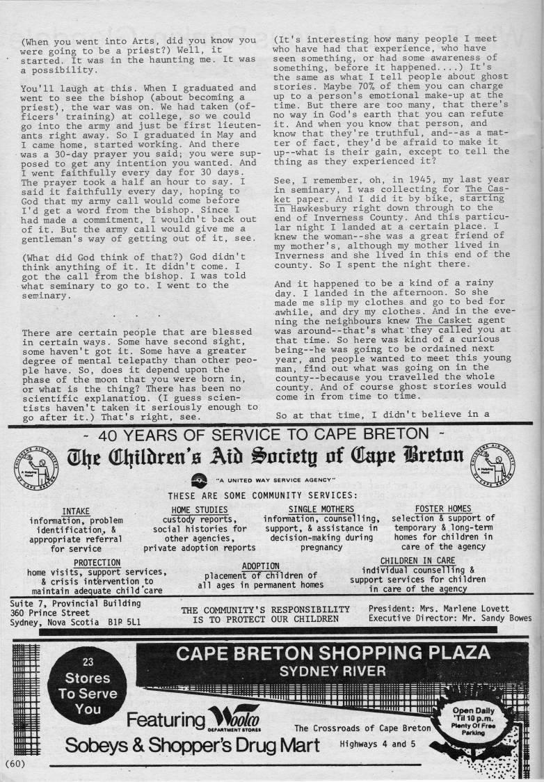 Published by Ronald Caplan on 1987/6/1 (419 reads)(When you went into Arts, did you know you were going to be a priest?) Well, it started. It was in the haunting me. It was a possibility. You'll laugh at this. When I graduated and went to see the bishop (about becoming a priest), the war was on. We had taken (of? ficers ' training) at college, so we could go into the army and just be first lieuten? ants right away. So I graduated in May and I came home, started working. And there was a 30-day prayer you said; you were sup? posed to get any intention you wanted. And I went faithfully every day for 30 days. The prayer took a half an hour to say, I said it faithfully every day, hoping to God that my army call would come before I'd get a word from the bishop. Since I had made a commitment, I wouldn't back out of it. But the army call would give me a gentleman's way of getting out of it, see. (What did God think of that?) God didn't think anything of it. It didn't come. I got the call from the bishop, I was told what seminary to go to. I went to the sem.inary. There are certain people that are blessed in certain ways. Some have second sight, some haven't got it. Some have a greater degree of mental telepathy than other peo? ple have. So, does it depend upon the phase of the moon that you were born in, or what is the thing? There has been no scientific explanation, (I guess scien? tists haven't taken it seriously enough to go after it.) That's right, see. (It's interesting how many people I meet who have had that experience, who have seen something, or had some awareness of something, before it happened,,,.) It's the same as what I tell people about ghost stories. Maybe 707o of them you can charge up to a person's emotional make-up at the time. But there are too many, that there's no way in God's earth that you can refute it. And when you know that person, and know that they're truthful, and--as a mat? ter of fact, they'd be afraid to make it up--what is their gain, except to tell the thing as they experienced it? See, I remember, oh, in 1945, my last year in seminary, I was collecting for The Cas? ket paper. And I did it by bike, starting in Hawkesbury right down through to the end of Inverness County. And this particu? lar night I landed at a certain place, I knew the woman--she was a great friend of my mother's, although my mother lived in Inverness and she lived in this end of the county. So I spent the night there. And it happened to be a kind of a rainy day. I landed in the afternoon. So she made me slip my clothes and go to bed for awhile, and dry my clothes. And in the eve? ning the neighbours knew The Casket agent was around--that's what'they called you at that time. So here was kind of a curious being--he was going to be ordained next year, and people wanted to meet this young man, find out what was going on in the county--because you travelled the whole county. And of course ghost stories would come in from time to time. So at that time, I didn't believe in a - 40 YEARS OF SERVICE TO CAPE BRETON - ?l|c • i|Uiircn*0 Klh 'orictu of CSIajic Breton '' "A UNITED WAY SERVICE AGENCY" THESE ARE SOME COMMUNITY SERVICES: INTAKE infonnation, problem identification, & appropriate referral for service PROTECTION home visits, support services, & crisis intervention to maintain adequate child'care HOME STUDIES custody reports, social histories for other agencies, private adoption reports SINGLE MOTHERS infonnation, counselling, support, & assistance in decision-making during pregnancy ADOPTION placement of children of all ages in permanent homes FOSTER HOMES selection & support of temporary & long-term homes for children in care of the agency CHILDREN IN CARE individual counselling & support services for children in care of the agency Suite 7, Provincial Building 360 Prince Street Sydney, Nova Scotia BIP 5L1 THE COMMUNITY'S RESPONSIBILITY IS TO PROTECT OUR CHILDREN President: Mrs. Marlene Lovett Executive Director: Mr. Sandy Bowes Stores To Serve You CAPE BRETON SHOPPING PLAZA SYDNEY RIVER Um' Featuring AW?? MPANTMENT STORES The Crossroads of Cape Breton' Sobeys & Shopper's Drug Mart "''''''' ' '"' ' (60) Open Daily "'??10 p.m. Opei 'fill Plenty Of Fr*?
