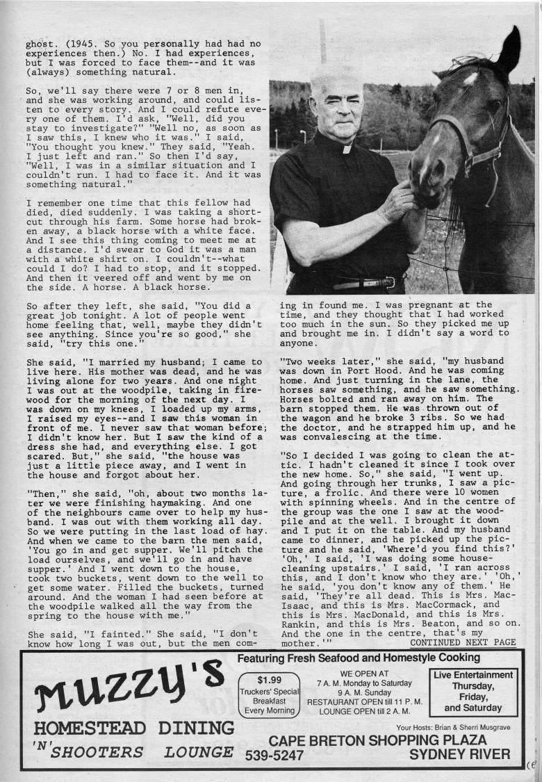 Published by Ronald Caplan on 1987/6/1 (242 reads)ghost. (1945. So you personally had had no experiences then.) No, I had experiences, but I was forced to face them--and it was (always) something natural. So, we'll say there were 7 or 8 men in, and she was working around, and could lis? ten to every story. And I could refute eve? ry one of them. I'd ask, "Well, did you stay to investigate?" "Well no, as soon as I saw this, I knew who it was." I said, "You thought you knew," They said, "Yeah. I just left and ran." So then I'd say, "Well, I was in a similar situation and I couldn't run. I had to face it. And it was something natural." I remember one time that this fellow had died, died suddenly. I was taking a short? cut through his farm. Some horse had brok? en away, a black horse with a white face. And I see this thing coming to meet me at a distance. I'd swear to God it was a man with a white shirt on, I couldn't--what could I do? I had to stop, and it stopped. And then it veered off and went by me on the side. A horse. A black horse. So after they left, she said, "You did a great job tonight. A lot of people went home feeling that, well, maybe they didn't see anything. Since you're so good," she said, "try this one." She said, "I married my husband; I came to live here. His mother was dead, and he was living alone for two years. And one night I was out at the woodpile, taking in fire? wood for the morning of the next day. I was down on my knees, I loaded up my arms, I raised my eyes--and I saw this woman in front of me. I never saw that woman before; I didn't know her. But I saw the kind of a dress she had, and everything else. I got scared. But," she said, "the house was just a little piece away, and I went in the house and forgot about her. "Then," she said, "oh, about two months la? ter we were finishing haymaking. And one of the neighbours came over to help my hus? band. I was out with them working all day. So we were putting in the last load of hay. And when we came to the barn the men said, 'You go in and get supper. We'll pitch the load ourselves, and we'll go in and have supper.' And I went down to the house, took two buckets, went down to the well to get some water. Filled the buckets, turned around. And the woman I had seen before at the woodpile walked all the way from the spring to the house with me." She said, "I fainted." She said, "I don't know how long I was out, but the men com? ing in found me. I was pregnant at the time, and they thought that I had worked too much in the sun. So they picked me up and brought me in. I didn't say a word to anyone. "Two weeks later," she said, "my husband was down in Port Hood. And he was coming home. And just turning in the lane, the horses saw something, and he saw something. Horses bolted and ran away on him. The barn stopped them. He was thrown out of the wagon and he broke 3 ribs. So we had the doctor, and he strapped him up, and he was convalescing at the time. "So I decided I was going to clean the at? tic. I hadn't cleaned it since I took over the new home. So," she said, "I went up. And going through her trunks, I saw a pic? ture, a frolic. And there were 10 women with spinning wheels. And in the centre of the group was the one I saw at the wood? pile and at the well. I brought it down and I put it on the table. And my husband came to dinner, and he picked up the pic? ture and he said, 'Where'd you find this?' 'Oh,' I said, 'I was doing some house- cleaning upstairs.' I said, 'I ran across this, and I don't know who they are.' 'Oh,' he said, 'you don't know any of them, ' He said, 'They're all dead. This is Mrs, Mac- Isaac, and this is Mrs, MacCormack, and this is Mrs. MacDonald, and this is Mrs. Rankin, and this is Mrs. Beaton, and so on. And the one in the centre, that's my mother."' CONTINUED NEXT PAGE HOMESTEAD DINING Featuring Fresh Seafood and Homestyie Cooking $1.99 [Truckers' Special| Breakfast lEvery Morning WE OPEN AT 7 A. M. Monday to Saturday 9 A. M. Sunday RESTAURANT OPEN till 11P.M. LOUNGE OPEN till 2 A. M. Live Entertainment Thursday, Friday, and Saturday 'N SHOOTERS Your Hosts: Brian & Sherri Musgrave ' ' _ CAPE BRETON SHOPPING PLAZA LOUNGE 539-5247 SYDNEY RIVER