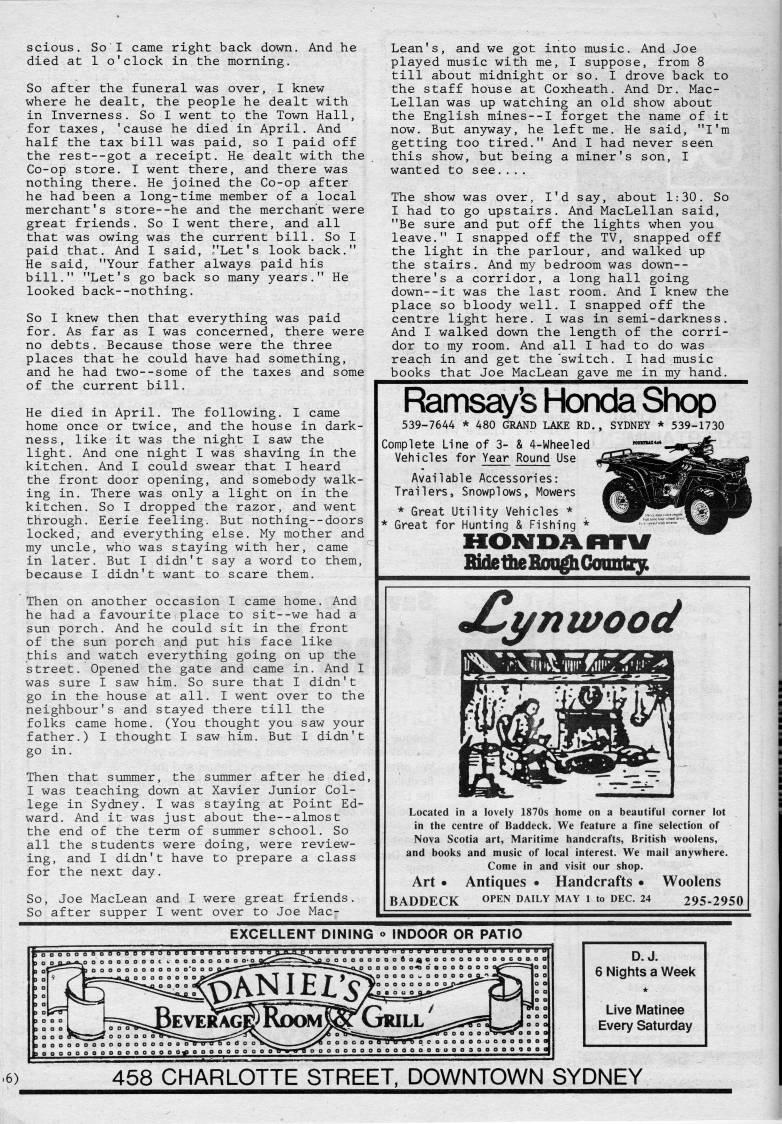 Published by Ronald Caplan on 1987/6/1 (213 reads)scious. So I came right back down. And he died at 1 o'clock in the morning. So after the funeral was over, I knew where he dealt, the people he dealt with in Inverness. So I went to the Town Hall, for taxes, 'cause he died in April, And half the tax bill was paid, so I paid off the rest--got a receipt. He dealt with the Co-op store. I went there, and there was nothing there. He joined the Co-op after he had been a long-time member of a local merchant's store--he and the merchant were great friends, So I went there, and all that was owing was the current bill. So I paid that. And I said, "Let's look back," He said, "Your father always paid his bill." "Let's go back so many years," He looked back--nothing. So I knew then that everything was paid for. As far as I was concerned, there were no debts, Because those were the three places that he could have had something, and he had two--some of the taxes and some of the current bill. He died in April, The following. I came home once or twice, and the house in dark? ness, like it was the night I saw the light. And one night I was shaving in the kitchen. And I could swear that I heard the front door opening, and somebody walk? ing in. There was only a light on in the kitchen. So I dropped the razor, and went through. Eerie feeling. But nothing--doors locked, and everything else. My mother and my uncle, who was staying with her, came in later. But I didn't say a word to them, because I didn't want to scare them. Then on another occasion I came home. And he had a favourite place to sit--we had a sun porch. And he could sit in the front of the sun porch and put his face like this and watch everything going on up the street. Opened the gate and came in. And I was sure I saw him. So sure that I didn't go in the house at all, I went over to the neighbour's and stayed there till the folks came home, (You thought you saw your father,) I thought I saw him. But I didn't go in. Then that summer, the summer after he died, I was teac:hing down at Xavier Junior Col? lege in Sydney. I was staying at Point Ed? ward, And it was just about the--almost the end of the term of summer school. So all the students were doing, were review? ing, and I didn't have to prepare a class for the next day, So, Joe MacLean and I were great friends. So after supper I went over to Joe Mac- Lean's, and we got into music. And Joe played music with me, I suppose, from 8 till about midnight or so, I drove back to the staff house at Coxheath, And Dr, Mac? Lellan was up watching an old show about the English mines--! forget the name of it now. But anyway, he left me. He said, "I'm getting too tired," And I had never seen this show, but being a miner's son, I wanted to see,,,, The show was over, I'd say, about 1:30. So I had to go upstairs. And MacLellan said, "Be sure and put off the lights when you leave," I snapped off the TV, snapped off the light in the parlour, and walked up the stairs. And my bedroom was down-- there's a corridor, a long hall going down--it was the last room. And I knew the place so bloody well, I snapped off the centre light here, I was in semi-darkness. And I walked down the length of the corri? dor to my room. And all I had to do was reach in and get the 'switch. I had music books that Joe MacLean gave me in my hand. Ramsay's Honda Shop 539-7644 * 480 GRAND LAKE RD., SYDNEY * 539-1730 Complete Line of 3- & 4-Wheeled Vehicles for Year Round Use Available Accessories: Trailers, Snowplows, Mowers * Great Utility Vehicles * * Great for Hunting & Fishing * HONDA. flTlf maettieBoBghConiiliy jCj/nwood Located in a lovely 1870s home on a beautiful corner lot in the centre of Baddeck, We feature a fine selection of Nova Scotia art, Maritime handcrafts, British woolens, and books and music of local interest. We mail anywhere. Come in and visit our shop. Art • Antiques • Handcrafts • Woolens BADDECK OPEN daily may i to dec, 24 295-2950 EXCELLENT DINING <> INDOOR OR PATIO looooooftofliBBBgaftBBBBBBBBBBB BBBBBBWUBBBBBBBBBBBflBBBBI D.J. 6 Nights a Week * Live Matinee Every Saturday 458 CHARLOTTE STREET DOWNTOWN SYDNEY