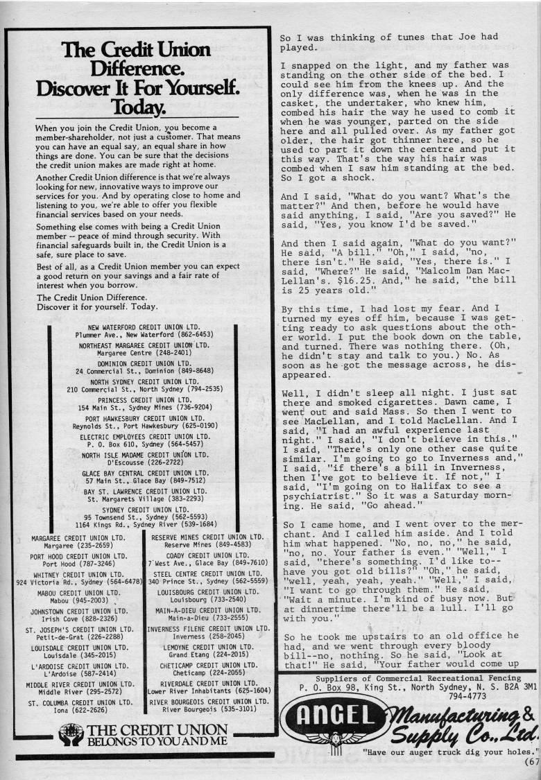Published by Ronald Caplan on 1987/6/1 (186 reads)The Qedit Unkm EMfference. Discover It For YourseE Today. When you join the Credit Union, you become a member-shareholder, not just a customer. That means you can have an equal say, an equal share in how things are done. You can be sure that the decisions the credit union makes are made right at home. Another Credit Union difference is that we're always looking for new, innovative ways to improve our services for you. And by operating close to home and listening to you, we're able to offer you flexible financial services based on your needs. Something else comes with being a Credit Union member -- peace of mind through security. With financial safeguards built in, the Credit Union is a safe, sure place to save. Best of all, as a Credit Union member you can expect a good return on your savings and a fair rate of interest when you borrow. The Credit Union Difference. Discover it for yourself. Today. NEW WATERFORD CREDIT UNION LTD. Plummer Ave,, New Waterford (862-6453) NORTHEAST MARGAREE CREDIT UNIOtf LTD. Margaree Centre (248-2401) DOMINION CREDIT UNION LTD, 24 Commercial St., Dominion (849-8648) NORTH SYDNEY CREDIT UNION LTD, 210 Commercjial St,, North Sydney (794-2535) PRINCESS CREDIT UNION LTD. 154 Main St., Sydney Mines (736-9204) PORT HAWKESBURY CREDIT UNION LTD, Reynolds St,, Port Hawkesbury (625-0190) ELECTRIC EMPLOYEES CREDIT UNION LTD. P. 0. Box 610, Sydney (564-5457) NORTH ISUE MADAME CREDIT UNION LTD. D'Escousse (226-2722) GLACE BAY CENTRAL CREDIT UNION LTD, 57 Main St., Glace Bay (849-7512) BAY ST. LAWRENCE CREDIT UNION LTD. St. Margarets Village (383-2293) SYDNEY CREDIT UNION LTD, 95 Townsend St,, Sydney (562-5593) 1164 Kings Rd,, Sydney River (539-1684) MARGAREE CREDIT UNION LTD. Margaree (235-2659) PORT HOOD CREDIT UNION LTD, Port Hood (787-3246) WHITNEY CREDIT UNION LTD, I 924 Victoria Rd,, Sydney (564-647 MABOU CREDIT UNION LTD, Mabou (945-2003) JOHNSTOWN CREDIT UNION LTD. Irish Cove (828-2326) ST. JOSEPH'S CREDIT UNION LTD, Petit-de-Grat (226-2288) LOUISDALE CREDIT UNION LTD. Louisdale (345-2015) L'ARDOISE CREDIT UNION LTD. L'Ardoise (587-2414) MIDDLE RIVER CREDIT UNION LTD. Middle River (295-2572) ST. COLUMBA CREDIT UNION LTD, lona (622-2626) RESERVE MINES CREDIT UNION LTD. Reserve Mines (849-4583) COADY CREDIT UNION LTD, 7'West Ave., Glace Bay (849-7610) STEEL CENTRE CREDIT UNION LTD. 340 Prince St., Sydney (562-5559) LOUISBOURG CREDIT UNION LTD. Louisbourg (733-2540) MAIN-A-DIEU CREDIT UNION LTD, Main-a-Dieu (733-2555) INVERNESS FILENE CREDIT UNION LTD. Inverness (258-2045) LEMOYNE CREDIT UNION LTD. Grand Etang (224-2015) CHETICAMP CREDIT UNION LTD. Cheticamp (224-2055) RIVERDALE CREDIT UNION LTD. [Lower River Inhabitants (625-1604) RIVER BOURGEOIS CREDIT UNION LTD. River Bourgeois (535-3101) THE CREDIT UNION BELONGS TO YOU AND ME So I was thinking of tunes that Joe had played. I snapped on the light, and my father was standing on the other side of the bed. I could see him from the knees up. And the only difference was, when he was in the casket, the undertaker, who knew him, combed his hair the way he used to comb it when he was younger, parted on the side here and all pulled over. As my father got older, the hair got thinner here, so he used to part it down the centre and put it this way. That's the way his hair was combed when I saw him standing at the bed. So I got a shock. And I said, "What do you want? What matter?" And then, before he would ...'. • ..'' ' the latterY" And then, betore he would have aid anything, I said, "Are you saved?" He said, "Yes, you know I'd be saved." And then I said again, "What do you want?" He said, "A bill." "Oh," I said, "no, there isn't," He said, "Yes, there is," I said, "Where?" He said, "Malcolm Dan Mac? Lellan' s. $16,25, And," he said, "the bill is 25 years old," By this time, I had lost my fear. And I turned my eyes off him, because I was get? ting ready to ask questions about the oth? er world, I put the book down on the table, and turned. There was nothing there. (Oh, he didn't stay and talk to you.) No, As soon as he got the message across, he dis? appeared. Well, I didn't sleep all night, I just sat there and smoked cigarettes. Dawn came, I went out and said Mass. So then I went to see MacLellan, and I told MacLellan, And I said, "I had an awful experience last night," I said, "I don't believe in this," I said, "There's only one other case quite similar. I'm going to go to Inverness and," I said, "if there's a bill in Inverness, then I've got to believe it. If not," I said, "I'm going on to Halifax to see a psychiatrist." So it was a Saturday morn? ing. He said, "Go ahead." So I came home, and I went over to the mer? chant. And I called him aside. And I told him what happened. "No, no, no," he said, "no, no. Your father is even," "Well," I said, "there's something, I'd like to-- have you got old bills?" "Oh," he said, "well, yeah, yeah, yeah," "Well," I said, "I want to go through them," He said, "Wait a minute. I'm kind of busy now. But at dinnertime there'll be a lull, I'll go with you," So he took me upstairs to an old office he had, and we went through every bloody bill--no, nothing. So he said, "Look at that!" He said, "Your father would come up Suppliers of Conmercial Recreational Fencing 0. Box 98, King St., North Sydney, N. S. B2A 3M1 794-4773 "Have our auger truck dig your holes." (6 7