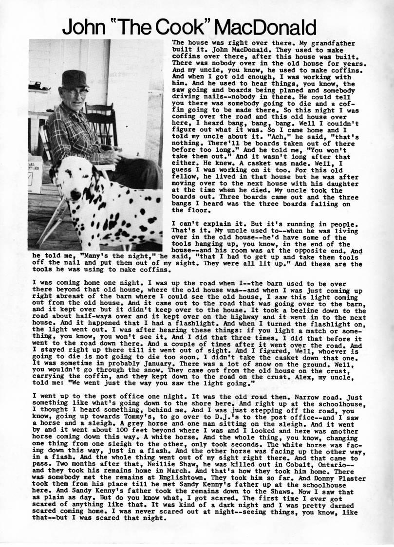 Published by Ronald Caplan on 1974/10/1 (801 reads)John "The Cook" MacDonald The house was right over there. My grandfather built it. John MacDonald. They used to make coffins over there, after this house was built. There was nobody over in the old house for years. And my uncle, you know, he used to make coffins. And when I got old enough, I was working with him. And he used to hear things, you know, the saw going and boards being planed and somebody driving nails • nobody in there. He could tell you there was somebody going to die and a cof? fin going to be made there. So this night I was coming over the road and this old house over here, I heard bang, bang, bang. Well I couldn*t figure out what it was. So I came home and I told my uncle about it. "Ach," he said, "that's nothing. There'll be boards taken out of there before too long." And he told me, "You won't take them out." And it wasn't long after that either. He knew. A casket was made. Well, I guess I was working on it too. For this old fellow, he lived in that house but he was after moving over to the next house with his daughter at the time when he died. My uncle took the boards out. Three boards came out and the three bangs I heard was the three boards falling on the floor. I can't explain it. But it's running in people. That's it. My uncle used to • when he was living over in the old house • he'd have some of the tools hanging up, you know, in the end of the house • and his room was at the opposite end. And he told me, "Many's the night," he said, "that I had to get up and take them tools off the nail and put them out of ray sight. They were all lit up." And these are the tools he was using to make coffins. I was coming home one night. I was up the road when I • the barn used to be over there beyond that old house, where the old house was • and when I was just coming up right abreast of the barn where I could see the old house, I saw this light coming out from the old house. And it came out to the road that was going over to the barn, and it kept over but it didn't keep over to the house. It took a beeline down to the road about half-ways over and it kept over on the highway and it went in to the next house. And it happened that I had a flashlight. And when I turned the flashlight on, the light went out. I was after hearing these things: if you light a match or some? thing, you know, you won't see it. And I did that three times. I did that before it went to the road down there. And a couple of times after it went over the road. And I stayed right up there till it went out of sight. And I figured. Well, whoever is going to die is not going to die too soon. I didn't take the casket down that one. It was sometime in probably January. There was a lot of snow on the ground. Well, you wouldn't go through the snow. They came out from the old house on the crust, carrying the coffin, and they kept down to the road on the crust. Alex, my uncle, told me: "We went just the way you saw the light going." I went up to the post office one night. It was the old road then. Narrow road. Just something like what's going down to the shore here. And right up at the schoolhouse, I thought I heard something, behind me. And I was just stepping off the road, you know, going up towards Tommy's, to go over to D.J.'s to the post office • and I saw a horse and a sleigh. A grey horse and one man sitting on the sleigh. And it went by and it went about 100 feet beyond where I was and I looked and here was another horse coming down this way. A white horse. And the whole thing, you know, changing one thing from one sleigh to the other, only took seconds. The vjhite horse was fac? ing down this way, just in a flash. And the other horse was facing up the other way, in a flash. And the whole thing went out of my sight right there. And that came to pass. Two months after that, Neillie Shaw, he was killed out in Cobalt, Ontario • and they took his remains home in March. And that's how they took him home. There was somebody met the remains at Englishtown. They took him so far. And Donny Plaster took them from his place till he met Sandy Kenny's father up at the schoolhouse here. And Sandy Kenny's father took the remains down to the Shaws. Now I saw that as plain as day. But do you know what, I got scared. The first time I ever got scared of anything like that. It was kind of a dark night and I was pretty darned scared coming home. I was never scared out at night • seeing things, you know, like that • but I was scared that night.
