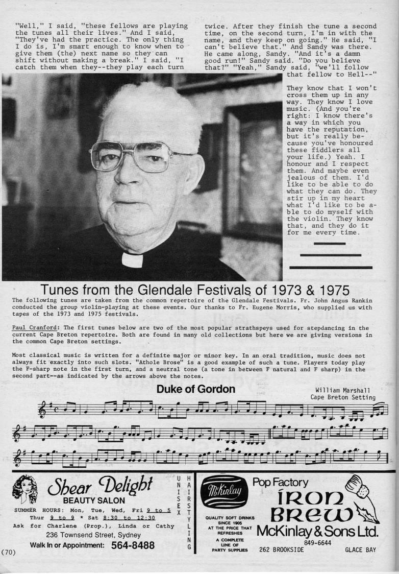 Well, I said, "these fellows are playing the tunes all their lives." And I said, "They've had the practice. The only thing I do is, I'm smart enough to know when to ' give them (the) next name so they can shift without making a break," I said, "I catch them when they--they play each turn twice. After they finish the tune a second time, on the second turn, I'm in with the name, and they keep on going." He said, "I can't believe that." And Sandy was there. He came along, Sandy. "And it's a damn good run!" Sandy said. "Do you believe that?" "Yeah," Sandy said, "we'll follow that fellow to Hell--" They know that I won't cross them up in any way. They know I love music. (And you're right: I know there's a way in which you have the reputation, but it's really be? cause you've honoured these fiddlers all your life.) Yeah. I honour and I respect them. And maybe even jealous of them. I'd like to be able to do what they can do. They stir up in my heart what I'd like to be a- ble to do myself with the violin. They know that, and they do it for me every time. Tunes from the Glendale Festivals of 1973 & 1975 The following tunes are taken from the common repertoire of the Glendale Festivals. Fr. John Angus Rankin conducted the group violin-playing at these events. Our thanks to Fr. Eugene Morris, who supplied us with tapes of the 1973 and 1975 festivals. Paul Cranford; The first tunes below are two of the most popular strathspeys used for stepdancing in the current Cape Breton repertoire. Both are found in many old collections but here we are giving versions in the common Cape Breton settings. . Most classical music is written for a definite major or minor key. In an oral tradition, music does not always fit exactly into such slots. "Athole Brose" is a good example of such a tune. Players today play the F-sharp note in the first turn, and a neutral tone (a tone in between F natural and F sharp) in the second part • as indicated by the arrows above the notes. Duke of Gordon William Marshall Cape Breton Setting ''i}i-i.U]rih'nu J-QjjJ-jij. ij i'jii[IL;m-ffirrrrr rn (Shear flight BEAUTY SALON u N I S SUMMER HOURS: Mon, Tue, Wed, Fri 9 to 5 v Thur 9 tg g * Sat 8:3Q tg 12:3Q Ask for Chariene (Prop.), Linda or Cathy 236 Townsend Street, Sydney Walk In or Appointment: 564-8488 (70) QUALITY SOFT DRINKS SINCE 1905 AT THE PRICE THAT REFRESHES A COMPLETE UNE OF PARTY SUPPUES Pbp Factory iRon McKinlay &Sons; Ltd. 849-6644 262 BROOKSIDE GLACE BAY