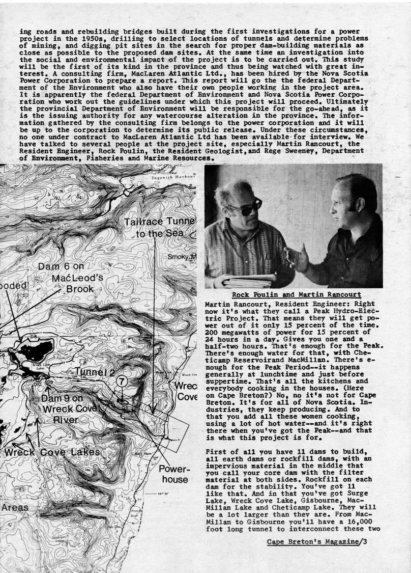 Published by Ronald Caplan on 1974/10/1 (1592 reads)ing roads and rebuilding bridges built during the first investigations for a power project in the 1950s, drilling to select locations of tunnels and determine problems of mining, and digging pit sites in the search for proper dam-building materials as close as possible to the proposed dam sites. At the same time an investigation into the social and environmental impact of the project is to be carried out. This study will be the first of its kind in the province and thus being watched with great in? terest. A consulting firm, MacLaren Atlantic Ltd., has been hired by the Nova Scotia Power Corporation to prepare a report. This report will go the the federal Depart? ment of the Environment who also have their own people working in the project area. It is apparently the federal Department of Environment and Nova Scotia Power Corpo? ration who work out the guidelines under which this project will proceed. Ultimately the provincial Department of Environment will be responsible for the go-ahead, as it is the issuing authority for any watercourse alteration in the province. The infor? mation gathered by the consulting firm belongs to the power corporation and it will be up to the corporation to determine its public release. Under these circumstances, no one under contract to MacLaren Atlantic Ltd has been available for interview. We have talked to several people at the project site, especially Martin Rancourt, the Resident Engineer, Rock Poulin, the Resident Geologist,and Rege Sweeney, Department of Environment, Fisheries and Marine Resources. Power? house Rock Poulin and Martin Rancourt Martin Rancourt, Resident Engineer: Right now it's what they call a Peak Hydro-Elec? tric Project. That means they will get po? wer out of it only 15 percent of the time. 200 megawatts of power for 15 percent of 24 hours in a day. Gives you one and a half-two hours. That's enough for the Peak. There's enough water for that, with Che? ticamp Reservoirand MacMillan. There's e- nough for the Peak Period • it happens generally at lunchtime and just before suppertirae. That's all the kitchens and everybody cooking in the houses. (Here on Cape Breton?) No, no it's not for Cape Breton. It's for all of Nova Scotia. In? dustries, they keep producing. And to that you add all these women cooking, using a lot of hot water • and it's right there when you've got the Peak • and that is what this project is for. First of all you have 11 dams to build, all earth dams or rockfill dams, with an impervious material in the middle that you call your core dam with the filter material at both sides. Rockfill on each dam for the stability. You've got 11 like that. And in that you've got Surge Lake, Wreck Cove Lake, Gisbourne, Mac? Millan Lake and Cheticamp Lake. They will be a lot larger than they are. From Mac? Millan to Gisbourne you'll have a 16,000 foot long tunnel to interconnect these two Cape Breton's Magazine/3