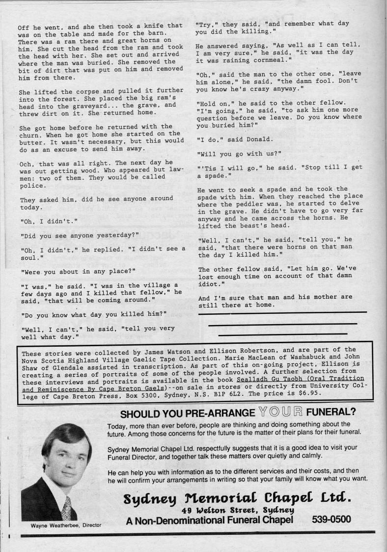 Published by Ronald Caplan on 1988/1/1 (478 reads)Off he went, and she then took a knife that was on the table and made for the barn. There was a ram there and great horns on him. She cut the head from the ram and took the head with her. She set out and arrived where the man was buried. She removed the bit of dirt that was put on him and removed him from there. She lifted the corpse and pulled it further into the forest. She placed the big ram's head into the graveyard... the grave, and threw dirt on it. She returned home. She got home before he returned with the churn. When he got home she started on the butter. It wasn't necessary, but this would do as an excuse to send him away. Och, that was all right. The next day he was out getting wood. Who appeared but law? men: two of them. They would be called police. They asked him, did he see anyone around today. "Oh, I didn't." "Did you see anyone yesterday?" "Oh, I didn't," he replied. "I didn't see a soul." "Were.you about in any place?" "I was," he said. "I was in the village a few days ago and I killed that fellow," he said, "that will be coming around." "Do you know what day you killed him?" "Well, I can't," he said, "tell you very well what day." "Try." they said, "and remember what day you did the killing." He answered saying, "As well as I can tell, I am very sure," he said, "it was the day it was raining cornmeal." "Oh," said the man to the other one, "leave him alone." he said, "the damn fool. Don't you know he's crazy anyway." "Hold on." he said to the other fellow. "I'm going," he said, "to ask him one more question before we leave. Do you know where you buried him?" "I do," said Donald. "Will you go with us?" "'Tis I will go," he said. "Stop till I get a spade." He went to seek a spade and he took the spade with him. When they reached the place where the peddler was, he started to delve in the grave. He didn't have to go very far anyway and he came across the horns. He lifted the beast's head. "Well, I can't," he said, "tell you." he said, "that there were horns on that man the day I killed him." The other fellow said. "Let him go. We've lost enough time on account of that damn idiot." And I'm sure that man and his mother are still there at home. These stories were collected by James Watson and Ellison Robertson, and are part of the Nova Scotia Highland Village Gaelic Tape Collection. Marie MacLean of Washabuck and John Shaw of Glendale assisted in transcription. As part of this on-going project. Ellison is creating a series of portraits of some of the people involved. A further selection from these interviews and portraits is available in the book Sealladh Gu Taobh (Oral Tradition and Reminiscence By Cape Breton Gaels)--on sale in stores or directly from University Col? lege of Cape Breton Press. Box 5300. Sydney, N.S. BIP 6L2. The price is $6.95. ' Wayne Weatherbee, Director SHOULD YOU PRE-ARRANGE "' ?? tlD [Hi FUNERAL? Today, more than ever before, people are thinking and doing something about the future. Among those concerns for the future is the matter of their plans for their funeral. Sydney Memorial Chapel Ltd. respectfully suggests that it is a good idea to visit your Funeral Director, and together talk these matters over quietly and calmly. He can help you with information as to the different services and their costs, and then he will confirm your arrangements in writing so that your family will know what you want. Si'cinei' JX'rrvorioi Chapel Ltd. 49 Welton Street, Sv'cCnei' A Non-Denominational Funeral Chapel 539-0500