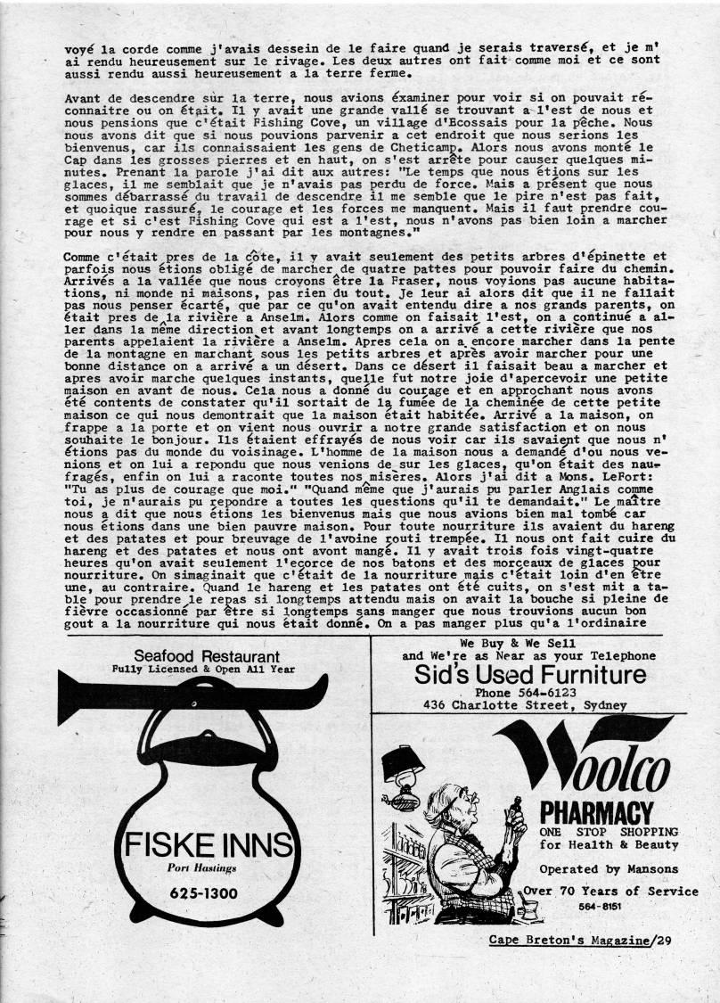 Published by Ronald Caplan on 1974/10/1 (506 reads)voy' la corde comme j'avals dessein de le faire quand je serais travers', et je ra' ai rendu heureusement sur le rivage, Les deux autres ont fait comme moi et ce sont aussi rendu aussi heureusement a la terre ferme, Avant de descendre sur la terre, nous avions Examiner pour voir si on pouvait re- connaitre ou on 't'-it, II y avait une grande vail' se trouvant a I'est de nous et nous pensions que c*'tait Fishing Cove, un village d'Ecossais pour la peche. Nous nous avons dit que si nous pouvions parvenir a cet endroit que nous serions les bienvenus, car ils connaissaient les gens de Cheticamp. Alors nous avons raonte le Cap dans les grosses pierres et en haut, on s*est arrete pour causer quelques mi? nutes, Prenant la parole j'ai dit aux autres: '*Le temps que nous Etions sur les glaces, il me semblait que je n'avals pas perdu de force, Mais a present que nous sommes debarrasse du travail de descendre il me semble que le pire n'est pas fait, et quoique rassur', le courage et les forces me manquent, Mais il faut prendre cou? rage et si c'est Fishing Cove qui est a l*est, nous n'avons pas bien loin a marcher pour nous y rendre en passant par les montagnes," Comme c'etait pres de la c'ote, il y avait seulement des petits arbres d'epinette et parfois nous etions oblige de marcher de quatre pattes pour pouvoir faire du chemin. Arrives a la vallee que nous croyons 'tre la Fraser, nous voyions pas aucune habita? tions, ni monde ni maisons, pas rien du tout. Je leur ai alors dit que il ne fallait pas nous penser ecarte, que par ce qu'on avait entendu dire a nos grands parents, on Itait pres de'la riviere a Anselm, Alors comme on faisait, I'est, on a continue a al? ler dans la meme direction'et avant longtemps on a arrive' a cette riviere que nos parents appelaient la riviere a Anselm, Apres cela on a. encore marcher dans la pente de la montagne en marchant sous les petits arbres et apres avoir marcher pour une bonne distance on a arrive a un desert, Dans ce desert il faisait beau a marcher et apres avoir marche quelques instants, quelle fut notre joie d'apercevoir une petite maison en avant de nous, Cela nous a donne du courage et en approchant nous avons ete contents de constater qu'il sortait de 1' ftimee de la cheminee de cette petite maison ce qui nous demontrait que la maison etait habitue. Arrive a la maison, on frappe a la porte et on vient nous ouvrir a notre grande satisfaction et on nous souhaite le bonjour, lis Etaient effrayes de nous voir car ils savaiept que nous n' Etions pas du monde du voisinage, L'homme de la maison nous a demande d'ou nous ve- nions et on lui a repondu que nous venions de'sur les glaces, qu'on 'tait des naut- frages, enfin on lui a raconte toutes nos miseres, Alors j'ai dit a Mons, LeFort: "Tu as plus de courage que moi," "Quand m'me que j'aurais pu parler Anglais comme toi, je n'aurais pu repondre a toutes les questions qu'il te demandait." Le maltre nous a dit que nous etions les bienvenus mais que nous avions bien mal tomb' car nous etions dans une bien pauvre maison. Pour toute nourriture ils avaient du hareng et des patates et pour breuvage de I'avoine routi trempee, II nous ont fait cuire du hareng et des patates et nous ont avont mange, II y avait trois fois vingt-quatre heures qu'on avait seulement I'ecorce de nos batons et des morceaux de glaces Pour nourriture. On simaginait que c'etait de la nourriture mais c'etait loin d'en etre line, au contraire, Quand le hareng et les patates ont It6 cuits, on s*est mit a ta? ble pour prendre'le repas si longtemps attendu mais on avait la bouche si pleine de fievre occasionne par "etre si longtemps sans manger que nous trouvions aucun bon gout a la nourriture qui nous etait donne. On a pas manger plus qu'a I'ordinaire Seafood Restaurant Fully Licensed & Open All Year We Buy & We Sell and We're as Near as your Telephone Sid s Used Furniture . Phone 564-6123 436 Charlotte Street, Sydney ONE STOP SHOPPING for Health & Beauty Operated by Mansons Over 70 Years of Service Cape Breton's Magazine/29