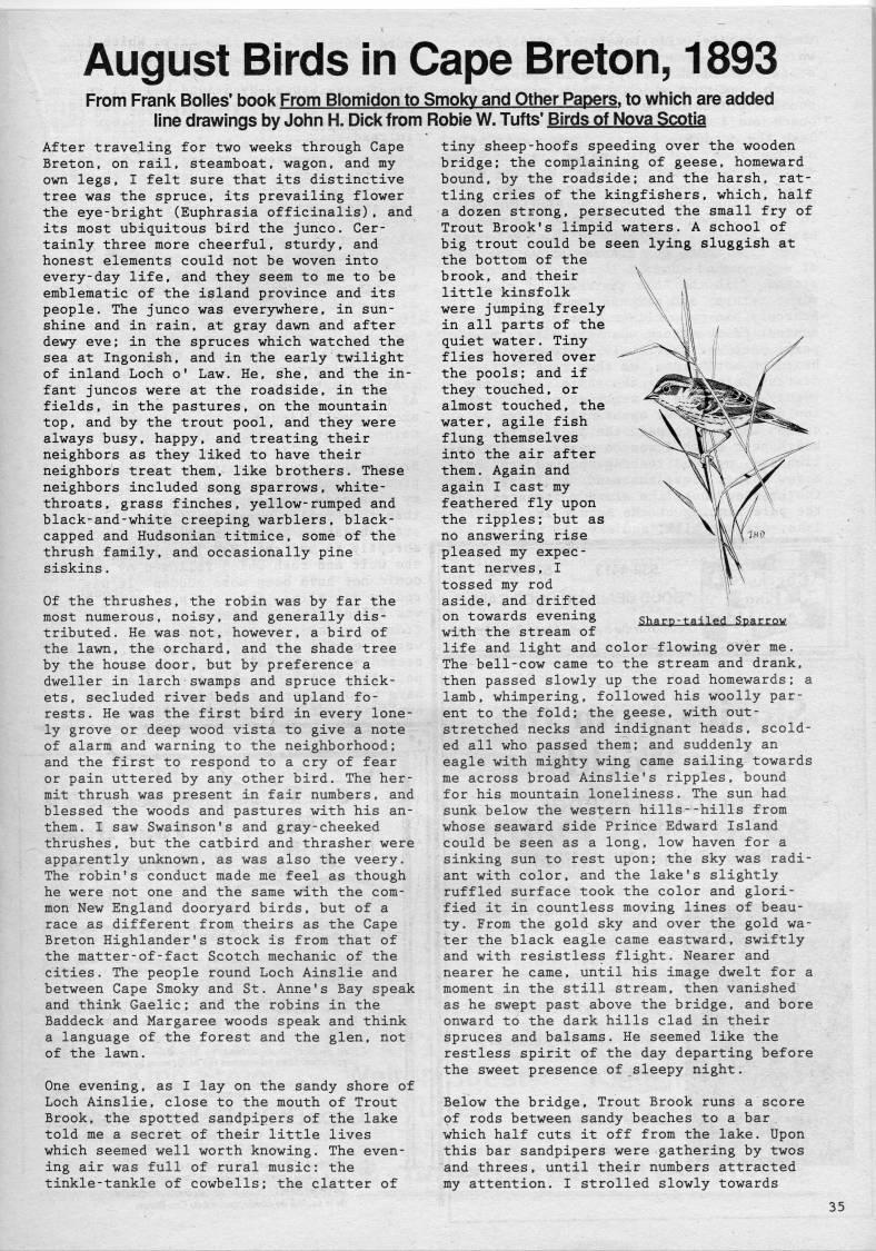 Published by Ronald Caplan on 1988/8/1 (593 reads)August Birds in Cape Breton, 1893 From Frank Bolles' book From Blomidon to Smoky and Otlier Papers, to which are added line drawings by John H. Dick from Robie W. Tufts' Birds of Nova Scotia After traveling for two weeks through Cape Breton, on rail, steamboat, wagon, and my own legs, I felt sure that its distinctive tree was the spruce, its prevailing flower the eye-bright (Euphrasia officinalis), and its most ubiquitous bird the junco. Cer? tainly three more cheerful, sturdy, and honest elements could not be woven into every-day life, and they seem to me to be emblematic of the island province and its people. The junco was everywhere, in sun? shine and in rain, at gray dawn and after dewy eve; in the spruces which watched the sea at Ingonish, and in the early twilight of inland Loch o' Law. He, she, and the in? fant juncos were at the roadside, in the fields, in the pastures, on the mountain top, and by the trout pool, and they were always busy, happy, and treating their neighbors as they liked to have their neighbors treat them, like brothers. These neighbors included song sparrows, white- throats, grass finches, yellow-rumped and black-and-white creeping warblers, black- capped and Hudsonian titmice, some of the thrush family, and occasionally pine siskins. Of the thrushes, the robin was by far the most numerous, noisy, and generally dis? tributed. He was not, however, a bird of the lawn, the orchard, and the shade tree by the house door, but by preference a dweller in larch swamps and spruce thick? ets, secluded river beds and upland fo? rests. He was the first bird in every lone? ly grove or deep wood vista to give a note of alarm and warning to the neighborhood; and the first to respond to a cry of fear or pain uttered by any other bird. The her? mit thrush was present in fair numbers, and blessed the woods and pastures with his an? them. I saw Swainson's and gray-cheeked thrushes, but the catbird and thrasher were apparently unknown, as was also the veery. The robin's conduct made me feel as though he were not one and the same with the com? mon New England dooryard birds, but of a race as different from theirs as the Cape Breton Highlander's stock is from that of the matter-of-fact Scotch mechanic of the cities. The people round Loch Ainslie and between Cape Smoky and St. Anne's Bay speak and think Gaelic; and the robins in the Baddeck and Margaree woods speak and think a language of the forest and the glen, not of the lawn. One evening, as I lay on the sandy shore of Loch Ainslie, close to the mouth of Trout Brook, the spotted sandpipers of the lake told me a secret of their little lives which seemed well worth knowing. The even? ing air was full of rural music: the tinkle-tankle of cowbells; the clatter of Sharp-tailed Sparrow tiny sheep-hoofs speeding over the wooden bridge; the complaining of geese, homeward bound, by the roadside; and the harsh, rat? tling cries of the kingfishers, which, half a dozen strong, persecuted the small fry of Trout Brook's limpid waters. A school of big trout could be seen lying sluggish at the bottom of the brook, and their little kinsfolk were jumping freely in all parts of the quiet water. Tiny flies hovered over the pools; and if they touched, or almost touched, the water, agile fish flung themselves into the air after them. Again and again I cast my feathered fly upon the ripples; but as no answering rise pleased my expec? tant nerves, I tossed my rod aside, and drifted on towards evening with the stream of life and light and color flowing over me. The bell-cow came to the stream and drank, then passed slowly up the road homewards; a lamb, whimpering, followed his woolly par? ent to the fold; the geese, with out? stretched necks and indignant heads, scold? ed all who passed them; and suddenly an eagle with mighty wing came sailing towards me across broad Ainslie's ripples, bound for his mountain loneliness. The sun had sunk below the western hills--hills from whose seaward side Prince Edward Island could be seen as a long, low haven for a sinking sun to rest upon; the sky was radi? ant with color, and the lake's slightly ruffled surface took the color and glori? fied it in countless moving lines of beau? ty. From the gold sky and over the gold wa? ter the black eagle came eastward, swiftly and with resistless flight. Nearer and nearer he came, until his image dwelt for a moment in the still stream, then vanished as he swept past above the bridge, and bore onward to the dark hills clad in their spruces and balsams. He seemed like the restless spirit of the day departing before the sweet presence of sleepy night. Below the bridge. Trout Brook runs a score of rods between sandy beaches to a bar which half cuts it off from the lake. Upon this bar sandpipers were gathering by twos and threes, until their numbers attracted my attention. I strolled slowly towards