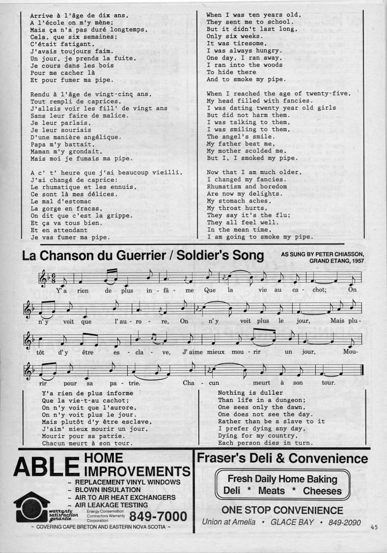 Published by Ronald Caplan on 1988/8/1 (441 reads)Arrive k I'age de dix ans, A l'6cole on m'y m'ne; Mais ga n'a' pas dur6 longtemps, Cela, que six semaines; C'6tait fatigant, J'avals toujours faim. Un jour, je prends la fuite, Je cours dans les bois Pour me cacher 1' Et pour fumer ma pipe. Rendu k 1'Sge de vingt-cinq ans. Tout rempli de caprices, J'allais voir les fill' de vingt ans Sans leur faire de malice. Je leur parlais, Je leur souriais D'une mani're ang'lique. Papa m'y battait, Maman m'y grondait, Mais moi je fumais ma pipe. Ac' t' heure que j'ai beaucoup vieilli, J'ai change de caprice: Le rhumatique et les ennuis, Ce sont 1' mes d'lices. Le mal d'estomac La gorge en fracas, On dit que c'est la grippe. Et ga va tous bien. Et en attendant Je vas fumer ma pipe. When I was ten years old. They sent me to school. But it.didn't last long. Only six weeks. It was tiresome, I was always hungry. One day, I ran away, I ran into the woods To hide there And to smoke my pipe. When I reached the age of twenty-five. My head filled with fancies. I was dating twenty year old girls But did not harm them. I was talking to them, I was smiling to them. The angel's smile. My father beat me. My mother scolded me. But I, I smoked my pipe. Now that I am much older, I changed my fancies, Rhumatism and boredom Are now my delights. My stomach aches, My throat hurts, They say it's the flu; They all feel well. In the mean time, I am going to smoke my pipe. La Chanson du Guerrier / Soldier's Song AS SUNG BY PETER CHIASSON, GRAND ETANG. 1957 rir pour sa pa - trie. Cha Y'a rien de plus informe Que la vie-t-au cachot; On n'y voit que I'aurore, On n'y voit plus le jour. Mais plutot d'y etre esclave, J'aim' mieux mourir un jour, Mourir pour sa patrie. Chacun meurt k son tour. 1 meurt Nothing is duller Than life in a dungeon; One sees only the dawn. One does not see the day. Rather than be a slave to it I prefer dying any day. Dying for my country. Each person dies in turn. ADLC IMPROVEMENTS m - REPLACEMENT VINYL WINDOWS ~ BLOWN INSULATION ~ AIR TO AIR HEAT EXCHANGERS ~ AIR LEAKAGE TESTING watZanty Energy Conservation *?''J'?0/l Contractors Warranty gflxartUA Corporation COVERING CAPE BRETON AND EASTERN NOVA SCOTIA - 849-7000 Fraser's Deli & Convenience /f= Fresh Daily Home Baking Deli * Meats * Cheeses ONE STOP CONVENIENCE Union at Amelia • GI-ACEBAY • 849-2090