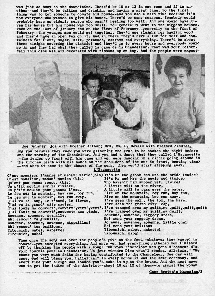 Published by Ronald Caplan on 1975/3/31 (670 reads)was just as busy as the downstairs. There'd be 10 or 12 in one room and 15 in an? other • and they'd be talking and drinking and having a great time. So the first thing was to get someone to donate his house • and you had a hard time because it's not everyone who wanted to give his house. There'd be many reasons. Somebody would probably have an elderly person who wasn't feeling too well. And one would have gi? ven his house but his house was too small. You generally went to the biggest houses. Then on the last of January and on the first of February • generally on the first of February • the younger men would get together. They'd use sleighs for hauling wood and they'd have an open box on it. And. in there they'd have a tub for meat and con? tainers for flour, sugar, salt, potatoes, carrots and everything. There'd be about three sleighs covering the district and they'd go to every house and everybody would go in and they had what they called la cane de la Chandeleur. That was your leader. Well this cane was all decorated with ribbons up on top. And the people were expect- Joe Delaney; Joe with brother Arthur; Mrs. Vfai. D. Deveau with blessed candles. ing you because they knew you were gathering the grub to be cooked the night before and the morning of the Chandeleur. And you had a dance that they called L'Escaouette • the leader up front with his cane and you were dancing in a circle going around in the kitchen (each with his hands on the shoulders of the one in front, beating time) • and when it came to the chorus of the song, then you'd start stepping away. L'Escaouette C'est monsieur I'marie et madam'' marie'(bis) C'est monsieur, madam' maries (bis) Qu'ont pas encor soupe. (bis) Un p'tit moulin sur la riviere, Un p'tit moulin pour passer I'eau. Le feu sur la raontain, boy run, boy run, Le feu sur la montain, boy run away. J'ai vu le loup, le r'nard, le lievre, J'ai vu la grand' cite sauter, J'ai foule ma convert',couvert',vert',vert'. J'ai foule ma convert'yCouverte aux pieds. Aouenne, aouenne, guenille. AhI rescou' ta guenille, Aouenne, aouenne, aouenne, nippailloni Ahl rescou' tes brillons. Tibounich, nabet, nabettel Tibounich, naba! It's Mr the groom and Mrs the bride (twice) It's Mr and Mrs the newly wed (twice) Who haven't had supper yet. (twice) A little mill on the river, A little mill to pass over the water. Fire on the mountain, boy run, boy run. Fire on the mountain, boy run away. I've seen the wolf, the fox, the hare, I've seen the grand city leap, I've tramped over my quilt,my quilt,quilt,quilt I've tramped over my quilt,my quilt. Aouenne, aouenne, raggedy dress. He! mend your raggedy dress, Aouenne, aouenne, aouenne, little oneI Het mend your brillons Tibotuiich, nabet, nabettel Tibounich, nabaS Then once the song was over the people'd give us the food • whatever they wanted to donate • you accepted everything. And once you had everything gathered you finished off by thanking the people with a song: "En vous r'merciont mes gens d'honneur d'a- voir fournis pour La Chandeleur. Un jour viendra Dieu vous'l rendra. Alleluia." "We thank you very much folks for having contributed to the Chandeleur. One day will come, God will bless you. Halleluia." In every house it was the same ceremony. And every time your sleigh was loaded you'd take it up to the house. And the next move was to get the ladies of the district • about 10 or 12 of them--to assist the woman ..... ' Cape Breton's Magazine/3