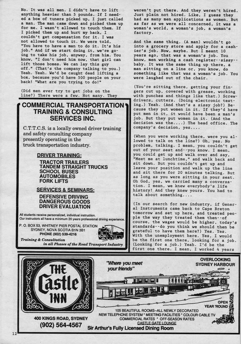 No. It was all men. I didn't have to lift anything heavier than 5 pounds. If I need? ed a box of tuners picked up, I just called a man. The man came down and picked them up for me. I wasn't allowed to touch them. If I picked them up and hurt my back, I couldn't get compensation for it. I was not allowed to touch it. We were told, "You have to have a man to do it. It's his job." And if we start doing it, we're go? ing to take his job, anyway, from him. You know, "I don't need him now, that girl can lift those boxes. We can lay this guy off." (That's the company talking to you.) Yeah. Yeah. We'd be caught dead lifting a box, because you'd have 500 people on your back! "What are you trying to do!" (Did men ever try to get jobs on the line?) There were a few. Not many. They ' COMMERCIAL TRANSPORTATION TRAINING & CONSULTING SERVICES INC. C.T.T.C.S. is a locally owned driver training and safety consulting company presently operating in the truck transportation industry. DRIVER TRAINING: TRACTOR TRAILERS TANDEM STRAIGHT TRUCKS SCHOOL BUSES AUTOMOBILES FORK LIFTS SERVICES & SEMINARS: DEFENSIVE DRIVING DANGEROUS GOODS DRIVER EVALUATION All students receive personalized, individual instruction. Our instructors all have a minimum 20 years professional driving experience. P. O. BOX 53, WHITNEY PIER POSTAL STATION SYDNEY, NOVA SCOTIA B1N 381 PHONE (902) 539-4216 Training & Consultation in all Phases of the Road Transport Industry weren't put there. And they weren't hired. Just plain not hired. Like, I guess they had as many men applications as women. But as far as we were all concerned, it was a woman's world, a woman's job, a woman's factory. And the same thing. (A man) wouldn't go into a grocery store and apply for a cash? ier's job. Now, maybe. But I meant 10 years ago, that was a woman's job. You know, men working a cash register--sissy-- baby. It was the same thing up there, a man sitting on a line or, you know, do something like that was a woman's job. You were laughed out of the chair. (You're sitting there, getting your fin? gers cut up, covered with grease, working with punches and things like that.) Screw? drivers, cutters. (Doing electronic test? ing.) Yeah. (And that's a sissy job?) Be? cause they put women in it. If they'd have put men in it, it would have been a man's job. But they put women in it. (And the decision was the....) The head office. The company's decision, yes.... (When you were working there, were you al? lowed to talk on the line?) Oh, yes. No problem, talking. I mean, you couldn't get out of your seat and--you know. I mean, you could get up and walk over and say, "Meet me at lunchtime," and walk back and sit down. But you couldn't get up and leave your position and walk up the line and sit there for 20 minutes talking. But as long as you were sitting in your seat. Oh God, yes, we carried many a conversa? tion. I mean, we knew everybody's life history! And they knew yours. You had to talk about something.... (In our search for new industry, if Gener? al Instruments came back to Cape Breton tomorrow and set up here, and treated peo? ple the way they treated them then--of course, the wages would be higher, today's standards--do you think we should then be grateful to have them here?) Yes. Yes. With the unemployment here. Yes, I would be the first one there, looking for a job. (Looking for a job.) Yeah. I'd be the first one there. I mean, I worked 4 years OVERLOOKING SYDNEY HARBOUR 400 KINGS ROAD, SYDNEY ??564-4567 (902) i 105 BEAUTIFUL ROO!'S~ALL NEWLY DECORATED NEW TELEPHONE SYSTEM * MEETING FACILITIES * COLOUR CABLE TV COMMERCIAL RATES * OFF-SEASON RATES CASTLE GATE LOUNOE Sir Arthur's Fully Licensed Dining Room