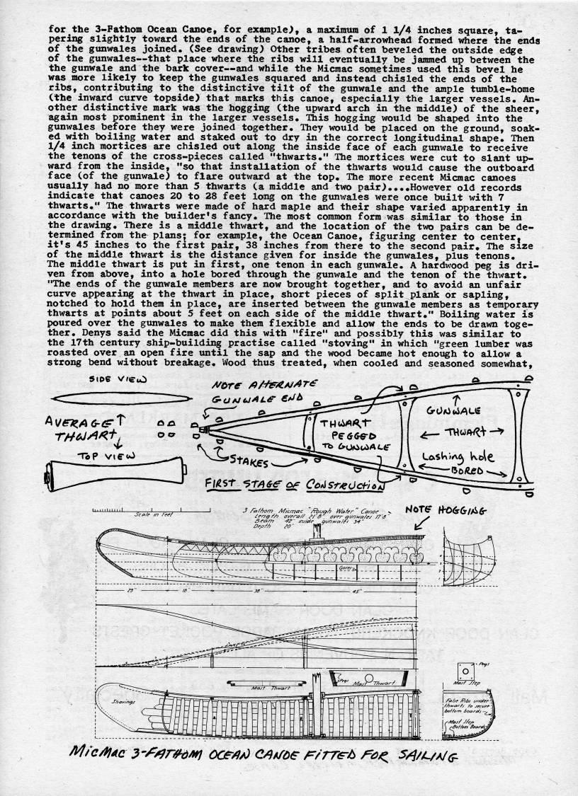 Published by Ronald Caplan on 1975/3/31 (835 reads)for the 3-Fathom Ocean Canoe, for example', a maximum of 1 1/4 inches square, ta? pering slightly tov/ard the ends of the canoe, a half-arrowhead formed where the ends of the gunwales joined. (See drawing) Other tribes often beveled the outside edge of the gunwales • that place where the ribs will eventually be jammed up between the the gunwale and the bark cover • and while the Micmac sometimes used this bevel he was more likely to keep the gunwales squared and instead chisled the ends of the ribs, contributing to the distinctive tilt of the gunwale and the ample tumble-home (the inward curve topside) that marks this canoe, especially the larger vessels. An? other distinctive mark was the hogging (the upward arch in the middle) of the sheer, again most prominent in the larger vessels. This hogging would be shaped into the gunwales before they were joined together. They would be placed on the ground, soak? ed with boiling water and staked out to dry in the correct longitudinal shape. Then 1/4 inch mortices are chisled out along the inside face of each gimwale to receive the tenons of the cross-pieces called "thwarts." The mortices were cut to slant up? ward from the inside, "so that installation of the thwarts would cause the outboard face (of the gunwale) to flare outward at the top. The more recent Micmac canoes usually had no more than 5 thwarts (a middle and two pair)....However old records indicate that canoes 20 to 28 feet long on the gunwales were once built with 7 thwarts." The thwarts were made of hard maple and their shape varied apparently in accordance with the builder's fancy. The most common form was similar to those in the drawing. There is a middle thwart, and the location of the two pairs can be de? termined from the plans; for example, the Ocean Canoe, figuring center to center, it's 45 inches to the first pair, 38 inches from there to the second pair. The size of the middle thwart is the distance given for inside the gunwales, plus tenons. The middle thwart is put in first, one tenon in each gunwale. A hardwood peg is dri? ven from above, into a hole bored throtigh the gunwale and the tenon of the thwart. "The ends of the gunwale members are now brought together, and to avoid an unfair curve appearing at the thwart in place, short pieces of split plank or sapling, notched to hold them in place, are inserted between the gunwale members as temporary thwarts at points about 5 feet on each side of the middle thwart." Boiling water is poured over the gunwales to make them flexible and allow the ends to be drawn toge? ther. Denys said the Micmac did this with "fire" and possibly this was similar to the 17th century ship-building practise called "stoving" in which "green lumber was roasted over an open fire until the sap and the wood became hot enough to allow a strong bend without breakage. Wood thus treated, when cooled and seasoned somewhat. S r??//fo' Micmac ~/?oua/? IVaffr" Ca'of v H'Tff l'(Sf6r//'6' /fr?o//7 at'fro// '/'3 oyirr gi/niva/fj /7'S ' Mi'cAiM '-/''nhiAiri oceA/ic'tfoe p/rre't /=a/' 5/i/t.'/j('