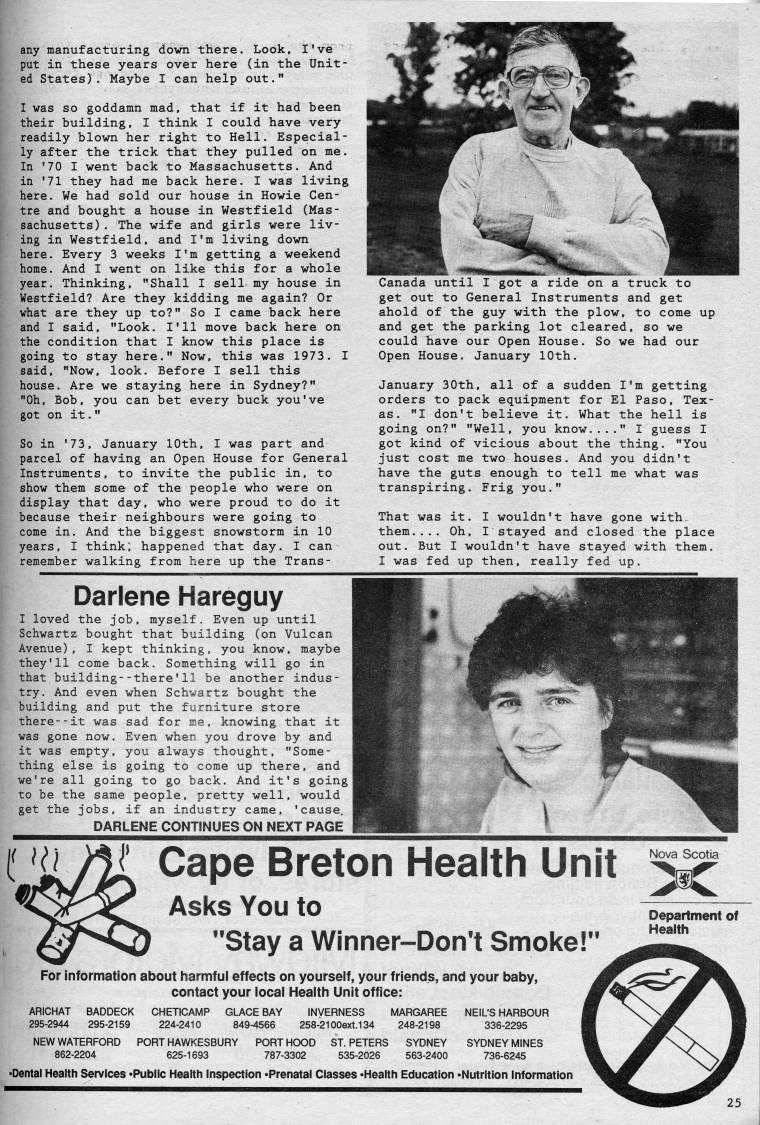 any manufacturing down there. Look, I've put in these years over here (in the Unit? ed States). Maybe I can help out." I was so goddamn mad, that if it had been their building, I think I could have very readily blown her right to Hell. Especial? ly after the trick that they pulled on me. In '70 I went back to Massachusetts. And in '71 they had me back here. I was living here. We had sold our house in Howie Cen? tre and bought a house in Westfield (Mas? sachusetts) . The wife and girls were liv? ing in Westfield, and I'm living down here. Every 3 weeks I'm getting a weekend home. And I went on like this for a whole year. Thinking, "Shall I sell my house in Westfield? Are they kidding me again? Or what are they up to?" So I came back here and I said, "Look. I'll move back here on the condition that I know this place is going to stay here." Now, this was 1973. I said, "Now, look. Before I sell this house. Are we staying here in Sydney?" "Oh, Bob, you can bet every buck you've got on it. " So in '73, January 10th, I was part and parcel of having an Open House for General Instruments, to invite the public in, to show them some of the people who were on display that day, who were proud to do it because their neighbours were going to come in. And the biggest snowstorm in 10 years, I think; happened that day. I can remember walking from here up the Trans- Canada until I got a ride on a truck to get out to General Instruments and get ahold of the guy with the plow, to come up and get the parking lot cleared, so we could have our Open House. So we had our Open House. January 10th. January 30th, all of a sudden I'm getting orders to pack equipment for El Paso, Tex? as. "I don't believe it. What the hell is going on?" "Well, you know...." I guess I got kind of vicious about the thing. "You just cost me two houses. And you didn't have the guts enough to tell me what was transpiring. Frig you." That was it. I wouldn't have gone with- them.... Oh, I stayed and closed the place out. But I wouldn't have stayed with them. I was fed up then, really fed up. Darlene Hareguy I loved the job, myself. Even up until Schwartz bought that building (on Vulcan Avenue), I kept thinking, you know, maybe they'll come back. Something will go in that building--there'11 be another indus? try. And even when Schwartz bought the building and put the furniture store there--it was sad for me, knowing that it was gone now. Even when you drove by and it was empty, you always thought, "Some? thing else is going to come up there, and we're all going to go back. And it's going to be the same people, pretty well, would get the jobs, if an industry came, 'cause. DARLENE CONTINUES ON NEXT PAGE I' Cape Breton Health Unit Asks You to "Stay a Winner-Don't Smoke!" For information about harmful effects on yourself, your friends, and your baby, contact your local Health Unit office: Nova Scotia Department of Health ARICHAT 295-2944 BADDECK 295-2159 CHETICAMP 224-2410 GLACE BAY 849-4566 INVERNESS 258-21006x1.134 NEW WATERFORD 862-2204 PORT HAWKESBURY 625-1693 PORT HOOD 787-3302 ST. PETERS 535-2026 MARGAREE 248-2198 SYDNEY 563-2400 NEIL'S HARBOUR 336-2295 SYDNEY MINES 736-6245 • Dental Health Services 'Public Health Inspection • Prenatal Classes • Health Education • Nutrition Information