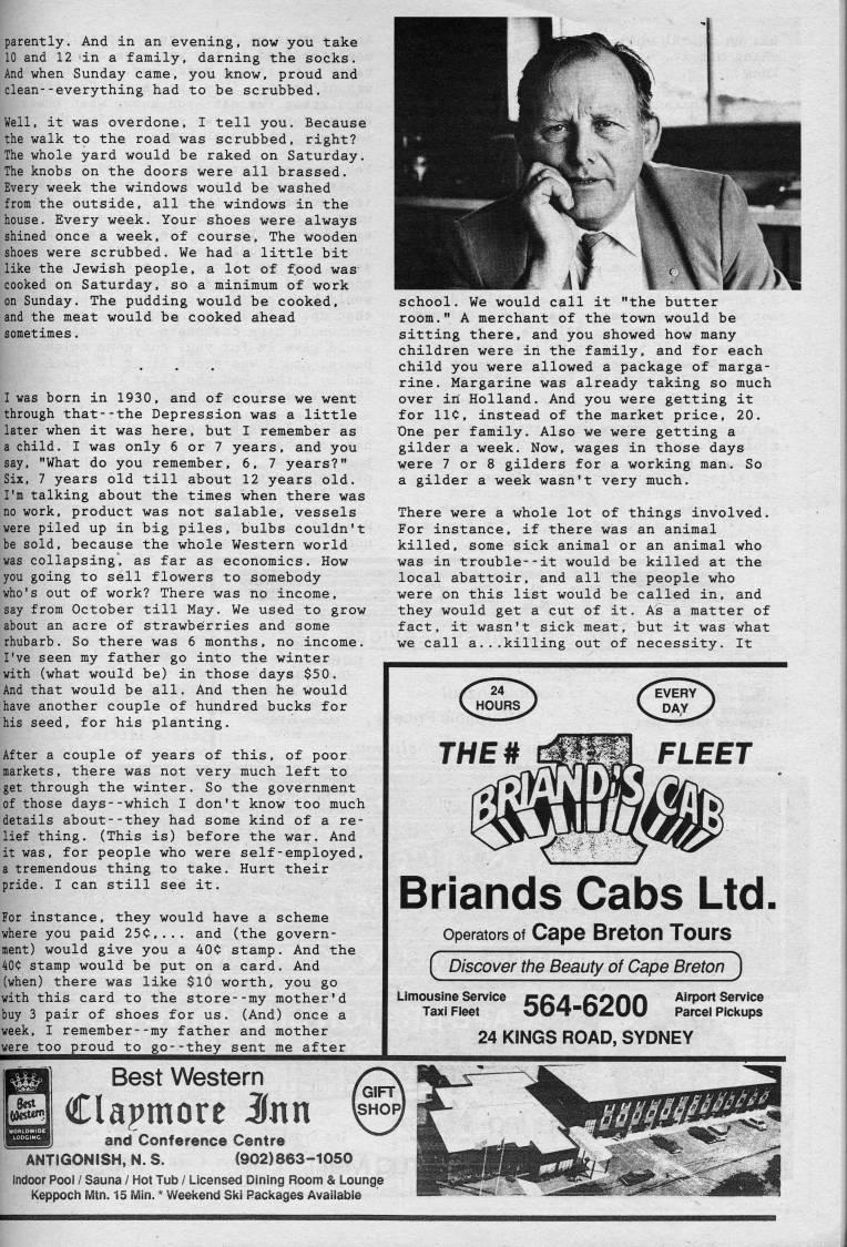 Published by Ronald Caplan on 1989/1/1 (250 reads)patently. And in an evening, now you take 10 and 12 in a family, darning the socks. And when Sunday came, you know, proud and clean--everything had to be scrubbed. Well, it was overdone, I tell you. Because the walk to the road was scrubbed, right? The whole yard would be raked on Saturday. The knobs on the doors were all brassed. Every week the windows would be washed from the outside, all the windows in the house. Every week. Your shoes were always shined once a week, of course. The wooden shoes were scrubbed. We had a little bit like the Jewish people, a lot of food was cooked on Saturday, so a minimum of work on Sunday. The pudding would be cooked, and the meat would be cooked ahead sometimes. I was born in 1930, and of course we went through that--the Depression was a little later when it was here, but I remember as a child. I was only 6 or 7 years, and you say, "What do you remember, 6, 7 years?" Six, 7 years old till about 12 years old. I'm talking about the times when there was no work, product was not salable, vessels were piled up in big piles, bulbs couldn't be sold, because the whole Western world was collapsing, as far as economics. How you going to sell flowers to somebody who's out of work? There was no income, say from October till May. We used to grow about an acre of strawberries and some rhubarb. So there was 6 months, no income. I've seen my father go into the winter with (what would be) in those days $50. And that would be all. And then he would have another couple of hundred bucks for his seed, for his planting. After a couple of years of this, of poor markets, there was not very much left to get through the winter. So the government of those days--which I don't know too much details about--they had some kind of a re? lief thing. (This is) before the war. And it was, for people who were self-employed, a tremendous thing to take. Hurt their pride. I can still see it. For instance, they would have a scheme where you paid 25C,... and (the govern? ment) would give you a 40<; stamp. And the 40C stamp would be put on a card. And (when) there was like $10 worth, you go with this card to the store--my mother'd buy 3 pair of shoes for us. (And) once a week, I remember--my father and mother were too proud to go--they sent me after school. We would call it "the butter room." A merchant of the town would be sitting there, and you showed how many children were in the family, and for each child you were allowed a package of marga? rine. Margarine was already taking so much over in Holland. And you were getting it for lie, instead of the market price, 20. One per family. Also we were getting a gilder a week. Now, wages in those days were 7 or 8 gilders for a working man. So a gilder a week wasn't very much. There were a whole lot of things involved. For instance, if there was an animal killed, some sick animal or an animal who was in trouble--it would be killed at the local abattoir, and all the people who were on this list would be called in, and they would get a cut of it. As a matter of fact, it wasn't sick meat, but it was what we call a...killing out of necessity. It THE' FLEET Briands Cabs Ltd. Operators of Cape Breton Tours [ Discover the Beauty of Cape Breton J Limousine Service gZCtA CtOff Airport Service Taxi Fieet OD4~D'UU Parcel Picltups 24 KINGS ROAD, SYDNEY Best Western Clapmore Jnn and Conference Centre ANTIGONISH, N. S. (902)863-1050 Indoor Pool / Sauna / Hot Tub / Licensed Dining Room & Lounge Keppoch Mtn. 15 Min. * Weekend Ski Packages Available