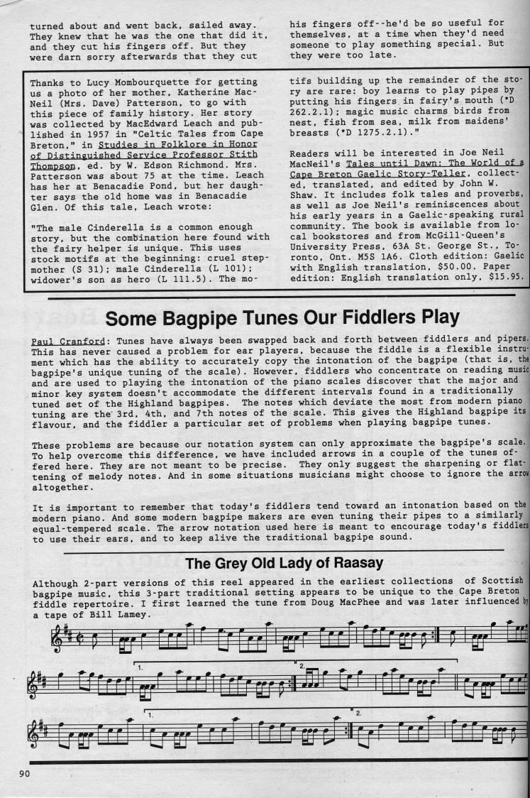 Published by Ronald Caplan on 1989/1/1 (271 reads)turned about and went back, sailed away. They knew that he was the one that did it, and they cut his fingers off. But they were darn sorry afterwards that they cut his fingers off--he'd be so useful for themselves, at a time when they'd need someone to play something special. But they were too late. Thanks to Lucy Mombourquette for getting us a photo of her mother, Katherine Mac? Neil (Mrs. Dave) Patterson, to go with this piece of family history. Her story was collected by MacEdward Leach and pub? lished in 1957 in "Celtic Tales from Cape Breton," in Studies in Folklore in Honor of Distinguished Service Professor Stith Thompson, ed. by W. Edson Richmond. Mrs. Patterson was about 75 at the time. Leach has her at Benacadie Pond, but her daugh? ter says the old home was in Benacadie Glen. Of this tale. Leach wrote: "The male Cinderella is a common enough story, but the combination here found with the fairy helper is unique. This uses stock motifs at the beginning: cruel step? mother (S 31); male Cinderella (L 101); widower's son as hero (L 111.5). The mo? tifs building up the remainder of the sto? ry are rare: boy learns to play pipes by putting his fingers in fairy's mouth (*D 262.2.1); magic music charms birds from nest, fish from sea, milk from maidens' breasts (*D 1275.2.1)." Readers will be interested in Joe Neil MacNeil's Tales until Dawn: The World of a | Cape Breton Gaelic Storv-Teller. collect? ed, translated, and edited by John W. Shaw. It includes folk tales and proverbs, as well as Joe Neil's reminiscences about his early years in a Gaelic-speaking rural community. The book is available from lo? cal bookstores and from McGill-Queen's University Press, 63A St. George St., To? ronto, Ont. M5S 1A6. Cloth edition: Gaelic with English translation, $50.00. Paper edition: English translation only, $15.95. Some Bagpipe Tunes Our Fiddlers Play Paul Cranford: Tunes have always been swapped back and forth between fiddlers and pipers. This has never caused a problem for ear players, because the fiddle is a flexible instru? ment which has the ability to accurately copy the intonation of the bagpipe (that is. the bagpipe's unique tuning of the scale). However, fiddlers who concentrate on reading music and are used to playing the intonation of the piano scales discover that the major and minor key system doesn't accommodate the different intervals found in a traditionally tuned set of the Highland bagpipes. The notes which deviate the most from modern piano tuning are the' 3rd, 4th, and 7th notes of the scale. This gives the Highland bagpipe its flavour, and the fiddler a particular set of problems when playing bagpipe tunes. These problems are because our notation system can only approximate the bagpipe's scale. To help overcome this difference, we have included arrows in a couple of the tunes of? fered here. They are not meant to be precise. They only suggest the sharpening or flat? tening of melody notes. And in some situations musicians might choose to ignore the arrow altogether. It is important to remember that today's fiddlers tend toward an intonation based on the modern piano. And some modern bagpipe makers are even tuning their pipes to a similarly equal-tempered scale. The arrow notation used here is meant to encourage today's fiddlers to use their ears, and to keep alive the traditional bagpipe sound. The Grey Old Lady of Raasay Although 2-part versions of this reel appeared in the earliest collections of Scottish ' bagpipe music, this 3-part traditional setting appears to be unique to the Cape Breton fiddle repertoire. I first learned the tune from Doug MacPhee and was later influenced byl a tape of Bill Lamey. rf0 • P r,,' 0 , • ftip r,f , ??r 0 ? , ?? F . # _ ?? ni -m 1 • < • 90
