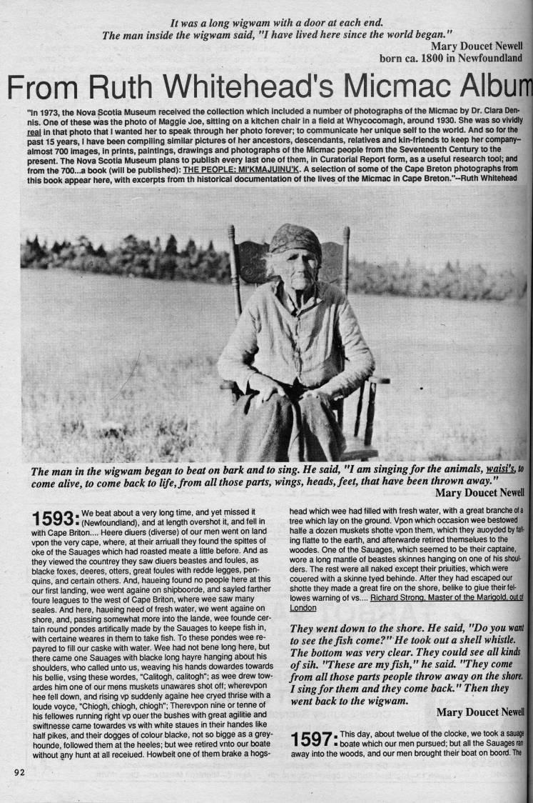 Published by Ronald Caplan on 1989/1/1 (818 reads)It was a long wigwam with a door at each end. The man inside the wigwam said, "I have lived here since the world began." Mary Doucet Newell born ca. 1800 in Newfoundland From Ruth Whitehead's Micmac Album "In 1973, the Nova Scotia Museum received the collection which included a number of photographs of the Micmac by Dr. Clara Den? nis. One of these was the photo of Maggie Joe, sitting on a kitchen chair in a field at Whycocomagh, around 1930. She was so vividly rgai in that photo that I wanted her to speak through her photo forever; to communicate her unique self to the world. And so for the past 15 years, I have been compiling similar pictures of her ancestors, descendants, relatives and kin-friends to keep her company- almost 700 images, in prints, paintings, drawings and photographs of the Micmac people from the Seventeenth Century to the present. The Nova Scotia Museum plans to publish every last one of them, in Curatorial Report form, as a useful research tool; and from the 700...a book (will be published): THE PEOPLE: MI'KMAJUINU'K. A selection of some of the Cape Breton photographs from this book appear here, with excerpts from th historical documentation of the lives of the Micmac in Cape Breton."-Ruth Whitehead The man in the wigwam began to beat on bark and to sing. He said, "I am singing for the animals, waist's, to come alive, to come back to life, from all those parts, wings, heads, feet, that have been thrown away." Mary Doucet Newell ??4 CQQ ?? We beat about a very long time, and yet missed it I 090 ?? (Newfoundland), and at length overshot it, and fell in with Cape Briton.... Heere diuers (diverse) of our men went on land vpon the very cape, where, at their arriuail they found the spittes of ol