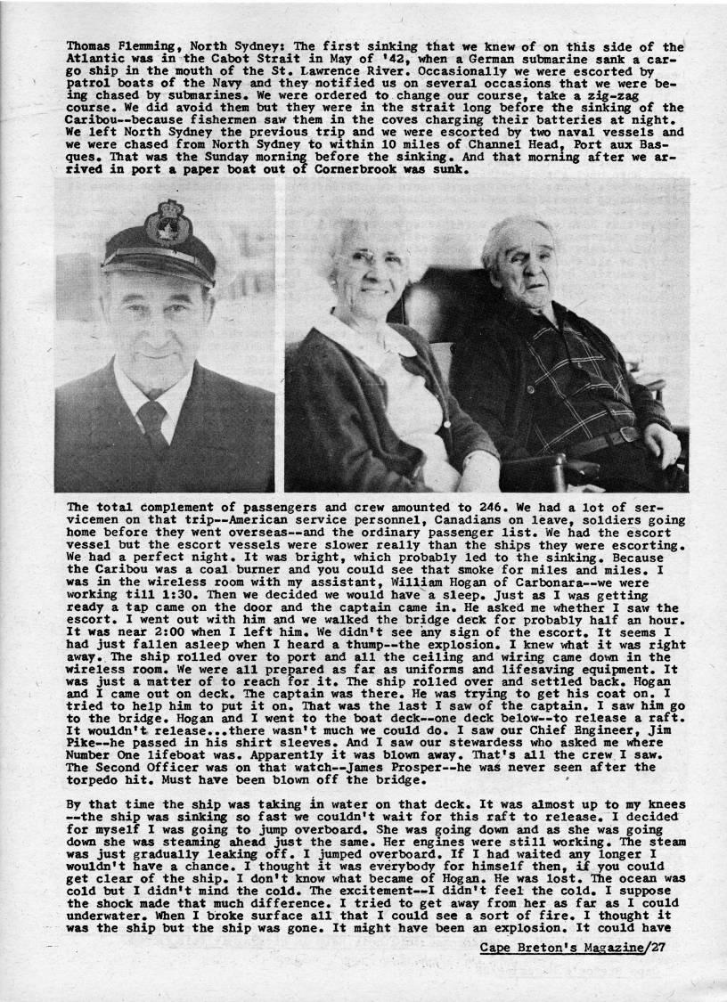 Published by Ronald Caplan on 1975/3/31 (1000 reads)Thomas Flemming, North Sydney: The first sinking that we knew of on this side of the Atlantic was in the Cabot Strait in May of '42, fhen a German submarine sank a car? go ship in the mouth of the St. Lawrence River, Occasionally we were escorted by patrol boats of the Navy and they notified us on several occasions that we were be? ing chased by sul'arines* We were ordered to change our course, take a zig-zag course. We did avoid them but they were in the strait long before the sinking of the Caribou • because fishermen saw them in the coves charging their batteries at night* We left North Sydney the previous trip and we were escorted by two naval vessels and we were chased from North Sydney to within 10 miles of Channel Head, Port aux Bas? ques* That was the Sunday morning before the sinking. And that morning after we ar? rived in port a paper boat out of Comerbrook was sunk. M'S The total domplement of passengers and crew amounted to 246. We had a lot of ser? vicemen on that trip • American service personnel, Canadians on leave, soldiers going home before they went overseas • and the ordinary passenger list. We had the escort vessel but the escort vessels were slower really than the ships they were escorting. We had a perfect night. It was bright, which probably led to the sinking. Because the Caribou was a coal burner and you could see that smoke for miles and miles. I was in the wireless room with my assistant, William Hogan of Carbonara • we were working till 1:30. Then we decided we would have a sleep. Just as I was getting ready a tap came on the door and the captain came in. He asked me whether I saw the escort. I went out with him and we walked the bridge deck for probably half an hour. It was near 2:00 when I left him. We didn't see any sign of the escort. It seems I had just fallen asleep when I heard a thump • the explosion. I knew vrtiat it was right away. The ship rolled over to port and all the ceiling and wiring came down in the wireless room. We were all prepared as far as uniforms and lifesavix' equijwient. It was just a matter of to reach for it. The ship rolled over and settled back. Hogan and I came out on deck. The captain was there. He was trying to get his coat on. I tried to help him to put it on. That was the last I saw of the captain. I saiv him go to the bridge. Hogan and I went to the boat deck • one deck below • to release a raft. It wouldn't release...there wasn't much we could do. I saw our Chief Engineer, Jim Pike • he passed in his shirt sleeves. And I saw our stewardess who asked me where Number One lifeboat was. Apparently it was blovm away. That's all the crew I saw. The Second Officer was on that watch • James Prosper • he was never seen after the torpedo hit. Must have been blown off the bridge. By that time the ship was taking in water on that deck. It was almost up to my knees • the ship was sinking so fast we couldn't wait for this raft to release. I decided for myself I was going to jump overboard. She was going down and as she was going down she was steaming ahead just the same. Her engines were still working. The steam was just gradually leaking off. I jumped overboard. If I had waited any longer I wouldn't have a chaoce. I thought it was everybody for himself then, if you could get clear of the ship. I don't know what became of Hogan. He was lost. ITie ocean was cold but I didn't mind the cold. The excitement • I didn't feel the cold. I suppose the shock made that much difference. I tried to get away from her as far as I could underwater. When I broke surface all that I could see a sort of fire. I thought it was the ship but the ship was gone. It might have been an explosion. It could have Cape Breton's Maga2ine/27