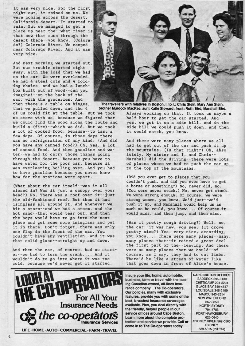 Published by Ronald Caplan on 1989/2/1 (293 reads)It was very nice. For the first night out, it rained on us. We were coming across the desert, California desert. It started to rain. But we managed to get a place up near the--what river is that now that runs through the desert there--you know. (Colora? do?) Colorado River. We camped near Colorado River. And it was very nice. And next morning we started out. But our trouble started right away, with the load that we had on the car. We were overloaded. We had 4 steel cots and 4 fold? ing chairs, and we had a lunch- box built out of wood--can you imagine!--on the back of the car, with the groceries. And then there's a table on hinges, that we pulled down, and the 4 of us could fit at the table. But we took no stove with us, because we figured that we could find the wood along the route and build a (fire)--which we did. But we took a lot of cooked food, because--to last a few days. Of course, in those days there was no refrigeration of any kind. (And did you have any canned food?) Oh, yes, a lot of canned food. And then gasoline and wa? ter- -we had to carry those things going through the desert. Because you have to have water for the poor car, because it was everlasting boiling over. And you had to have gasoline because you never knew how far the stations were apart. (What about the car itself--was it all closed in? Was it just a canopy over your head?) No. There was a roof over it--just the old-fashioned roof. But then it had isinglass all around it. And whenever we hit a storm--and we had a storm, and the hot sand--that would tear out. And then the boys would have to go into the next place and get some more isinglass and put it in there. Don't forget, there was only one flap in the front of the car. You couldn't have any ventilation. And it was that solid glass--straight up and down. And then the car, of course, had no start? er- -we had to turn the crank.... And it wouldn't do to go into where it was too cold, because we'd never get it started. The travellers with relatives in Boston, I. to r.: Chris Stein, Mary Ann Stein, brother Murdocl( MacRae, aunt Katie Steward; front: Ruth Bird, Marshall Bird. Always working on that. It took us maybe a half hour to get the car started. And-- yes, we got it on a side hill. And in the side hill we could push it down, and then it would catch, you know. And there were many places where we all had to get out of the car and push it up the mountains. (Is that right?) Oh, abso? lutely. My sister and I, and Chris-- Marshall did the driving--there were lots of places where we had to push the car up to the top of the mountains. (Did you ever get to places that you couldn't push, and did you ever have to get a horse or something?) No, never did, no. (You were never stuck.) No, never got stuck. We were strong enough. Of course, we were strong women, you know. We'd just--we'd push it up, and Marshall would help us as much as he could, you know.... Of course it would miss, and then jump, and then miss. (Was it pretty rough driving?) Well, no. the car--it was new, you see. (It drove pretty nice?) Yes, very nice, according, you know.... There were many places--many, many places that--it rained a great deal the first part of the--leaving. And there were so many places that we could--of course, as I say, they had to cut limbs. There'd be like a stream of water like that goes down in front of Alice's house. For All Your Insurance Needs oS the cO'Opetktoi' '' Insurance Services LIFE • HOME • AUTO • COMMERCIAL • FARM • TRAVEL Insure your life, home, automobile, business, farm or travel with the lead? ing Canadian-owned, all-lines insu? rance company... The Co-operators. Our policies, many with exclusive features, provide you with some of the best, broadest insurance coverages available. Plus, you deal directiy with the friendly, helpful people in our service offices around Cape Breton. Learn more about the complete pro? tection and service we provide. Call or come in to The Co-operators today. CAPE BRETON OFFICES: BADDECK 295-3130 CHETICAMP 224-3204 GLACE BAY 849-4547 LOUISDALE 345-2199 MABOU 945-2514 NEW WATERFORD 862-3350 NORTH SYDNEY 794-4788 PORT HAWKESBURY 625-0640 SYDNEY RIVER 562-0565 SYDNEY 539-5315 (toll free)