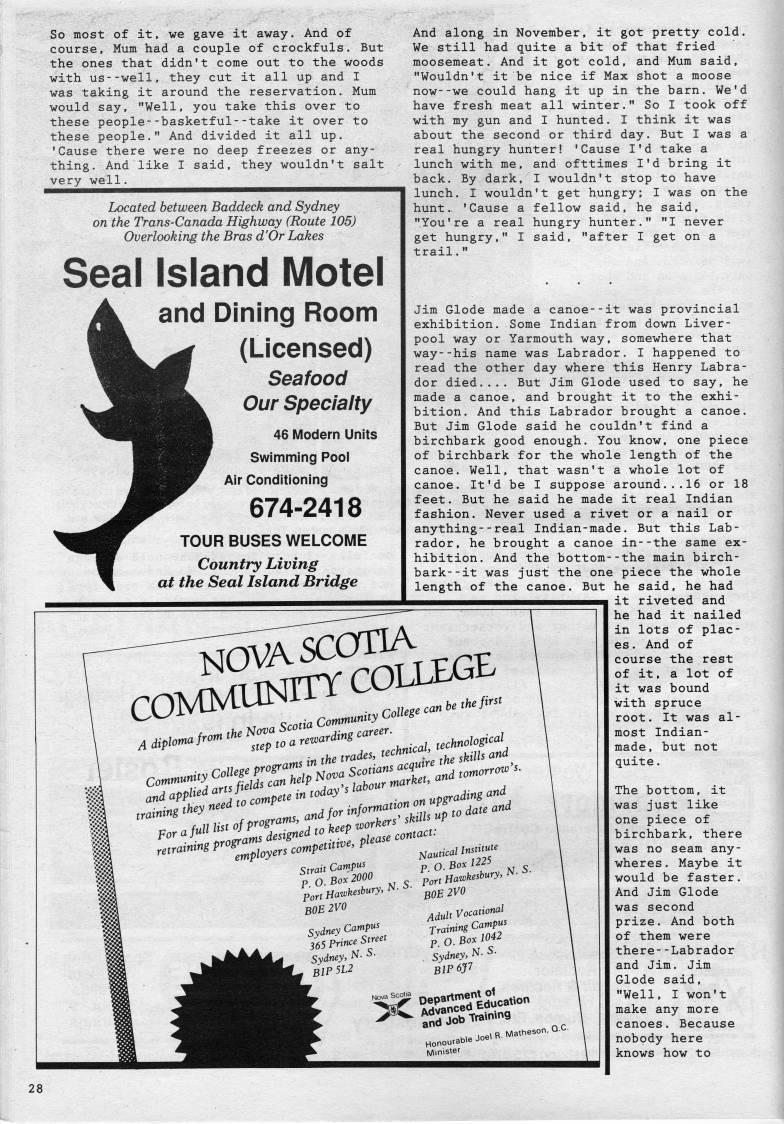 Published by Ronald Caplan on 1989/2/1 (300 reads)So most of it, we gave it away. And of course. Mum had a couple of crockfuls. But the ones that didn't come out to the woods with us--well, they cut it all up and I was taking it around the reservation. Mum would say, "Well, you take this over to these people--basketful--take it over to these people." And divided it all up. 'Cause there were no deep freezes or any? thing. And like I said, they wouldn't salt very well. Located between Baddeck and Sydney on tlie Trans-Canada Higliway (Route 105) Overlooking tfie Bras d'Or Lakes Seal Island Motel and Dining Room (Licensed) Seafood Our Specialty 46 Modern Units Swimming Pool Air Conditioning 674-2418 TOUR BUSES WELCOME Country Living at the Seal Island Bridge Forajuu''' '' designed to neey .''.' contact: retraining P"*':* ...fcomP*"-'. ?''"'' ' • • • • , , • .. • ? And along in November, it got pretty cold. We still had quite a bit of that fried moosemeat. And it got cold, and Mum said, "Wouldn't it be nice if Max shot a moose now--we could hang it up in the barn. We'd have fresh meat all winter." So I took off with my gun and I hunted. I think it was about the second or third day. But I was a real hungry hunter! 'Cause I'd take a lunch with me, and ofttimes I'd bring it back. By dark, I wouldn't stop to have lunch. I wouldn't get hungry; I was on the hunt. 'Cause a fellow said, he said, "You're a real hungry hunter." "I never get hungry," I said, "after I get on a trail." Jim Glode made a canoe--it was provincial exhibition. Some Indian from down Liver? pool way or Yarmouth way, somewhere that way--his name was Labrador. I happened to read the other day where this Henry Labra? dor died.... But Jim Glode used to say, he made a canoe, and brought it to the exhi? bition. And this Labrador brought a canoe. But Jim Glode said he couldn't find a birchbark good enough. You know, one piece of birchbark for the whole length of the canoe. Well, that wasn't a whole lot of canoe. It'd be I suppose around...16 or 18 feet. But he said he made it real Indian fashion. Never used a rivet or a nail or anything--real Indian-made. But this Lab? rador, he brought a canoe in--the same ex? hibition. And the bottom--the main birch? bark- -it was just the one piece the whole length of the canoe. But he said, he had : riveted and Nauncallnsnt''' Strait Campus p q Box U'' ' To. BOX 2000 'p,rt Hawkesbury, '-S- PortHav'kesbury,'-'- ''' 2VO BOB 2V0 SydneyCamP-l 365 Prince Street Sydney, N- S- BIP 5L2 Adult Vocational Training Campus p o. Box 1042 , Sydney, '??' • B1P6P andJOD . • • ?? - Honourabe Jo? Minister he had it nailed in lots of plac? es . And of course the rest of it, a lot of it was bound with spruce root. It was al? most Indian- made, but not quite. The bottom, it was just like one piece of birchbark, there was no seam any? wheres. Maybe it would be faster. And Jim Glode was second prize. And both of them were there--Labrador and Jim. Jim Glode said. "Well, I won't make any more canoes. Because nobody here knows how to