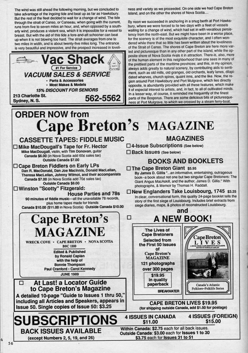 Published by Ronald Caplan on 1989/2/1 (206 reads)The wind was still ahead the following moming, but we concluded to take advantage of the ingoing tide and beat up as far as Hawksbury. But the rest of the fleet decided to wait for a change of wind. The tide through the strait of Canso, or Canseau, when going with the current, mns from five to seven miles an hour, and, when opposed by a south- eriy wind, produces a violent sea, which it is impossible for a vessel to breast. But with the aid of this tide a fore-and-aft schooner can beat up when it is not blowing too hard. The strait averages from one to two miles in width, and is atx)ut twenty-five miles long. The entrance is very beautiful and impressive, and the prospect increased in loveli- Vac Shack C #1 For Service ) VACUUM SALES & SERVICE • Parts & Accessories • Most Makes & Models 15% DISCOUNT FOR SENIORS 213 Charlotte St. Sydney, N. S. 562-5562 ness and variety as we proceeded. On one side we had Cape Breton Island, and on the other the shores of Nova Scotia.... By noon we succeeded in anchoring in a snug berth at Port Hawks- bury, where we were forced to lie two days with a fleet of vessels waiting for a change of wind, which had set in with vexatious persis? tency from the north-east. But we might have been in a worse place, for the scenery is of the most exquisite character, and I often won? dered while there that so little has been written about the loveliness of the Strait of Canso. The shores of Cape Breton are here more var? ied and picturesque than in any other part of the island, while the op? posite shore of Nova Scotia rivals it in attraction. There-is, also, more of the human element in this neighborhood than one sees in many of the prettiest parts of the maritime provinces; and this, in my opinion, always adds greatly to natural scenery, by contributing aids to senti? ment, such as old mills, old granges, old orchards, leafy lanes, dilapi? dated wharves, church spires, quaint inns, and the like. Now, the re? gion around Port Hawksbury and Port Mulgrave, which lies directly opposite, is abundantly provided with all these features, which make it of especial interest to artists, and, in fact, to all of cultivated minds. In a lesser way, of course, it reminded me frequently of the finest parts of the Bosporus. There are some delicious bits of picturesque- ness at Port Mulgrave, to which we crossed by a steam ferry-boat, CASSETTE TAPES: FIDDLE MUSIC D Mike MacDougall's Tape for Fr. Hector Mike MacDougall, violin, with Tim Donovan, guitar Canada $6.00 (in Nova Scotia add 600 sales tax) Outside Canada $7.00 D Cape Breton Fiddlers on Eariy LPs Dan R. MacDonald, Dan Joe Maclnnis, Donald MacLellan, Theresa MacLellan, Johnny Wilmot, and their accompanists Canada $7.00 (in Nova Scotia add 700 sales tax) Outside Canada $8.00 D Winston "Scotty" Fitzgerald: House Parties and 78s 90 minutes of fiddle music • all the unavailable 78 records, plus home tapes made for friends Canada $10.00 ($11.00 in Nova Scotia) Outside Canada $10.00 ORDER NOW from Cape Breton's magazine Cape Breton's MAGAZINE WRECK COVE CAPE BRETON BOC IHO NOVA SCOTIA Edited & Published by Ronald Caplan with the help of Bonnie Thompson Paul Cranford?Carol Kennedy JUNE 1989 MAGAZINES D 4-lssue Su bscriptions (See beiow) D Back Issues (See below) BOOKS AND BOOKLETS DThe Cape Breton Giant $5.95 By James D. Gillis "...an informative, entertaining, outrageous book~a book about not one but two singular Cape Bretoners: The Giant Angus MacAskill, and the author, James D. Gillis." With photographs, & Memoir by Thomas H. Raddall. DNew Englanders Take Louisbourg, 1745 $3.25 In clear, conversational form, this quality 24-page booklet tells the story of the first siege of Louisbourg. Includes brief extracts from siege diaries, maps, & photos of reconstructed Louisbourg. and ? A NEW BOOK! D At Last! a Locator Guide to Cape Breton's Magazine A detailed 10-page "Guide to Issues 1 thru 50," including ail Articles and Speakers, appears in issue 50. Single copies of Issue 50: $3.25 The Lives of Cape Bretoners Selected from the First 50 Issues of Cape Breton's MAGAZINE 121 photographs over 300 pages $19.95 in quality paperback BREAKWATER CAPE BRETON LIVES $19.95 (for shipping outside Canada, add $1.50 for postage) SUBSCRIPTIONS 4 ISSUES IN CANADA $11.00 4 ISSUES (FOREIGN) $15.00 56 BACK ISSUES AVAILABLE (except Numbers 2,5,19, and 26) Within Canada: $2.75 each for all back issues. Outside Canada: $3.00 each for Issues 1 to 30 $3.75 each for Issues 31 to 51