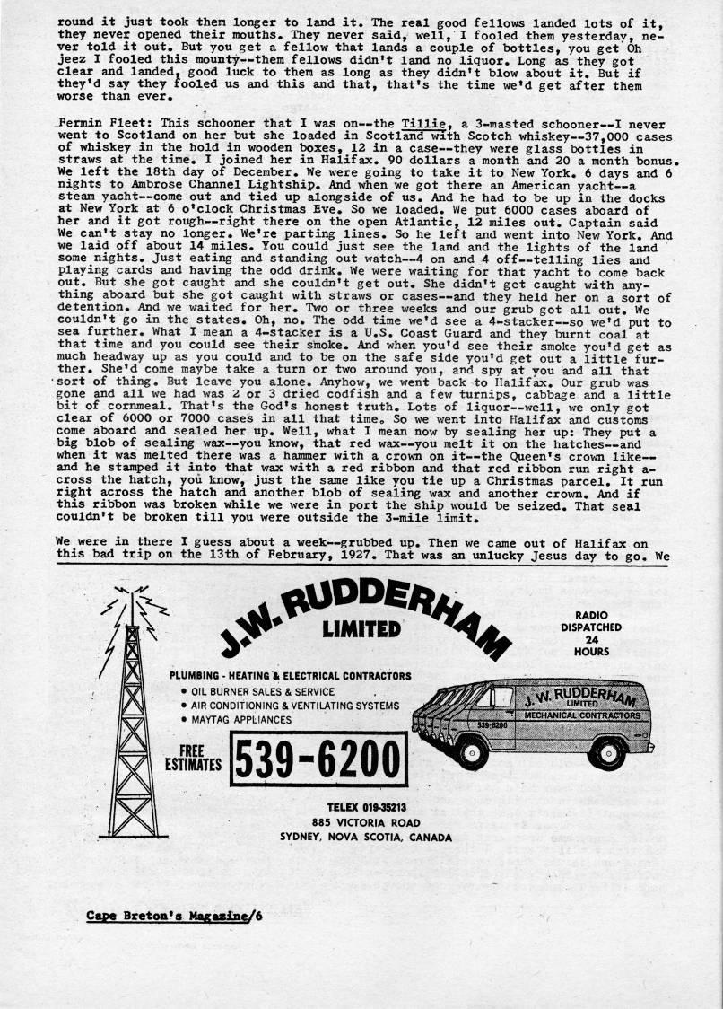 Published by Ronald Caplan on 1975/6/1 (437 reads)round it just took them longer to land it. The real good fellows landed lots of it, they never opened their mouths. They never said, well, I fooled them yesterday, ne? ver told it out* But you get a fellow that lands a couple of bottles, you get Oh jeez I fooled this mounty • them fellows didn't land no liquor. Long as they got clear and landed, good luck to them as long as they didn't blow about it. But if they'd say they tooled us and this and that, that's the time we'd get after them worse than ever. _.Fermin Fleet: This schooner that I was on • the Tillie. a 3-masted schooner • I never went to Scotland on her but she loaded in Scotland with Scotch whiskey • 37,000 cases of whiskey in the hold in wooden boxes, 12 in a case • they were glass bottles in straws at the tirae. I joined her in Halifax. 90 dollars a month and 20 a month bonus. We left the 18th day of December. We were going to take it to New York. 6 days and 6 nights to Ambrose Channel Lightship. And when we got there an American yacht • a steam yacht • come out and tied up alongside of us. And he had to be up in the docks at New York at 6 o'clock Christmas Eve* So we loaded. We put 6000 cases aboard of her and it got rotigh • right there on the open Atlantic, 12 miles out. Captain said We can't stay no longer. We're parting lines. So he left and went into New York. And we laid off about 14 miles. You could just see the land and the lights of the land some nights. Just eating and standing out v/atch • 4 on and 4 off • telling lies and playing cards and having the odd drink. We were waiting for that yacht to come back out. But she got caught and she couldn't get out. She didn't get caxight with any? thing aboard but she got caught with straws or cases • and they held her on a sort of detention. And we waited for her* Two or three weeks and our grub got all out* We couldn't go in the states* Oh, no. The odd time we'd see a 4-stacker • so we'd put to sea further. What I mean a 4-stacker is a U.S. Coast Guard and they burnt coal at that time and you could see their smoke. And when you'd see their smoke you'd get as much headway up as you could and to be on the safe side you'd get out a little fur? ther. She'd corae maybe take a turn or two around you, and spy at you and all that sort of thing. But leave you alone. Anyhow, we went back to Halifax. Our grub was gone and all we had was 2 or 3 dried codfish and a few turnips, cabbage and a little bit of cornraeal. That's the God's honest truth. Lots of liquor • well, we only got clear of 6000 or 7000 cases in all that tiraeo So we went into Halifax and custoras corae aboard and sealed her up. Well, what I mean now by sealing her up: They put a big blob of sealing wax • you know, that red wax • you melt it on the hatches • and when it was melted there was a hajmmer with a crown on it • the Queen's crown like • and he staraped it into that wax with a red ribbon and that red ribbon run right a- cross the hatch, you know, just the same like you tie up a Christmas parcel. It rtm right across the hatch and another blob of sealing wax and another crown. And if this ribbon was broken while we were in port the ship would be seized. That seal couldn't be broken till you were outside the 3-mile limit. We were in there I guess about a week • grubbed up. Then we came out of Halifax on this bad trip on the 13th of February, 1927. That was an imlucky Jesus day to go. We ''* LIMITED ''' RADIO DISPATCHED 24 HOURS PLUMBING - HEATING & ELECTRICAL CONTRACTORS • OIL BURNER SALES & SERVICE • AIR CONDITIONING & VENTIUTING SYSTEMS • MAYTAG APPLIANCES FREE ESTIMATES 539-6200 TELEX 019-35213 885 VICTORIA ROAD SYDNEY, NOVA SCOTIA, CANADA Cape Breton's MagMtine/6