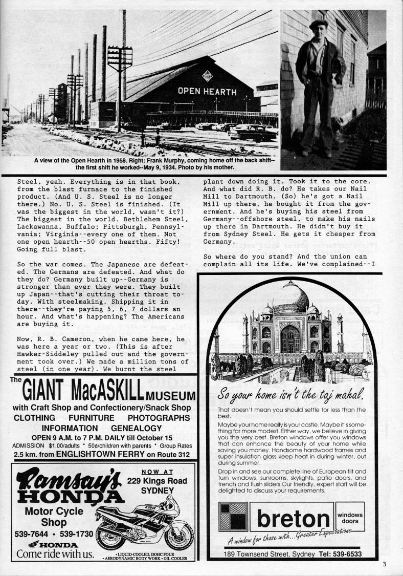 Published by Ronald Caplan on 1989/8/1 (306 reads)'*''''lif...'v _ _ A View of the Open Hearth in 1958. Right: Frank Murphy, coming home off the bacic shift- the first shift he worked-iViay 9,1934. Photo by his mother. Steel, yeah. Everything is in that book, from the blast furnace to the finished product. (And U. S. Steel is no longer there.) No. U. S. Steel is finished. (It was the biggest in the world, wasn't it?) The biggest in the world. Bethlehem Steel, Lackawanna, Buffalo; Pittsburgh, Pennsyl? vania; Virginia--every one of them. Not one open hearth--50 open hearths. Fifty! Going full blast. So the war comes. The Japanese are defeat? ed. The Germans are defeated. And what do they do? Germany built up--Germany is stronger than ever they were. They built up Japan--that's cutting their throat to? day. With steelmaking. Shipping it in there--they're paying 5, 6, 7 dollars an hour. And what's happening? The Americans are buying it. Now, R. B. Cameron, when he came here, he was here a year or two. (This is after Hawker-Siddeley pulled out and the govern? ment took over.) We made a million tons of steel (in one year). We burnt the steel plant down doing ii'. Took it to the core. And what did R. B. do? He takes our Nail Mill to Dartmouth. (So) he's got a Nail Mill up there, he bought it from the gov? ernment. And he's buying his steel from Germany--offshore steel, to make his nails up there in Dartmouth. He didn't buy it from Sydney Steel. He gets it cheaper from Germany. So where do you stand? And the union can complain all its life. We've complained--I • 'GIANT MacASKILL MUSEUM with Craft Shop and Confectionery/Snack Shop CLOTHING FURNITURE PHOTOGRAPHS INFORMATION GENEALOGY OPEN 9 A.M. to 7 P.M. DAILY till October 15 ADMISSION $1.00/adults * 500/children with parents * Group Rates 2.5 km. from ENGLISHTOWN FERRY on Route 312 Motor Cycle Shop 539-7644 • 539-1730 Rhonda. Come ride with US. NOW AT 229 Kings Road SYDNEY So u'oof*- (vofne' i'n t tke' ted tnaka'. That doesn't mean you should settle for less than the best. Maybe your home really is your castle. Maybe it's some? thing for more modest. Either way, we believe in giving you the very best. Breton windows offer you windows that can enhance the beauty of your home while saving you money. Handsome hardwood frames and super insulation glass keep heat in during winter, out during summer. Drop in and see our complete line of European tilt and turn windows, sunrooms, skylights, patio doors, and trench and flush sliders.Our friendly, expert staff will be delighted to discuss your requirements. 189 Townsend Street, Sydney Tel: 539-6533 'dney