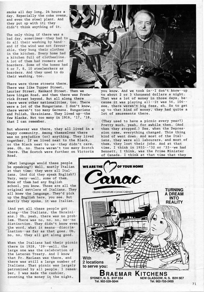 Published by Ronald Caplan on 1990/1/1 (287 reads)smoke all day long, 24 hours a day. Especially the coke ovens, and even the steel plant. And they put up with it; they didn't think anything of it. The only thing if there was a bad day, sometimes--they had to do all their washing by hand-- and if the wind was not favour? able, they hung their clothes in the kitchen. Every home had a kitchen full of clothesline. A lot of them had roomers and boarders. Some of the homes had 6 or 7, 8, 10 steelworkers as boarders. And they used to do their washing, too. There were three streets there. There was like Tupper Street, Laurier Street, Hankard Street. Then we have Lingan Road, and then there was Frede? rick Street beyond. But all along there there were other nationalities, too. There were a lot of the Hungarians. I don't know, there weren't too many Germans. Hungarians and Polish, Ukrainians. They lived up--the few Blacks. Not too many in 1916, '17, '18, that I can remember. But whoever was there, they all lived in a happy community. Among themselves there was no prejudice (or) anything. They lived together. If we lived next to the Black, or the Black next to us--they didn't care, see. Oh, no. There weren't too many Scotch there. The Scotch were further on Victoria Road. you know. And we took in--I don't know--up to about 2 or 3 thousand dollars a night. That was a lot of money in those days, be? cause it was playing all--it was 50, 10C-- see, there weren't big fees, eh. So to get up to that kind of money, they had quite a lot of amusements there. (They used to have a picnic every year?) Pretty much, yeah, for awhile then. (And then they stopped.) See, when the Depres? sion came, everything changed. This thing kind of went down. And most of the Ital? ians, they were all labourers, and most of them, they lost their jobs. And at that time, I think in 1933--'32 or '33--we had Bennett, I think, was the Prime Minister of Canada. I think at that time that they (What language would these people be speaking?) Well, mostly Italian at that time; they were all Ital? ians. (And did they speak English?) Very, very--well, some of them. None of them had any English school, you know. Those are all the original settlers of Italians. They all knew the language. They'd pick up the English here, you see. But mostly they spoke, it was Italian. (And yet all these people got along--the Italians, the Ukraini? ans.) Oh, yeah, there was no prob? lem. There was no, no, no, no--no distinction. They didn't know even the word, what it means--discrim? ination- -as far as that goes. Oh, no, no, they all got along good. When the Italians had their picnic there in 1928, '29--well, the large one was the celebration of the Lateran Treaty. And I know that Fr. MacLean was there, and there was still a large number of Italians. That picnic was largely patronized by all people. I remem? ber, I was made the cashier, counting the money in the niglit, WE ARE THE ' ''OF YOUR HOME TURNING A DREAM INTO REALITY With 2 locations to serve you Braemar Kitchens SYDNEY, N.S. BIP 584 Tel. 902-539-5044 NEW GLASGOW, N. S. B2H 5E7 Tel. 902-755-2455
