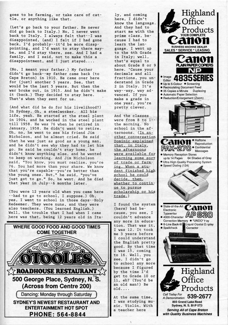 Published by Ronald Caplan on 1990/1/1 (253 reads)goes to be farming, or take care of cat? tle, or anything like that. (Let's go back to your father. He never did go back to Italy.) No, I never went back to Italy. I always felt that--I was disappointed, (and) I felt if I had gone back, I'd probably--it'd be more disap? pointing, and I'd want to stay there may? be, and I'd stay there, see. And I had a family, and I said, not to make this a disappointment, and I just stayed.... (No, I meant your father.) My father didn't go back--my father came back (to Cape Breton) in 1910. He came over here for (just) another 5 years. See, that would be the last 5 years. But then the war broke out, in 1915. And he didn't make it (back.) They decided to stay here. That's when they sent for us. (And what did he do for his livelihood?) In Sydney. Oh, a steelworJcer. All his life, yeah. He started at the steel plant in 1904, and he worked in the steel plant till 1958. He was 76 when he retired in January, 1958. He didn't want to retire. Oh, no, he went to see his friend Jim Nicholson, and he almost cried. He said that he was just as good as a young man, and he didn't see why they had to let him go. He said he couldn't stay home, he didn't know anything else, and he wanted to keep on working. And Jim Nicholson said, "You know, you must realize, you're 76. You had more than your share. We know that you're capable--you're better than the young ones. But," he said, "you've just got to go." So, he went. And he died that year in July--6 months later. (You were 12 years old when you came here --had to go to school, I suppose.) Oh, yes, I went to school in those days--Holy Redeemer. They were nuns, and they were also teachers. (You learned English.) Well, the trouble that I had when I came here was that, being 12 years old in Ita- WHERE GOOD FOOD AND GOOD TIMES COME TOGETHER 'Y ROADHOUSE RESTAURANT f' 500 George Place, Sydney, NJ'fe, (Across from Centre 200) |[ Dancing: Monday through Saturday )| SYDNEY'S NEWEST RESTAURANT AND ENTERTAINMENT HOT SPOT PHONE: 564-8844 ly, and coming here, I didn't know the language. And they had to start me with the prime class, be? cause I had to learn the lan? guage. I went up to the 4th Grade in Italy; well, that's equal to about Grade 8 or 9 here. 'Cause your decimals and all fractions, you un? derstand in Grade 2 in Italy. It's way--way, way ad? vanced. If you make a grade in one year, you're pretty clever. And the classes were from 8 to 1-- the morning. No school in the af? ternoons. (In an? other conversation Dominic explained that, in Italy, the afternoons were available for learning some sort of trade or farm? ing. When a stu? dent finished high school he could decide, then. whether to contin? ue to pursue scholarship or his I found the system (here) bad be? cause, you see, I couldn't advance any more in educa? tion. That was it, I was 12. It took me 3 years before I could understand the English pretty good. By that time I was 15, coming to 16. Well. you see, I didn't go to school any more because I figured by the time I'd get to Grade 10 or 11, eh? (You'd be an old man!) Be old At the same time, I was studying mu? sic. Violin. With a teacher here Highland Office wW' Products _--_ YOUR COMPLETE Canon BUSINESS MACHINE DEALER BALES'ERVICE'ASING Canon PLAIN RIPPER COPIERS 'tz 4835SERIES ?? Up to 5-Colour • Screening ?? Recirculating Document Feed ?? 35 Copies a Minute Duplexing Automatic Paper Selection Reduction/Enlargement (Zoom) #>-;%-f<'-ff • Halftone 'i'C?llrll Reproduction • Memory Reception Stores up to 14 Pages 64 Shades of Grey • Ultra High Quality Processing System • Speed Dialing (124) Canon State-of-the-Art | Electronic Typewriter /A I 4000-Character '~ Correction Memory • "UNDO" h ey 8-Line Back-lit B Liquid Crystal D>>play I Spellcheck | Corrector ' Highland Office Products Call Today For CQQ OCVT A Demonstration 0057"'?? / I 803 Grand Lake Road Sydney, N.S. BIP 5T3 Serving All of Cape Breton with Quality Business Machines