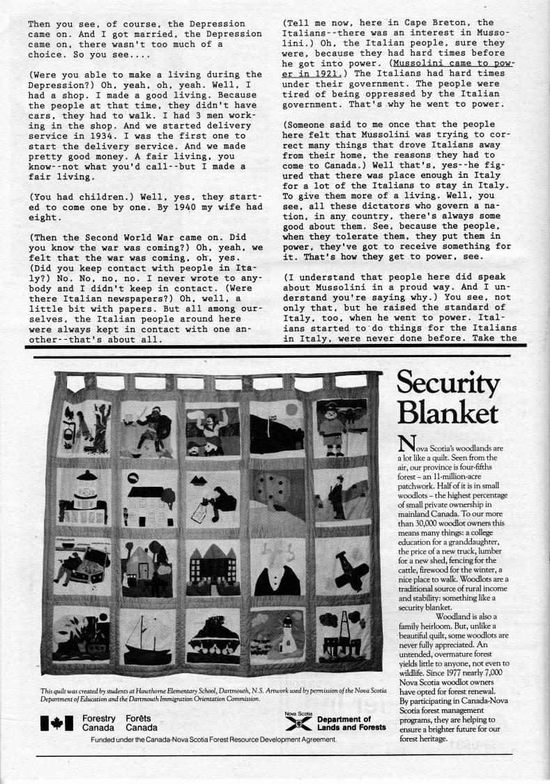Published by Ronald Caplan on 1990/1/1 (280 reads)Then you see, of course, the Depression came on. And I got married, the Depression came on, there wasn't too much of a choice. So you see.... (Were you able to make a living during the Depression?) Oh, yeah, oh, yeah. Well, I had a shop. I made a good living. Because the people at that time, they didn't have cars, they had to walk. I had 3 men work? ing in the shop. And we started delivery service in 1934. I was the first one to start the delivery service. And we made pretty good money. A fair living, you know--not what you'd call--but I made a fair living. (You had children.) Well, yes, they start? ed to come one by one. By 1940 my wife had eight. (Then the Second World War came on. Did you know the war was coming?) Oh, yeah, we felt that the war was coming, oh, yes. (Did you keep contact with people in Ita? ly?) No. No, no, no. I never wrote to any? body and I didn't keep in contact. (Were there Italian newspapers?) Oh, well, a little bit with papers. But all among our? selves, the Italian people around here were always kept in contact with one an? other- -that ' s about all. (Tell me now, here in Cape Breton, the Italians--there was an interest in Musso? lini.) Oh, the Italian people, sure they were, because they had hard times before he got into power. (Mussolini came to pow? er in 1921.) The Italians had hard times under their government. The people were tired of being oppressed by the Italian government. That's why he went to power. (Someone said to me once that the people here felt that Mussolini was trying to cor? rect many things that drove Italians away from their home, the reasons they had to come to Canada.) Well that's, yes--he fig? ured that there was place enough in Italy for a lot of the Italians to stay in Italy. To give them more of a living. Well, you see, all these dictators who govern a na? tion, in any, country, there's always some good about them. See, because the people, when they tolerate them, they put them in power, they've got to receive something for it. That's how they get to power, see. (I understand that people here did speak about Mussolini in a proud way. And I un? derstand you're saying why.) You see, not only that, but he raised the standard of Italy, too, when he went to power. Ital? ians started to"do things for the Italians in Italy, were never done before. Take the Security Blanket No. This quilt was created by students at Hawthorne Elementary School, Dartmouth, N.S. Artwork used by t>ermission of the Nova Scotia Department of Education and the Dartmouth Immigration Orientation Commission. 1'1 Forestry ForSts Canada Canada "'s]' Departmentof Lands and Forests Funded under the Canada-Nova Scotia Forest Resource Development Agreement. ' ova Scotia's woodlands are a lot like a quilt. Seen from the air, our province is four-fifths forest - an 11-million-acre patchwork. Half of it is in small woodlots - the highest percentage of small private Ownership in mainland Canada. To our more than 30,000 woodlot owners this means many things: a college education for a granddaughter, the price of a new truck, lumber for a new shed, fencing for the cattle, firewood for the winter, a nice place to walk. Woodlots are a traditional source of ruralincome and stability: something like a security blanket. Woodland is also a family heirloom. But, unlike a beautiful quilt, some woodlots are never fully appreciated. An untended, overmature forest yields little to anyone, not even to wildlife. Since 1977 nearly 7,000 Nova Scotia woodlot owners have opted for forest renewal. By participating in Canada-Nova Scotia forest management programs, they are helping to ensure a brighter future for our forest heritage.