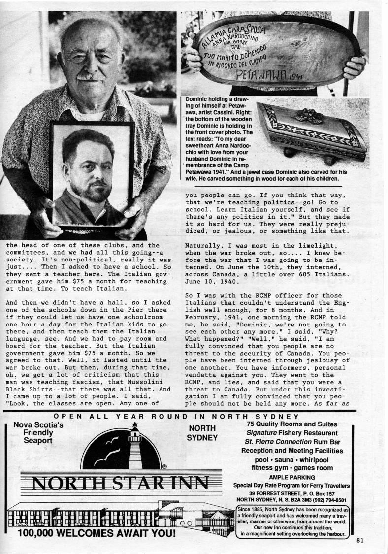 Published by Ronald Caplan on 1990/1/1 (212 reads)the head of one of these clubs, and the committees, and we had all this going--a society. It's non-political, really it was just.... Then I asked to have a school. So they sent a teacher here. The Italian gov? ernment gave him $75 a month for teaching at that time. To teach Italian. And then we didn't have a hall, so I asked one of the schools down in the Pier there if they could let us have one schoolroom one hour a day for the Italian kids to go there, and then teach them the Italian language, see. And we had to pay room and board for the teacher. But the Italian government gave him $75 a month. So we agreed to that. Well, it lasted until the war broke out. But then, during that time, oh, we got a lot of criticism that this man was teaching fascism, that Mussolini Black Shirts--that there was all that. And I came up to a lot of people. I said, "Look, the classes are open. Any one of Dominic holding a draw? ing of himself at Petaw? awa, artist Casslnl. Right: the bottom of the wooden tray Dominic Is holding In the front cover photo. The text reads: "To my dear sweetheart Anna Nardoc? chio with love from your husband Dominic in re- ' membrance of the Camp Petawawa 1941." And a jewel case Dominic also carved for his wife. He carved something in wood for each of his children. you people can go. If you think that way, that we're teaching politics--go! Go to school. Learn Italian yourself, and see if there's any politics in it." But they made it so hard for us. They were really preju? diced, or jealous, or something like that. Naturally, I was most in the limelight, when the war broke out, so.... I knew be? fore the war that I was going to be in? terned. On June the 10th, they interned, across Canada, a little over 605 Italians. June 10, 1940. So I was with the RCMP officer for those Italians that couldn't understand the Eng? lish well enough, for 8 months. And in February, 1941, one morning the RCMP told me, he said, "Dominic, we're not going to see each other any more." I said, "Why? What happened?" "Well," he said, "I am fully convinced that you people are no threat to the security of Canada. You peo? ple have been interned through jealousy of one another. You have informers, personal vendetta against you. They went to the RCMP, and lies, and said that you were a threat to Canada. But under this investi? gation I am fully convinced that you peo? ple should not be held any more. As far as OPEN Nova Scotia's Friendly Seaport ROUND IN NORTH SYDNEY BlHitliliillillia 100,000 WELCOMES AWAIT YOU! NORTH SYDNEY 75 Quality Rooms and Suites Signature Fishery Restaurant St. Pierre Connection Rum Bar Reception, and Meeting Facilities pool • sauna • whirlpool fitness gym • games room AiWPLE PARKING Special Day Rate Program for Ferry Travellers 39 FORREST STREET, P. O. Box 157 NORTH SYDNEY, N. S. B2A 3M3 (902) 794-8581 Since 1885, North Sydney has been recognized as I a friendly seaport and has welcomed many a trav? eller, mariner or otherwise, from around the world. Our new Inn continues this tradition, ' in a magnificent setting overlooking the haitour.
