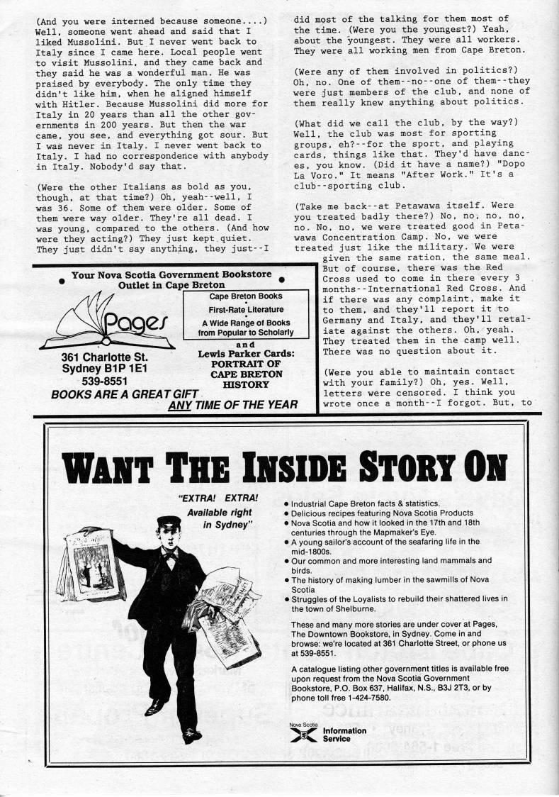 Published by Ronald Caplan on 1990/1/1 (210 reads)(And you were interned because someone....) Well, someone went ahead and said that I liked Mussolini. But I never went back to Italy since I came here. Local people went to visit Mussolini, and they came back and they said he was a wonderful man. He was praised by everybody. The only time they didn't like him, when he aligned himself with Hitler. Because Mussolini did more for Italy in 20 years than all the other gov? ernments in 200 years. But then the war came, you see, and everything got sour. But I was never in Italy. I never went back to Italy. I had no correspondence with anybody in Italy. Nobody'd say that. (Were the other Italians as bold as you, though, at that time?) Oh, yeah--well, I was 36. Some of them were older. Some of them were way older. They're all dead. I was young, compared to the others. (And how were they acting?) They just kept quiet. They just didn't say anything, they just--I Your Nova Scotia Government Bookstore Outlet in Cape Breton Cape Breton Books First-Rate Literature A Wide Range of Books from Popular to Scholarly and 361 Charlotte St. ''' Parker Cards: Sydney B1P1E1 portrait of R'l o • 'APE BRETON ooa-oooi HISTORY BOOKS ARE A GREA T GIFT ANY TIME OF THE YEAR did most of the talking for them most of the time. (Were you the youngest?) Yeah, about the youngest. They were all workers. They were all working men from Cape Breton. (Were any of them involved in politics?) Oh, no. One of them--no--one of them--they were just members of the club, and none of them really knew anything about politics. (What did we call the club, by the way?) Well, the club was most for sporting groups, eh?--for the sport, and playing cards, things like that. They'd have danc? es, you know. (Did it have a name?) "Dopo La Voro." It means "After Work." It's a club--sporting club. (Take me back--at Petawawa itself. Were you treated badly there?) No, no. no, no, no. No, no, we were treated good in Peta? wawa Concentration Camp. No, we were treated just like the military. We were given the same ration, the same meal. But of course, there was the Red Cross used to come in there every 3 months--International Red Cross. And if there was any complaint, make it to them, and they'll report it to Germany and Italy, and they'll retal? iate against the others. Oh, yeah. They treated them in the camp well. There was no question about it. (Were you able to maintain contact with your family?) Oh, yes. Well, letters were censored. I think you wrote once a month--I forgot. But, to WANT The Inside Stort on EXTRA! EXTRA! Available right in Sydney" • Industrial Cape Breton facts & statistics. • Delicious recipes featuring Nova Scotia Products • Nova Scotia and how it looked in the 17th and 18th centuries through the Mapmaker's Eye. • A young sailor's account of the seafaring life in the mid-1800s. • Our common and more interesting land mammals and birds. • The history of making lumber in the sawmills of Nova Scotia • Struggles of the Loyalists to rebuild their shattered lives in the town of Shelburne. These and many more stories are under cover at Pages, The Downtown Bookstore, in Sydney. Come in and browse: we're located at 361 Charlotte Street, or phone us at 539-8551. A catalogue listing other government titles is available free upon request from the Nova Scotia Government Bookstore, P.O. Box 637, Halifax, N.S., B3J 2T3, or by phone toll free 1-424-7580. Nova Scotia '[Sl' Information '''%' Service