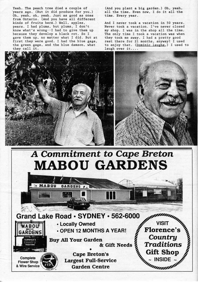 Published by Ronald Caplan on 1990/1/1 (209 reads)Yeah. The peach tree died a couple of years ago. (But it did produce for you.) Oh, yeah, oh, yeah. Just as good as ones from Ontario. (And you have all different kinds of fruits here.) Well, apples, pears. I had plums, but plums. I don't know what's wrong--I had to give them up because they develop a black rot. So I gave them up, no matter what I did. But at first they were good. I had the blue gage, the green gage, and the blue damson, what they call it. (And you plant a big garden.) Oh, yeah, all the time. Even now. I do it all the time. Every year. And I never took a vacation in 50 years. Never took a vacation. I've never closed my shop. I was in the shop all the time. The only time I took a vacation was when they took me away. I had a pretty good rest there for 21 months, anyway! I used to enjoy that. (Dominic laughs.) I used to laugh over it.... A Commitment to Cape Breton MABOU GARDENS Grand Lake Road • SYDNEY • 562-6000 ,''?''''