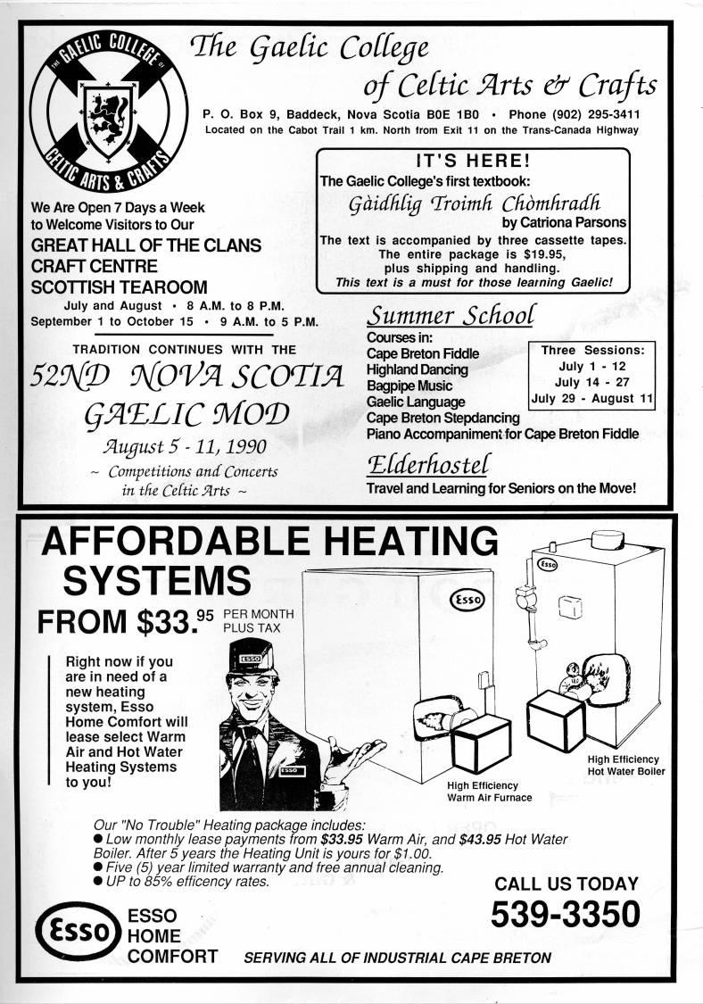 T/te Qattic CoiUgt of Cdtic fArts & Crafts p. O. Box 9, Baddeck, Nova Scotia BOE 1B0 • Phone (902) 295-3411 Located on the Cabot Trail 1 km. North from Exit 11 on the Trans-Canada Highway We Are Open 7 Days a Week to Welcome Visitors to Our GREAT HALL OF THE CLANS CRAFT CENTRE SCOTTISH TEAROOM July and August • 8 A.M. to 8 P.M. September 1 to October 15 • 9 A.M. to 5 P.M IT'S HERE! The Gaelic College's first textbook: Qaidhiig 'roimfi Cfiomftradfi by Catriona Parsons The text is accompanied by three cassette tapes. The entire package is $19.95, plus shipping and handling. This text is a must for those learning Gaelic! Summer ScfiooC Courses in: Cape Breton Fiddle TRADITION CONTINUES WITH THE GJA'JLIC 0VLO(D Cape Breton Stepdanclng Three Sessions: July 1 - 12 July 14 - 27 July 29 - August 11 August 5 -11,1990 ~ Competitions and Concerts in t/ie Cettic J4.rts ~ Piano Accompanimenl for Cape Breton Fiddle Travel and Learning for Seniors on the Move! AFFORDABLE HEATING SYSTEMS FROM $33. 95 PER MONTH PLUS TAX Right now if you are in need of a new heating system, Esso Home Comfort will lease select Warm Air and Hot Water Heating Systems to you! High Efficiency Hot Water Boiler High Efficiency Warm Air Furnace Our "No Trouble" Heating package includes: • Low monthly lease payments from $33.95 Warm Air, and $43.95 Hot Water Boiler. After 5 years the Heating Unit is yours for $1.00. • Five (5) year limited warranty and free annual cleaning. • UP to 85% efficency rates. CALL US TODAY r' ' ESSO .cSSOIhome 539-3350 COMFORT SERVING ALL OF INDUSTRIAL CAPE BRETON