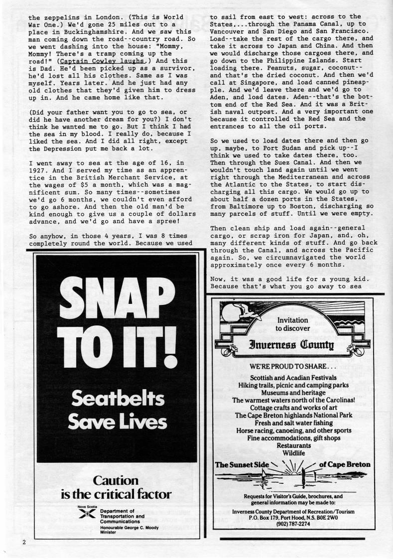 Published by Ronald Caplan on 1990/6/1 (1014 reads)the Zeppelins in London. (This is World War One.) We'd gone 25 miles out to a place in Buckinghamshire. And we saw this man coming down the road--country road. So we went dashing into the house: "Mommy, Mommy! There's a tramp coming up the road!" (Captain Cowlev laughs.) And this is Dad. He'd been picked up as a survivor, he'd lost all his clothes. Same as I was myself. Years later. And he just had any old clothes that they'd given him to dress up in. And he came home like that. (Did your father want you to go to sea, or did he have another dream for you?) I don't think he wanted me to go. But I think I had the sea in my blood. I really do, because I liked the sea. And I did all right, except the Depression put me back a lot. I went away to sea at the age of 16, in 1927. And I served my time as an appren? tice in the British Merchant Service, at the wages of $5 a month, which was a mag? nificent sum. So many times--sometimes we'd go 6 months, we couldn't even afford to go ashore. And then the old man'd be kind enough to give us a couple of dollars advance, and we'd go and have a spree! So anyhow, in those 4 years, I was 8 times completely round the world. Because we used Seatbelts Save Lives Caution is the critical factor >C Department of Transportation and Communications to sail from east to west: across to the States,...through the Panama Canal, up to Vancouver and San Diego and San Francisco. Load--take the rest of the cargo there, and take it across to Japan and China. And then we would discharge those cargoes there, and go down to the Philippine Islands. Start loading there. Peanuts, sugar, coconut-- and that's the dried coconut. And then we'd call at Singapore, and load canned pineap? ple. And we'd leave there and we'd go to Aden, and load dates. Aden--that's the bot? tom end of the Red Sea. And it was a Brit? ish naval outpost. And a very important one because it controlled the Red Sea and the entrances to all the oil ports. So we used to load dates there and then go up, maybe, to Port Sudan and pick up--I think we used to take dates there, too. Then through the Suez Canal. And then we wouldn't touch land again until we went right through the Mediterranean and across the Atlantic to the States, to start dis? charging all this cargo. We would go up to about half a dozen ports in the States, from Baltimore up to Boston, discharging so many parcels of stuff. Until we were empty. Then clean ship and load again--general cargo, or scrap iron for Japan, and, oh, many different kinds of stuff. And go back through the Canal, and across the Pacific again. So, we circumnavigated the world approximately once every 6 months. Now, it was a good life for a young kid. Because that's what you go away to sea WE'RE PROUD TO SHARE... Scottish arid Acadian Festivals Hiking trails, picnic and camping parks Museums and heritage The warmest waters north of the Carolinas! Cottage crafts and works of art The Cape Breton highlands National Park Fresh and salt water fishing Horse racing, canoeing, and other sports Fine accommodations, gift shops Restaurants WUdlife The Sunset Side ' | / -T- of Cape Breton Requests for Visitor's Guide, brochures, and general information may be made to: Inverness County Department of Recreation/Tourism P.O. Box 179. Port Hood, N.S. BOE 2W0 (902)787-2274