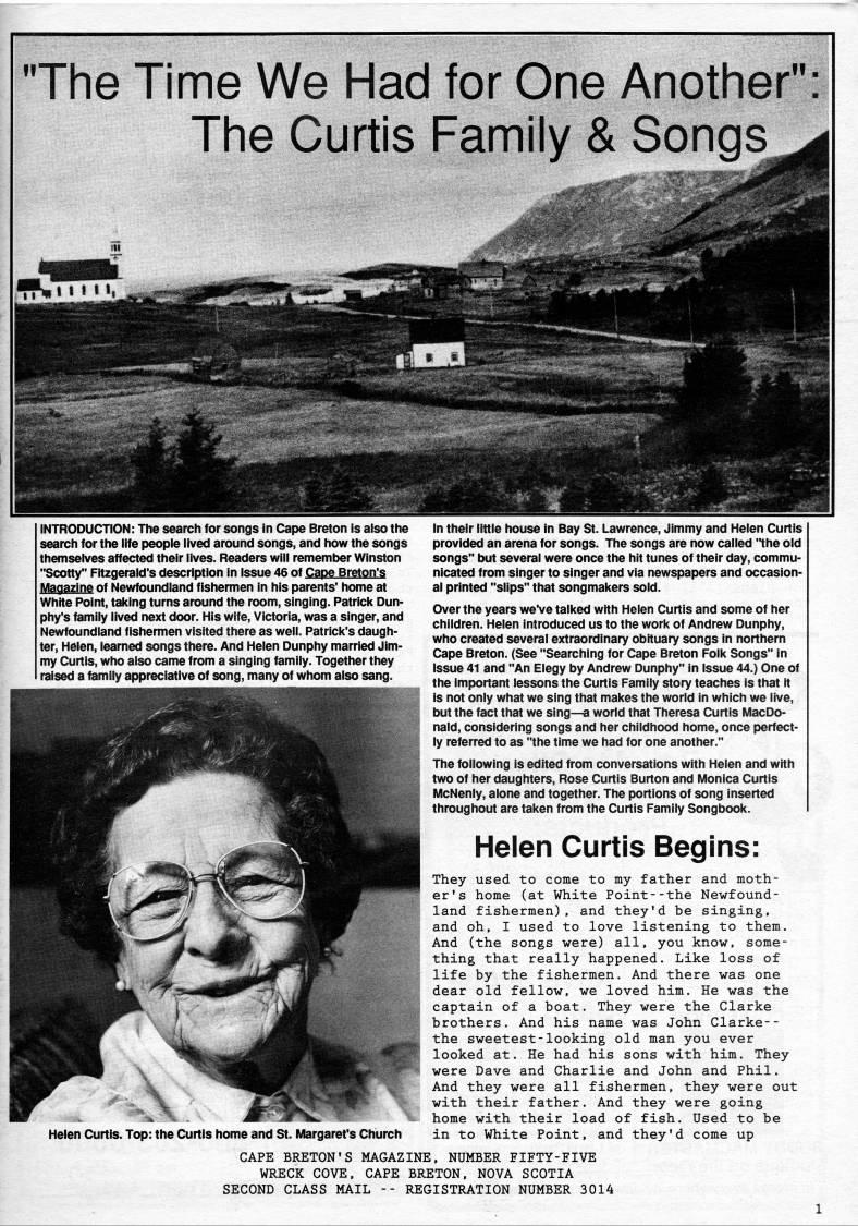 The Time We Had for One Another:? The Curtis Family & Songs INTRODUCTION: The search for songs in Cape Breton is also the search for the life people lived around songs, and how the songs themselves affected their lives. Readers will remember Winston "Scotty" Fitzgerald's description In Issue 46 of Cape Breton's Magazine of Newfoundland fishermen in his parents' home at White Point, taking turns around the room, singing. Patricia Dun- phy's family lived next door. His wife, Victoria, was a singer, and Newfoundland f ishennen visited there as well. Patrick's daugh? ter, Helen, learned songs there. And Helen Dunphy married Jim? my Curtis, who also came from a singing famiiy. Together they raised a fsunily appreciative of song, many of whom also sang. Helen Curtis. Top: the Curtis home and St. Margaret's Church In their little house In Bay St. Lawrence, Jimmy and Helen Curtis provided an arena for songs. The songs are now called "the old songs" but several were once the hit tunes of their day, commu? nicated from singer to singer and via newspapers and occasion? al printed "slips" that songmakers sold. Over the years we've talked with Helen Curtis and some of her children. Helen introduced us to the work of Andrew Dunphy, who created several extraordinary obituary songs In northern Cape Breton. (See "Searching for Cape Breton Folk Songs" in Issue 41 and "An Elegy by Andrew Dunphy" in Issue 44.) One of the important lessons the Curtis Family story teaches is that it is not only what we sing that makes the world in which we live, but the fact that we sing • a world that Theresa Curtis MacDo? nald, considering songs and her childhood home, once perfect? ly referred to as "the time we had for one another." The following is edited from conversations with Helen and with two of her daughters. Rose Curtis Burton and Monica Curtis McNenly, alone and together. The portions of song inserted throughout are taken from the Curtis Family Songbook. Helen Curtis Begins: They used to come to my father and moth? er's home (at White Point--the Newfound? land fishermen), and they'd be singing, and oh, I used to love listening to them. And (the songs were) all, you know, some? thing that really happened. Like loss of life by the fishermen. And there was one dear old fellow, we loved him. He was the captain of a boat. They were the Clarke brothers. And his name was John Clarke-- the sweetest-looking old man you ever looked at. He had his sons with him. They were Dave and Charlie and John and Phil. And they were all fishermen, they were out with their father. And they were going home with their load of fish. Used to be in to White Point, and they'd come up CAPE BRETON'S MAGAZINE, NUMBER FIFTY-FIVE WRECK COVE, CAPE BRETON, NOVA SCOTIA SECOND CLASS MAIL -- REGISTRATION NUMBER 3014