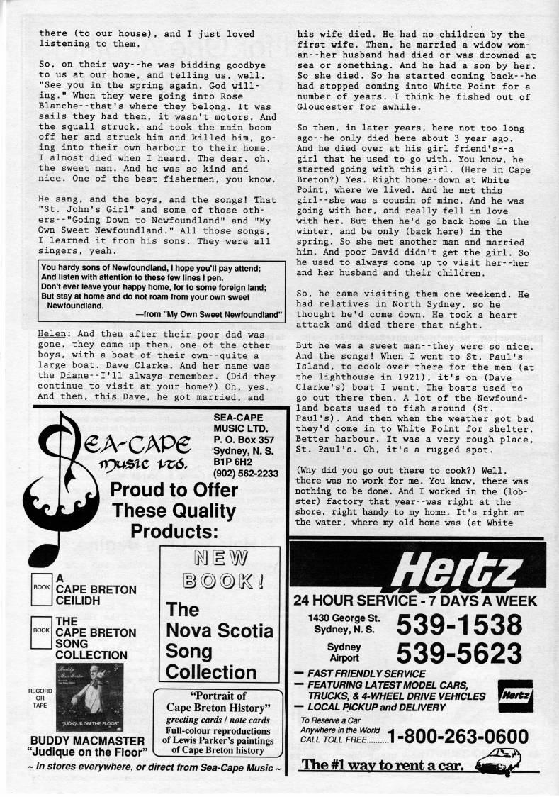 there (to our house), listening to them. and I just loved So, on their way--he was bidding goodbye to us at our home, and telling us, well, "See you in the spring again. God will? ing." When they were going into Rose Blanche--that's where they belong. It was sails they had then, it wasn't motors. And the squall struck, and took the main boom off her and struck him and killed him, go? ing into their own harbour to their home. I almost died when I heard. The dear, oh, the sweet man. And he was so kind and nice. One of the best fishermen, you know. He sang, and the boys, and the songs! That "St. John's Girl" and some of those oth? ers --"Going Down to Newfoundland" and "My Own Sweet Newfoundland." All those songs, I learned it from his sons. They were all singers, yeah. You hardy sons of Newfoundland, I hope you'll pay attend; And listen with attention to these few lines I pen. Don't ever leave your happy home, for to some foreign land; But stay at home and do not roam from your own sweet Newfoundland. • from "My Own Sweet Newfoundland" Helen: And then after their poor dad was gone, they came up then, one of the other boys, with a boat of their own--quite a large boat. Dave Clarke. And her name was the Diane--1'11 always remember. (Did they continue to visit at your home?) Oh, yes. And then, this Dave, he got married, and CA-CAPe SEA-CAPE MUSIC LTD. P. O. Box 357 Sydney, N. S. B1P6H2 (902) 562-2233 Proud to Offer These Quality Products: CAPE BRETON CEILIDH THE CAPE BRETON SONG COLLECTION The Nova Scotia Song Collection BUDDY MACMASTER "Judique on the Floor" ~ in stores everywhere, or direct from Sea-Cape Music -> "Portrait of Cape Breton History" greeting cards I note cards Full-colour reproductions of Lewis Parker's paintings of Cape Breton history his wife died. He had no children by the first wife. Then, he married a widow wom? an- -her husband had died or was drowned at sea or something. And he had a son by her. So she died. So he started coming back--he had stopped coming into White Point for a number of years. I think he fished out of Gloucester for awhile. So then, in later years, here not too long ago--he only died here about 3 year ago. And he died over at his girl friend's--a girl that he used to go with. You know, he started going with this girl. (Here in Cape Breton?) Yes. Right home--down at White Point, where we lived. And he met this girl--she was a cousin of mine. And he was going with her, and really fell in love with her. But then he'd go back home in the winter, and be only (back here) in the spring. So she met another man and married him. And poor David didn't get the girl. So he used to always come up to visit her--her and her husband and their children. So, he came visiting them one weekend. He had relatives in North Sydney, so he thought he'd come down. He took a heart attack and died there that night. But he was a sweet man--they were so nice. And the songs! When I went to St. Paul's Island, to cook over there for the men (at the lighthouse in 1921), it's on (Dave Clarke's) boat I went. The boats used to go out there then. A lot of the Newfound? land boats used to fish around (St. Paul's). And then when the weather got bad they'd come in to White Point for shelter. Better harbour. It was a very rough place, St. Paul's. Oh, it's a rugged spot. (Why did you go out there to cook?) Well, there was no work for me. You know, there was nothing to be done. And I worked in the (lob? ster) factory that year--was right at the shore, right handy to my home. It's right at the water, where my old home was (at White Hertz 24 HOUR SERVICE - 7 DAYS A WEEK 539-1538 539-5623 1430 George St. Sydney, N. S. Sydney Airport • FAST FRIENDLY SERVICE • FEATURING LATEST MODEL CARS, TRUCKS, & 4-WHEEL DRIVE VEHICLES • LOCAL PICKUP and DEUVERY To Reserve a Car 'r'ir,Ei!"....: -800-263-0600 The #1 way to rent a car.